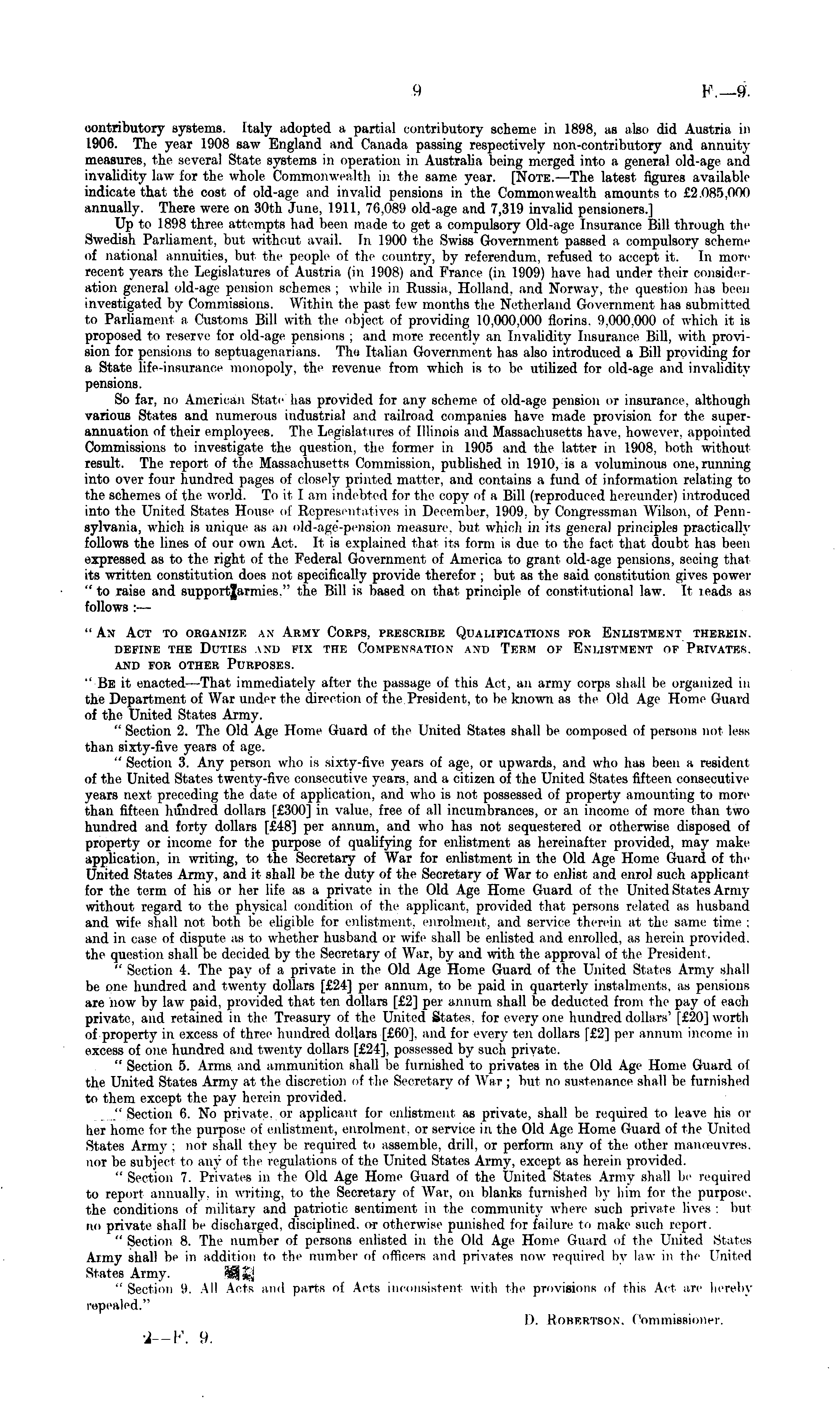 contributory systems. Italy adopted a partial contributory scheme in 1898, as also did Austria in 1906. The year 1908 saw England and Canada passing respectively non-contributory and annuity measures, the several State systems in operation in Australia being merged into a general old-age and invalidity law for the whole Commonwealth in the same year. [Note. —The latest figures available indicate that the cost of old-age and invalid pensions in the Commonwealth amounts to £2.085,000 annually. There were on 30th June, 1911, 76.089 old-age and 7,319 invalid pensioners.] Up to 1898 three attempts had been made to get a compulsory Old-age Insurance Bill through the Swedish Parliament, but without avail. In 1900 the Swiss Government passed a compulsory scheme of national annuities, hut the people of tin- country, by referendum, refused to accept it. In more recent years the Legislatures of Austria (in 1908) and France (in 1909) have had under their consideration general old-age pension schemes ; while in Russia.. Holland, and Norway, the question has been investigated by Commissions. Within the past few months the Netherland Government has submitted to Parliament a Customs Bill with the object of providing 10,000,000 florins. 9.000.000 of which it is proposed to reserve for old-age pensions ; and more recently an Invalidity Insurance Bill, with provision for pensions to septuagenarians. Tho Italian Government has also introduced a Bill providing for a State life-insurance monopoly, the revenue from which is to be utilized for old-age and invalidity pensions. So far, no American State has provided for any scheme of old-age pension or insurance, although various States and numerous industrial and railroad companies have made provision for the superannuation of their employees. The Legislatures of Illinois and Massachusetts have, however, appointed Commissions to investigate the question, the former in 1905 and the latter in 1908. both without result. The report of the Massachusetts Commission, published in 1910, is a voluminous one, running into over four hundred pages of closely printed matter, and contains a fund of information relating to the schemes of the world. To it lam indebted for the copy of a Bill (reproduced hereunder) introduced into the United States House of Representatives in December, 1909. by Congressman Wilson, of Pennsylvania, which is unique as an old-age-pension measure, but which in its genera! principles practically follows the lines of our own Act. It is explained that its form is due to the fact that doubt has been expressed as to the right of the Federal Government of America to grant old-age pensions, seeing that its written constitution does not specifically provide therefor ; but as the said constitution gives power "to raise and support|armies." the Bill is based on that principle of constitutional law. It leads as follows :— "An Act to organizk ax Army Corps, prescribe Qualifications for Enlistment therein. define the Duties and fix the Compensation ami Term of Enlistment of Privates. and for other purposes. " Be it enacted —That immediately after the passage of this Act, an army corps shall be organized in the Department of War under the direction of the President, to be known as the Old Age Home Guard of the United States Army. " Section 2. The Old Age Home Guard of the United States shall be composed of persons not less than sixty-five years of age. " Section 3. Any person who is sixty-five years of age, or upwards, and who has been a resident of the United States twenty-five consecutive years, and a citizen of the United States fifteen consecutive years next preceding the date of application, and who is not possessed of property amounting to more than fifteen hundred dollars [£300] in value, free of all incumbrances, or an income of more than two hundred and forty dollars [£48] per annum, and who has not sequestered or otherwise disposed of property or income for the purpose of qualifying for enlistment as hereinafter provided, may make application, in writing, to the Secretary of War for enlistment in the Old Age Home Guard of the United States Army, and it shall be the duty of the Secretary of War to enlist and enrol such applicant for the term of his or her life as a private in the Old Age Home Guard of the United States Army without regard to the physical condition of the applicant, provided that persons related as husband and wife shall not both be eligible for enlistment, enrolment, and service therein at the same time ; and in case of dispute as to whether husband or wife shall be enlisted and enrolled, as herein provided, the question shall be decided by the Secretary of War, by and with the approval of the President. " Section 4. The pay of a private in the Old Age Home Guard of the United States Army Bhall be one hundred and twenty dollars [£24] per annum, to be paid in quarterly instalments, as pensions are now by law paid, provided that ten dollars [£2] per annum shall be deducted from the pay of each private, and retained in the Treasury of the United States, for every one hundred dollars' [£20] worth of property in excess of three hundred dollars [£60]. and for every ten dollars [£2] per annum income in excess of one hundred and twenty dollars [£24], possessed by such private. " Section 5. Arms and ammunition shall be furnished to privates in the Old Age Home Guard of the United States Army at the discretion of the Secretary of War ; but no sustenance shall be furnished to them except the pay herein provided. " Section 6. No private, or applicant for enlistment as private, shall be required to leave his or her home for the purpose of enlistment, enrolment, or service in the Old Age Home Guard of the United States Army ; nor shall they be required to assemble, drill, or perform any of the other manoeuvres, nor be subject to any of the regulations of the United States Army, except as herein provided. "Section 7. Privates in the Old A