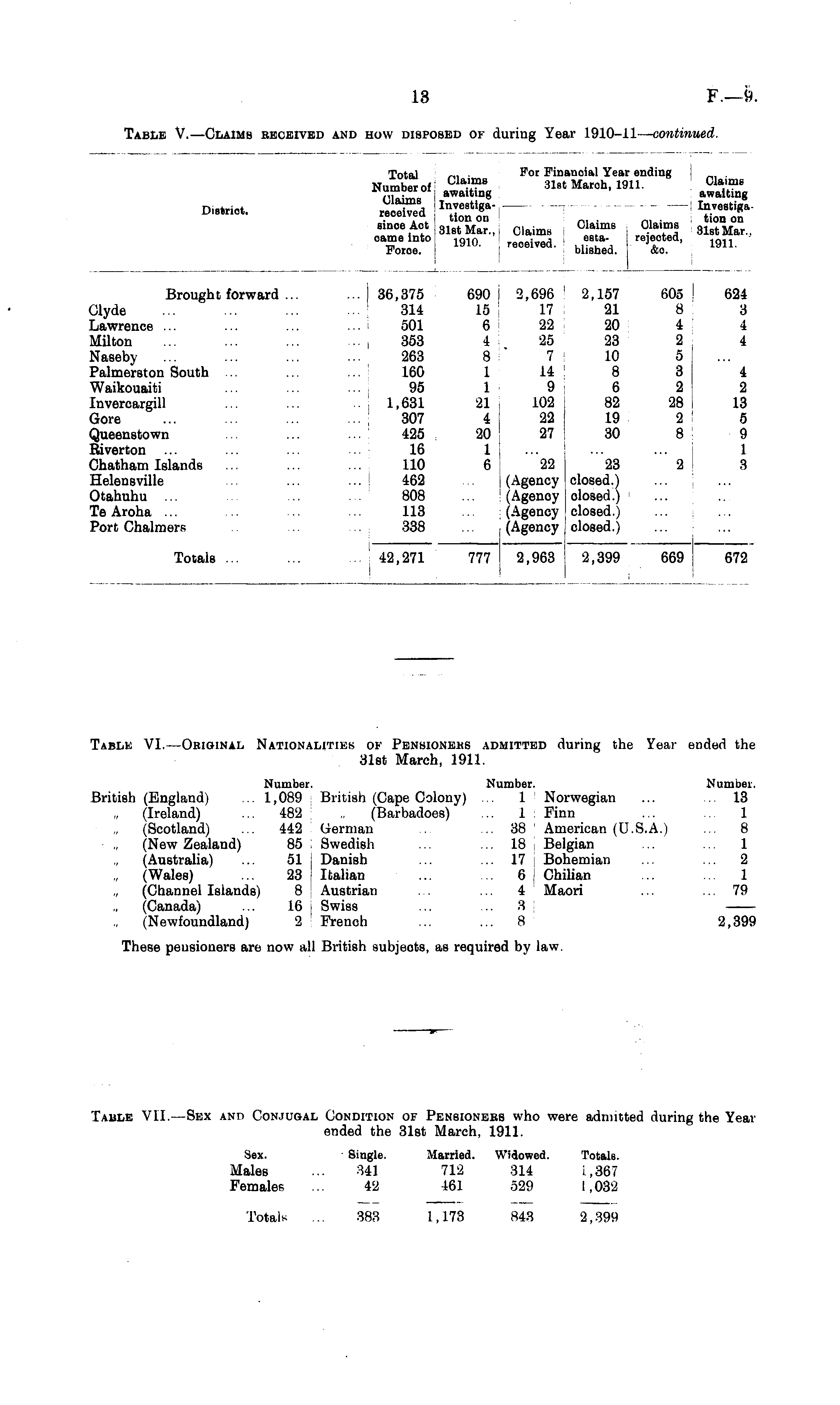 Table Vll.—Sex and Conjugal Condition of Pensioners who were admitted during the Year ended the 31st March, 1911. Sex. ■ Single. Married. Widowed. Totals. Males ... 341 712 314 1,367 Females ... 42 461 529 1,032 Totals ... 383 1,173 843 2,399