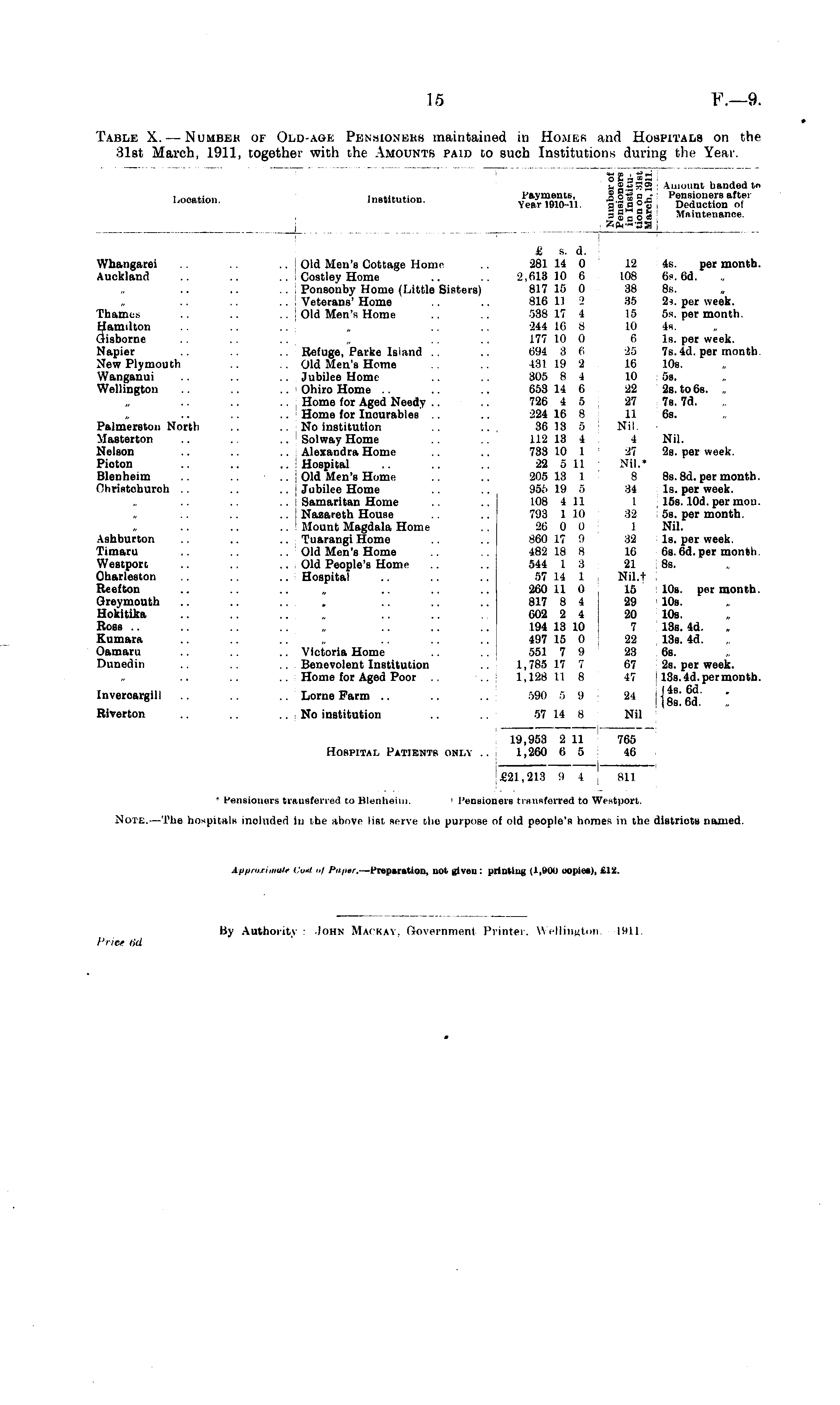 * Pensioners transferred to Blenheim. ' Pensioners trmißferred to Westport. Note.—The hospitals included in the above list serve the purpose of old people's homes in the districts named. Approximate ( of t'<it>*f. — Preparation, uot tpveu : printing 11,900 copies), £12. By Authority : John Mackay, Government Printer, Wellington. 1911 I'rier lid