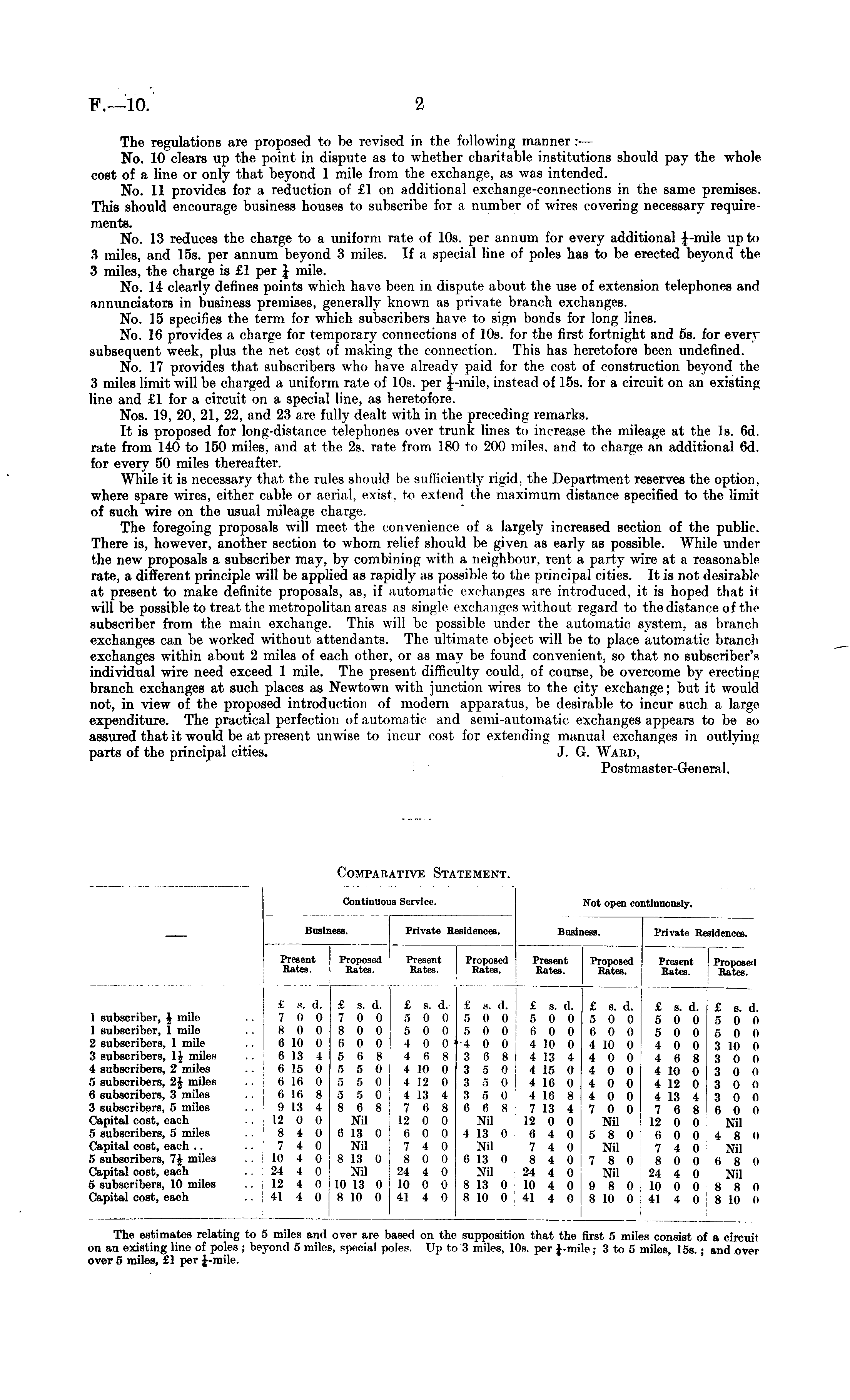 Continuoi is Service. Not open coi ltinuously. Business. Private Residences. Business. Private Residences. Present Rates. Proposed Rates. Present Rates. Proposed Rates. Present Proposed Rates. Rates. Present Proposed Rates. : Rates. 1 subscriber, \ mile 1 subscriber, 1 mile 2 subscribers, 1 mile 3 subscribers, \\ miles 4 subscribers, 2 miles 5 subscribers, 2£ miles 6 subscribers, 3 miles 3 subscribers, 5 miles Capital cost, each 5 subscribers, 5 miles Capital cost, each .. 5 subscribers, 7J miles Capital cost, each 5 subscribers, 10 miles Capital cost, each £ s. d. 7 0 0 8 0 0 6 10 0 6 13 4 6 15 0 6 16 0 8 Iβ 8 9 13 4 12 0 0 8 4 0 7 4 0 Iβ 4 0 24 4 0 12 4 0 41 4 0 £ s. d. 7 0 0 8 0 0 6 0 0 5 6 8 5 5 0 5 5 0 5 5 0 8 0 8 Nil 0 13 0 Nil 8 18 0 Nil 10 13 0 8 10 0 £ s. d, 5 0 0 5 0 0 4 0 0 4 6 8 4 10 0 4 12 0 4 13 4 7 6 8 12 0 0 6 0 0 7 4 0 8 0 0 24 4 0 10 0 0 41 4 0 £ s. d. 5 0 0 5 0 0 •4 0 0 3 6 8 :i r> o 3 r> 0 3 5 0 6 6 8 Nil 4 13 0 Nil 0 13 0 Nil 8 13 0 8 10 0 £ s. (1. 5 0 0 6 0 0 4 10 0 4 13 4 4 15 0 4 16 0 4 16 8 7 13 4 12 0 0 6 4 0 7 4 0 8 4 0 24 4 0 10 4 0 41 4 0 £ s. d. 5 0 0 6 0 0 4 10 0 4 0 0 4 0 0 4 0 0 4 0 0 7 0 0 Nil 5 8 0 Nil 7 8 0 Nil 9 8 0 8 10 0 £ s. d. 5 0 0 5 0 0 4 0 0 4 6 8 4 10 0 4 12 0 4 13 4 7 6 8 12 0 0 6 0 0 7 4 0 8 0 0 24 4 0 10 0 0 4] 4 0 £ s. d. 5 0 0 5 0 0 3 10 0 3 0 0 3 0 0 3 0 (I 3 0 0 6 0 0 Nil 4 8 II Nil 6 8 0 Nil 8 8 <» 8 10 0