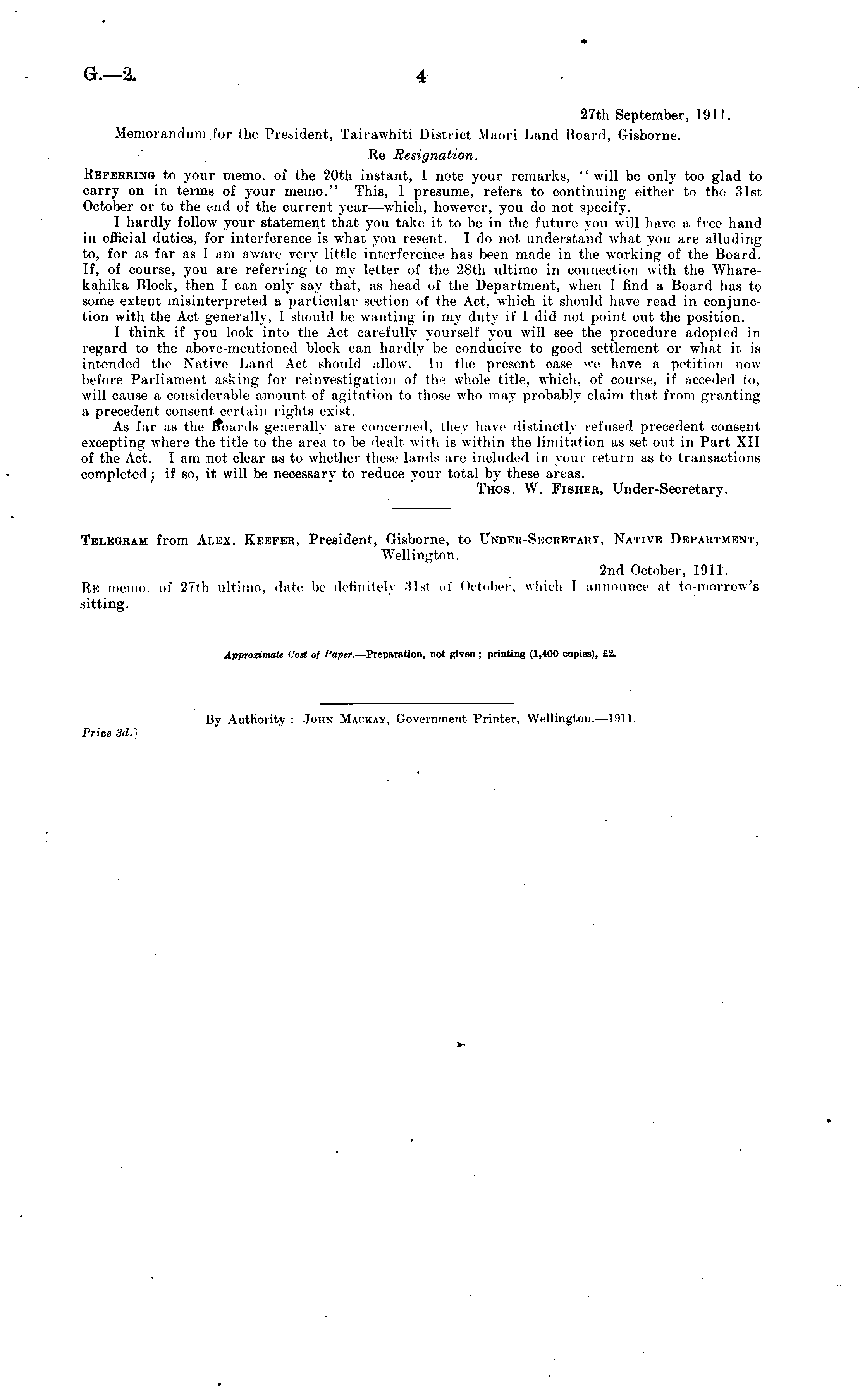 27th September, 1!) 11. Memorandum for the President, Tairawhiti District Maori Land Board, Gisborne. Re Resignation. Referring to your memo, of the 20th instant, I note your remarks, " will be only too glad to carry on in terms of your memo." This, I presume, refers to continuing either to the 31st October or to the c-nd of the current year— which, however, you do not specify. I hardly follow your statement that you take it to be in the future yon will have a free hand in official duties, for interference is what you resent. Ido not understand what you are alluding to, for as far as I am aware very little interference has been made in the working of the Board. If, of course, you are referring to my letter of the 28th ultimo in connection with the Wharekahika Block, then I can only say that, as head of the Department, when I find a Board lias to some extent misinterpreted a particular section of the Act, which it should have read in conjunction with the Act generally, I should be wanting in my duty if I did not point out the position. 1 think if you look into the Act can fully yourself you will see the procedure adopted in regard to the above-mentioned block can hardly be conducive to good settlement or what it is intended the Native Land Act should allow. In the present case we have a petition now before Parliament asking for reinveetigation of the whole title, which, of course, if acceded to, will cause a considerable amount of agitation to those who may probably claim thai from granting a precedent consent certain rights exist. As far as the Boards generally are concerned, they have distinctly refused precedent consent excepting where the title to the area to be dealt with is within the limitation as set out in Part XII of the Act. I am not clear as to whether these lands are included in your return as to transactions completed; if so, it will be necessary to reduce your total by these areas. Thos. W. Fisher, Under-Secretary. Telegram from Alex. Keeper, President, Gisborne, to Undfh-Secretady, Native Depaetment, Wellington. 2nd October, 1011. Rβ memo, of 27th ultimo, date !«• definitely .'ilst of October, which 1 announce at to-morrow's sitting. Afuproxinuite tost of I'aper.— Preparation, not tfiveu : printing (1,400 copies), £2.
