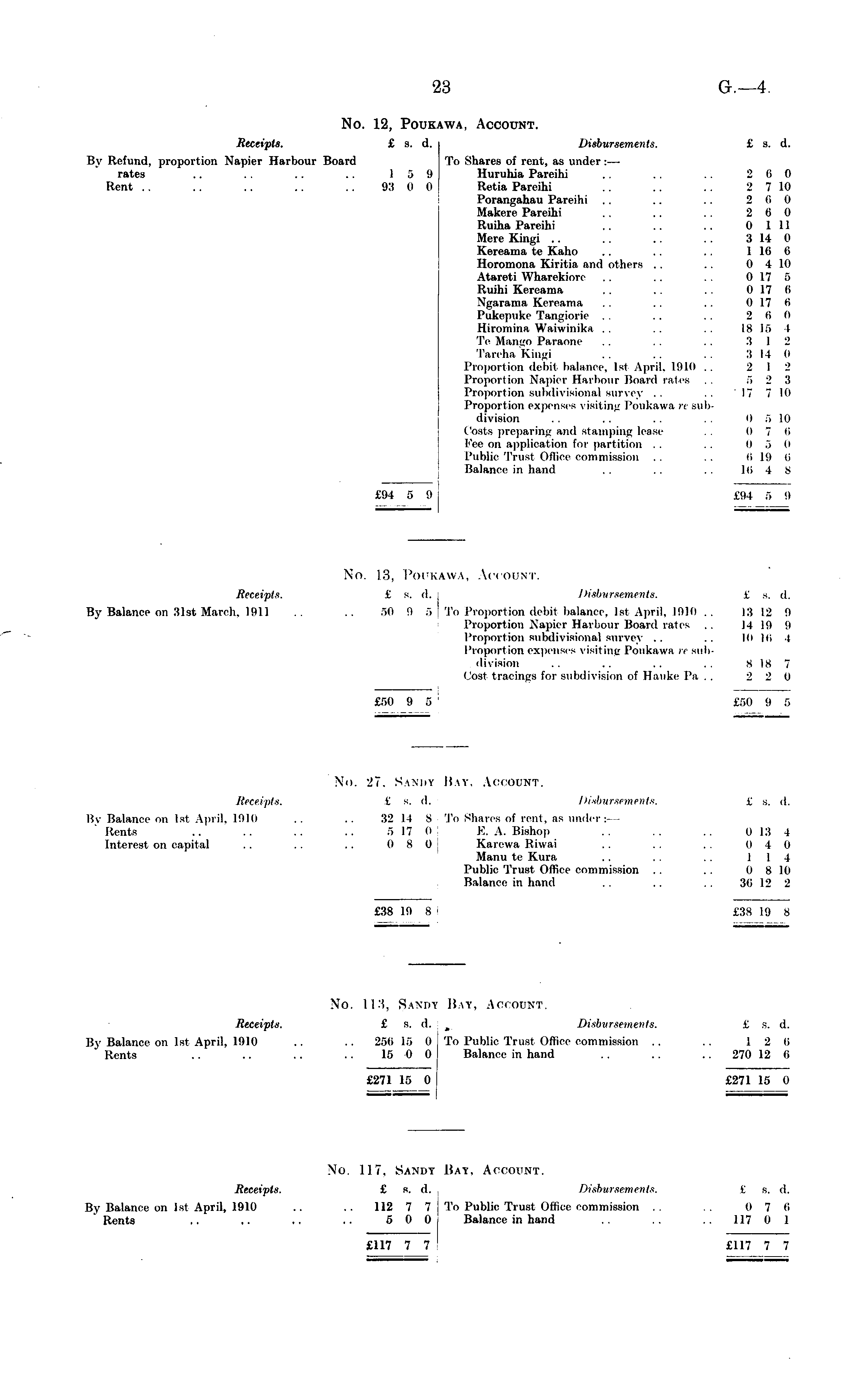 No. 27, Sandy Bat, Account. Receipts. £ s. d. Disbursements. £ s. d. H\ Balance on Ist April, 1910 .. .. 32 14 8 To Shares of rent, as under : Rente .. .. .. .. 517 0 E. A. Bishop .. .. .. 013 4 Interest on capital .. .. .. 0 S 0 Karewa EUwai .. .. .. o 4 0 .Mann te Kura . . . . . . 114 Public Trust Office commission .. .. 0 8 10 Balance in hand . . . . . . 36 12 2 £38 l!i 8 £38 19 8 Xo. 113, Sandy Bat, Account. Receipts. £ s. d. Disbursements. £ s. d. By Balance on Ist April, 1910 .. .. 256 15 0 To Public Trust Offioe commission .. .. 12 6 Rents .. .. .. .. 15 0 0 Balance in hand .. . . .. 270 12 6 £271 15 0 £271 15 0 No. 117. Sandy Hay. Account. Receipts. £ s. d. . Disbursements. £ s. d. By Balance on Ist April, 1910 .. .. 112 7 7j To Public Trust Office commission .. .. (17 6 Rents .. .. .. .. 5 0 0 Balance in hand .. .. .. 117 0 1 £117 7 7 £117 7 7