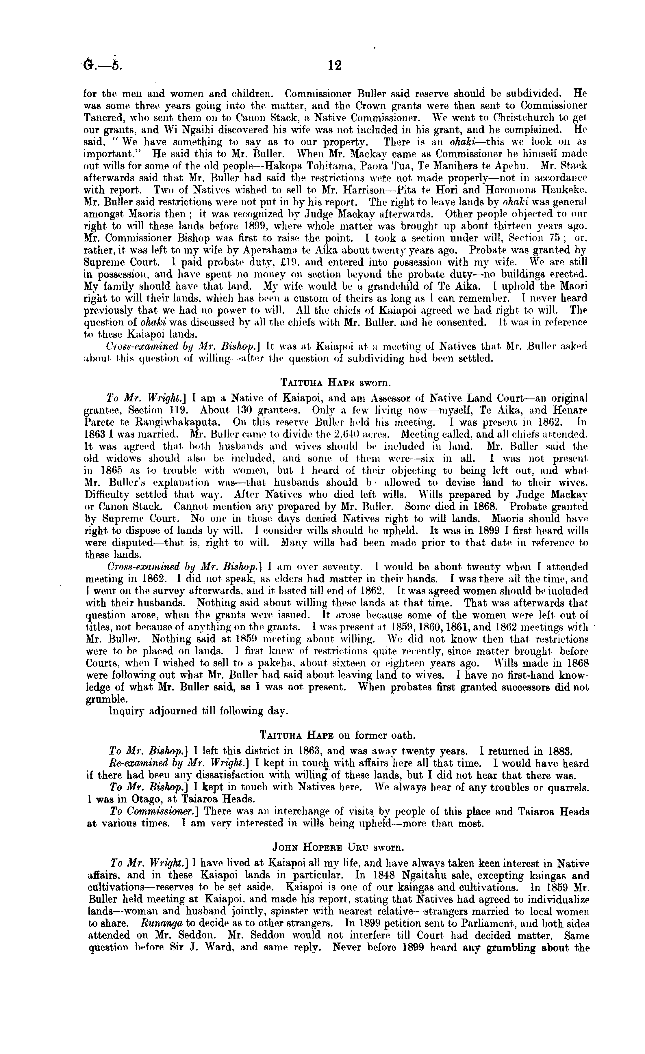 for the men and women and children. Commissioner Buller said reserve should be subdivided. He was some three years going into the matter, and the Crown grants were then sent to Commissioner Tanered. who scut them on to Canon Stack, a Native Commissioner. We went to Christchurch to gel our grants, and Wi Ngailii discovered his wife was not included in his grant, and he complained. He said. "We have something to say as to our property. There is an ohaki —this we look on as important." He said this to Mr. Buller. When Mr. Mackay came as Commissioner he himself made out wills for some of flic old people-Hakopa Tohitama, Paora Tua, Tβ Manihera te Apehu. Mr. Shirk afterwards said that Mr. Buller had said the restrictions were not made properly—not in accordance with report.. Two of Natives wished to sell to Mr. Harrison -Pita te Hori and Horomona Haukeke. Mr. Buller said restrictions were not put in by his report. The right to leave lands by ohaki was general amongst Maoris then :it was recognized by Judge Mackay afterwards. Other people objected to our right to will these lands before 1899, where whole matter was brought up about thirteen years ago. Mr. Commissioner Bishop was first bo raise the point. I took a section under will, Section 75; or, rather, it was left to my wife by Aperahama te Aika about twenty years ago. Probate was granted by Supreme Court. 1 paid probate duty. £19, and entered into possession with my wife. We are still in possession, and have .spent no money on section beyond the probate, duty- —-no buildings erected. My family should have that land. My wife would be a grandchild of Te Aika. I uphold the Mann right to will their lands, which has been a custom of theirs as long as I can remember. 1 never heard previously that we had no power to will. All the chiefs of Kaiapoi agreed we had right to will. The question of ohaki was discussed by all the chiefs with Mr. Buller. and he consented. It was in reference to these Caiapoi lands. Cross examined by Mr. Bishop.] It was at Kaiapoi at a meeting of Natives that Mr. Buller asked about I his question of willing after (he question of subdividing had been settled. Taituha Hape sworn. To Mr. Wright.] I am a Native of Kaiapoi, and am Assessor of Native Land Court —an original grantee. Section 119. About 130 grantees. Only a lew living now —myself, Te Aika, and Henare Parete te Rangiwhakaputa. On this reserve Bulk] held bis meeting. 1 was present in 1862. In IBii:i I was married. Mr. Buller came to divide the 2 3 640 acres. Meeting called, and all chiefs attended. It was agreed that belli husbands and wives should lie included in land. Mr. Buller said the old widows should also lie included, and some of them were -six in all. I was not present in IS(i."i as to trouble with women, but 1 heard of their objecting to being left out. and what Mr. Buller's explanation was-—that husbands should l> allowed to devise land to their wives. Difficulty settled thai way. After Natives who died led wills. Wills prepared by Judge Mackay or Canon Stack. Cannot mention any prepared by Mr. Buller. Some died in 1868. Probate granted by Supreme Court. No one in those days denied Natives right to will lands. Maoris should have right to dispose of lands by will. I consider wills should be upheld. It was in 1899 I firsl heard wills were disputed- that is. right to will. Many wills had been made prior to that date in reference to these lands. Cross-examined l>ti Mr. Bishop,] I am over seventy. I would be about twenty when I attended meeting in 1862. I did not speak, as elders had matter in their hands. I was there all the time, and I went on the survey afterwards, and it lasted till end of 1862. It was agreed women should be included with their husbands. Nothing said about willing these lands at that time. That was afterwards that question arose, when the grants were issued. It arose because some of the women were left out ol titles, not because of anything on the grants. I was present at 1859, 1860,1861, and [M' 2 meetings with Mr. Buller. Nothing said at 1859 meeting about willing. We did not know then that restrictions were to be placed on lands. I first knew of restrictions quite recently, since matter brought before Courts, when 1 wished to sell to a pakeha. about sixteen or eighteen years ago. Wills made in 1868 were following out what Mr. Buller had said about leaving land to wives. I have no first-hand knowledge of what Mr. Buller said, as I was not present. When probates first granted successors did not grumble. Inquiry adjourned till following day. Taituha Hape on former oath. To Mr. Bislwp.] 1 left this district in 1863. and was away twenty years. 1 returned in 1883. Re-examined by Mr. Wright] I kept in touch with affairs here all that time. I would have heard if there had been any dissatisfaction with willing of these lands, but I did not hear that there, was. To Mr. Bishop.] I kept in touch with Natives here. We always hear of any troubles or quarrels. I was in Otago, at Taiaroa Heads. To Commissioner.] There was an interchange of visits by people of this place and Taiaroa Heads at various times. I am very interested in wills being upheld—more than most. John Hopere Uru sworn. To Mr. Wright.] 1 have lived at Kaiapoi all my life, and have always taken keen interest in Native affairs, and in these Kaiapoi lands in particular. In 18-18 Ngaitahu sale, excepting kaingas and cultivations —reserves to be set aside. Kaiapoi is one of our kaingas and cultivations. In 1859 Mr. Buller held meeting at Kaiapoi. and made his report, stating that Natives had agreed to individualize lands —woman and husband jointly, spinster with nearest relative- —strangers married to local women to share. Runanga to decide as to other strangers. In 1899 petition sent to Parliament, and both sides attended on Mr. Seddon. Mr. Seddon would not interfere till Court had decided matter. Same question before Sir J. Ward, and same reply. Never before 1899 hear