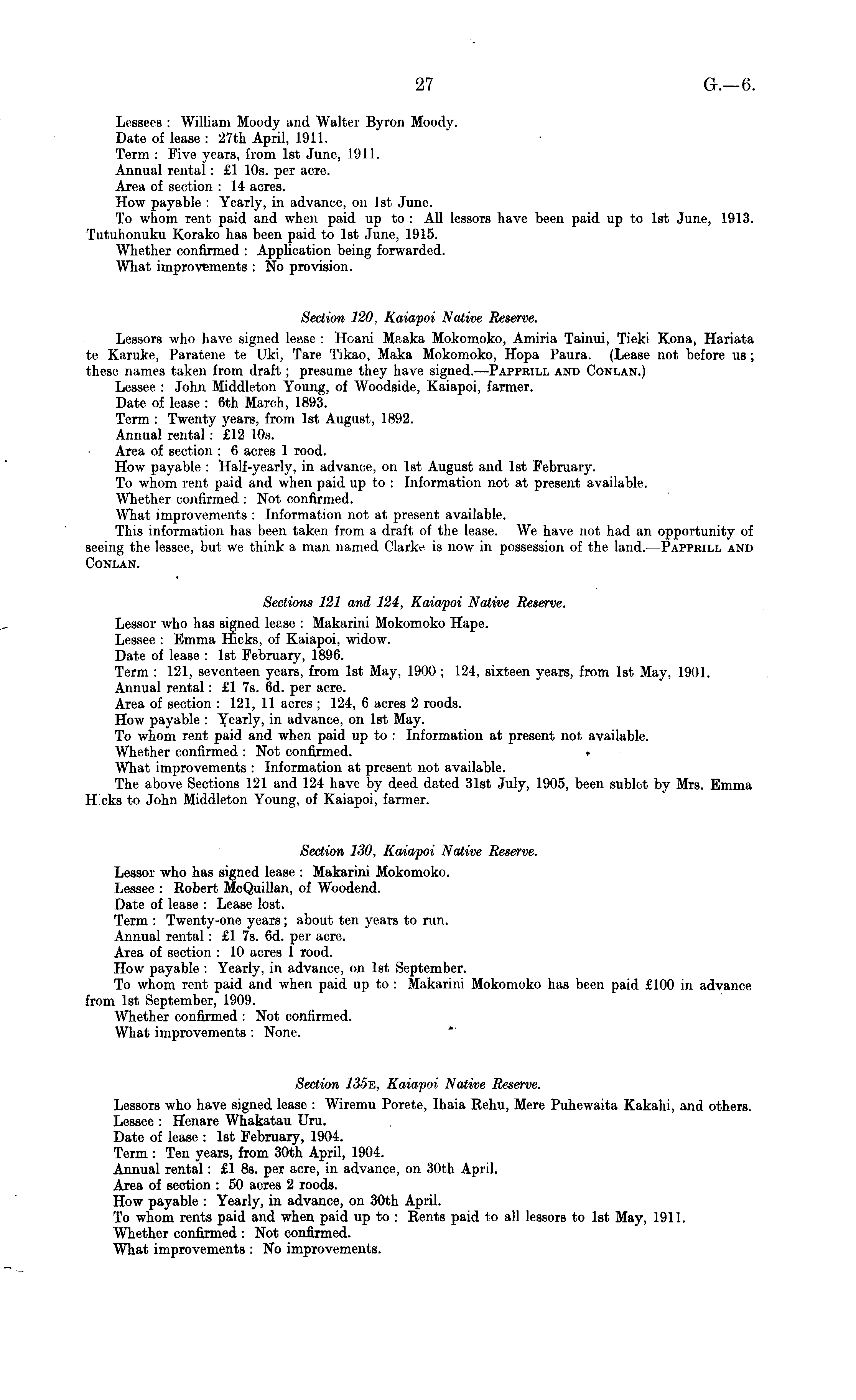 Lessees : William Moody and Walter Byron Moody. Date of lease : 27th April, 1911. Term : Five years, from Ist June, 1911. Annual rental : £1 10s. per acre. Area of section : 14 acres. How payable : Yearly, in advance, on Ist June. To whom rent paid and when paid up to : All lessors have been paid up to Ist June, 1913. Tutuhonuku Korako has been paid to Ist June, 1915. Whether confirmed : Application being forwarded. What improvements : No provision. Section 120, Kaiapoi Native Reserve. Lessors who have .signed lease : Hoani Maaka Mokomoko, Amiria Tainui, Tieki Kona, Hariata te Karukc, Paratene te Uki, Tare Tikao, Maka Mokomoko, Hopa Paura. (Lease not before us; these names taken from draft ; presume they have signed. —-Papprill and Conlan.) Lessee : John Middleton Young, of Woodside, Kaiapoi, farmer. Date of lease : 6th March, 1893. Term : Twenty years, from Ist August, 1892. Annual rental : £12 10s. Area of section : 6 acres 1 rood. How payable : Half-yearly, in advance, on Ist August and Ist February. To whom rent paid and when paid up to : Information not at present available. Whether confirmed : Not confirmed. What improvements : Information not at present available. This information lias been taken from a draft of the lease. We have not had an opportunity of seeing the lessee, but we think a man named Clarke is now in possession of the land. —Papprill and Conlan. Sections 121 and 124, Kaiapoi Native Reserve. Lessor who has signed lease : Makarini Mokomoko Hape. Lessee : Emma Hicks, of Kaiapoi, widow. Date of lease : Ist February, 1896. Term : 121, seventeen years, from Ist May, 1900 ; 124, sixteen years, from Ist May, 1901. Annual rental : £1 7s. 6d. per acre. Area of section : 121, 11 acres ; 124, 6 acres 2 roods. How payable : Yearly, in advance, on Ist May. To whom rent paid and when paid up to : Information at present not available. Whether confirmed : Not confirmed. What improvements : Information at present not available. The above Sections 121 and 124 have by deed dated 31st July, 1905, been sublet by Mrs. Emma H cks to John Middleton Young, of Kaiapoi, farmer. Section 130, Kaiapoi Native Reserve. Lessor who has signed lease : Makarini Mokomoko. Lessee : Robert McQuillan, of Woodend. Date of lease : Lease lost. Term : Twenty-one years; about ten years to run. Annual rental : £1 7s. 6d. per acre. Area of section : 10 acres 1 rood. How payable : Yearly, in advance, on Ist September. To whom rent paid and when paid up to : Makarini Mokomoko has been paid £100 in advance from Ist September, 1909. Whether confirmed : Not confirmed. What improvements : None. Section 135e, Kaiapoi Native Reserve. Lessors who have signed lease : Wiremu Porete, Ihaia Rehu, Mere Puhewaita Kakahi, and others. Lessee : Henare Whakatau Uru. Date of lease : Ist February, 1904. Term : Ten years, from 30th April, 1904. Annual rental: £1 Bs. per acre, in advance, on 30th April. Area of section : 50 acres 2 roods. How payable : Yearly, in advance, on 30th April. To whom rents paid and when paid up to : Rents paid to all lessors to Ist May, 1911. Whether confirmed : Not confirmed. What improvements : No improvements.