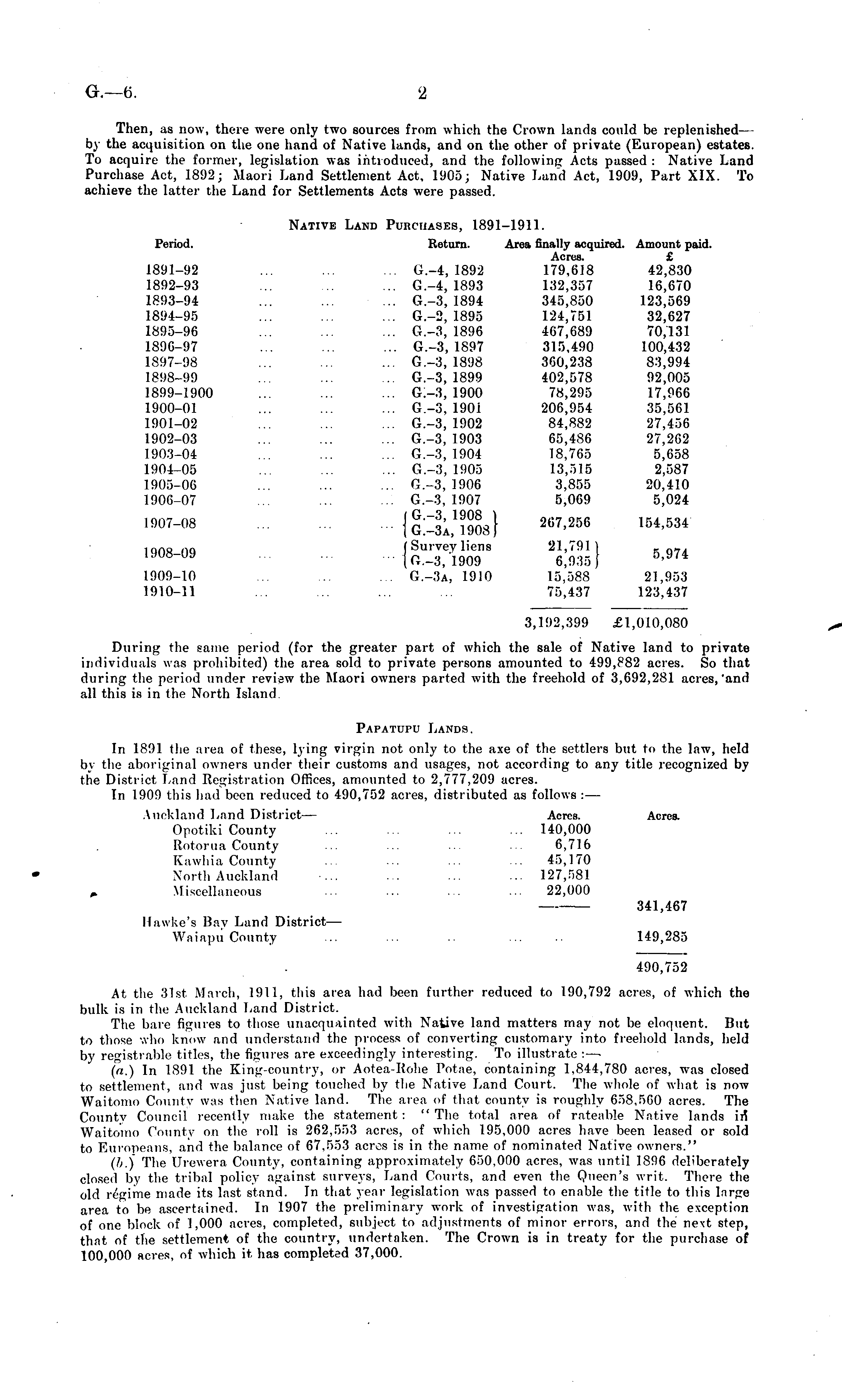 Then, as now, there were only two sources from which the Crown lands could be replenished— by the acquisition on the one hand of Native lands, and on the other of private (European) estates. To acquire the former, legislation was introduced, and the following Acts passed : Native Land Purchase Act, 1892; Maori Land Settlement Act, 1905; Native Land Act, 1909, Part XIX. To achieve the latter the Land for Settlements Acts were passed. Native Land Purchases, 1891-1911. Period. Return. Area finally acquired. Amount paid. Acres. £ 1891-92 ... ... ... G.-4, 1892 179,618 42,830 1892-93 ... ... ... G.-4, 1893 132,357 16,670 1893-94 ... ... ... G.-3, 1894 345,850 123,569 1894-95 ... ... ... G.-2, 1895 124,751 32,627 1895-96 ... ... ... G.-3, 1896 467,689 70,131 1896-97 ... ... ... G.-3, 1897 315,490 100,432 1897-98 ... ... ... G.-3, 1898 360,238 83,994 1898-99 ... ... ... G.-3, 1899 402,578 92,005 1899-1900 ... ... ... G:-3, 1900 78,295 17,966 1900-01 ... ... ... G.-o, 190 i 206,954 35,561 1901-02 ... ... ... G.-3, 1902 84,882 27,456 1902-03 ... ... ... G.-3, 1903 65,486 27,262 1903-04 ... ... ... G.-3, 1904 18,765 5,658 1904-05 ... ... ... G.-3, 1905 13,515 2,587 1905-06 ... ... ... G.-3, 1906 3,855 20,410 1906-07 ... ... G.-3, 1907 5,069 5,024 1907-08 ... ... ... 267,256 154,534 1908-09 Survey liens 21,791) y 6 (G.-3, 1909 6,935) °' J ' 4 1909-10 ... ... G.-3a, 1910 15,588 21,953 1910-11 ... ... ... ... 75,437 123,437 3,192,399 £1,010,080