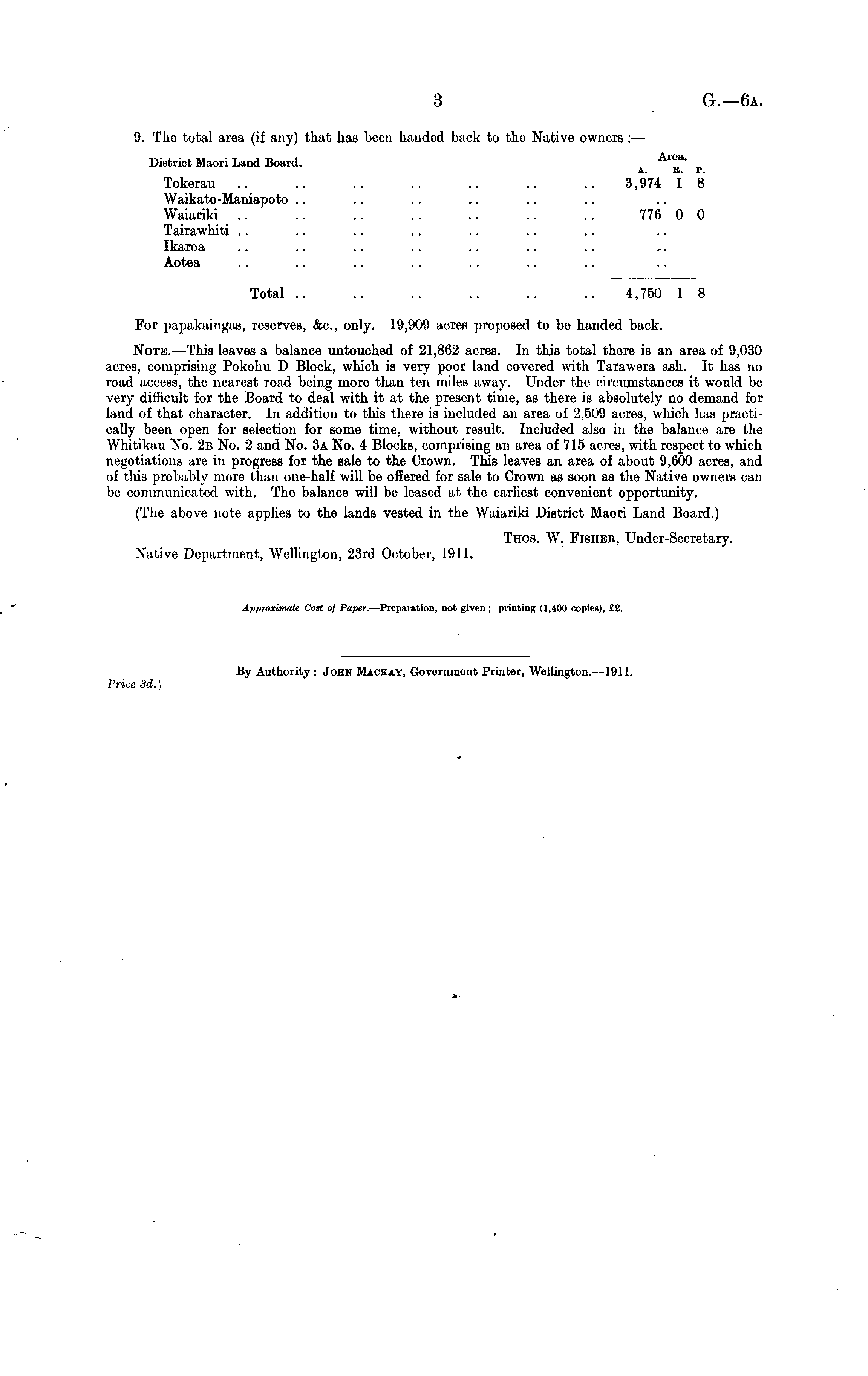 For papakaingas, reserves, &c, only. 19,909 acres proposed to be handed hack. Note.—This leaves a balance untouched of 21,862 acres. In this total there is an area of 9,030 acres, comprising Pokohu D Block, which is very poor land covered with Tarawera ash. It has no road access, the nearest road being more than ten miles away. Under the circumstances it would be very difficult for the Board to deal with it at the present time, as there is absolutely no demand for land of that character. In addition to this there is included an area of 2,509 acres, which has practically been open for selection for some time, without result. Included also in the balance are the Whitikau No. 2b No. 2 and No. 3a No. 4 Blocks, comprising an area of 715 acres, with respect to which negotiations are in progress for the sale to the Crown. This leaves an area of about 9,600 acres, and of this probably more than one-half will be offered for sale to Crown as soon as the Native owners can be communicated with. The balance will be leased at the earliest convenient opportunity. (The above note applies to the lands vested in the Waiariki District Maori Land Board.) Thos. W. Fisher, Under-Secretary. Native Department, Wellington, 23rd October, 1911. A/'/irorimate Cost of Paper. —Preparation, not given ; printing (1,400 copies), £2.