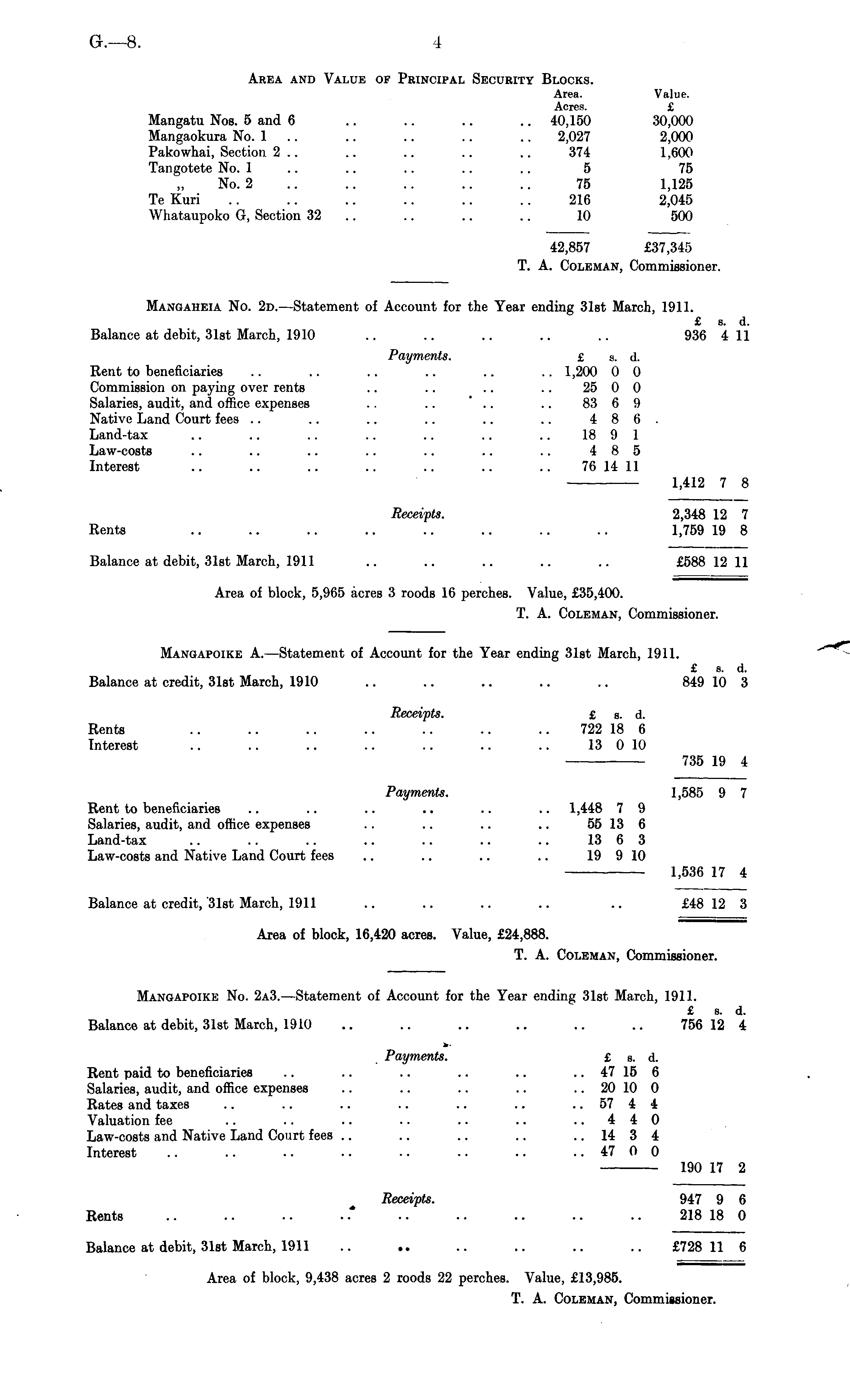 Area and Value of Principal Security Blocks. Area. Value. Acres. £ Mangatu Nos. 5 and 6 .. .. .. .. 40,150 30,000 Mangaokura No. 1 .. .. .. .. .. 2,027 2,000 Pakowhai, Section 2 .. .. .. .. .. 374 1,600 Tangotete No. 1 .. .. .. .. .. 5 75 No. 2 .. .. .. .. .. 75 1,125 Te Kuri .. .. .. .. .. .. 216 2,045 Whataupoko G, Section 32 .. .. .. 10 500 42,857 £37,345 T. A. Coleman, Commissioner. Mangaheia No. 2d. —Statement of Account for the Year ending 31st March, 1911. £ s. d. Balance at debit, 31st March, 1910 .. .. .. .. .. 936 4 11 Payments. £ s. d. Rent to beneficiaries .. .. .. .. .. .. 1,200 0 0 Commission on paying over rents .. .. .. .. 25 0 0 Salaries, audit, and office expenses . . .. ' .. .. 83 6 9 Native Land Court fees .. .. .. .. .. .. 486. Land-tax .. .. .. .. .. .. .. 18 9 1 Law-costs .. .. .. .. .. .. .. 485 Interest .. .. .. .. .. .. .. 76 14 11 1,412 7 8 Receipts. 2,348 12 7 Rents .. .. .. .. .. .. .. .. 1,759 19 8 Balance at debit, 31st March, 1911 .. .. .. .. .. £588 12 11 Area of block, 5,965 acres 3 roods 16 perches. Value, £35,400. T. A. Coleman, Commissioner. Mangapoike A. —Statement of Account for the Year ending 31st March, 1911. fc s. d. Balance at credit, 31st March, 1910 .. .. .. .. .. 849 10 3 Receipts. £ s. d. Rents .. .. .. .. .. .. .. 722 18 6 Interest .. .. .. .. .. .. .. 13 0 10 735 19 4 Payments. 1,585 9 7 Rent to beneficiaries .. .. .. .. .. .. 1,448 7 9 Salaries, audit, and office expenses . . .. .. .. 55 13 6 Land-tax .. .. .. .. .. .. .. 13 6 3 Law-costs and Native Land Court fees .. .. .. .. 19 9 10 1,536 17 4 Balance at credit,'3lst March, 1911 .. .. .. .. .. £48 12 3 Area of block, 16,420 acres. Value, £24,888. T. A. Coleman, Commissioner. Mangapoike No. 2a3. —Statement of Account for the Year ending 31st March, 1911. £ s. d. Balance at debit, 31st March, 1910 .. .. .. .. .. .. 756 12 4 Payments. £ s. d. Rent paid to beneficiaries .. .. .. .. .. .. 47 15 6 Salaries, audit, and office expenses .. .. .. .. .. 20 10 0 Rates and taxes .. .. .. .. .. .. .. 57 4 4 Valuation fee .. .. .. .. .. .. ..440 Law-costs and Native Land Court fees .. .. .. .. .. 14 3 4 Interest .. .. .. .. .. .. .. .. 47 0 0 190 17 2 Receipts. 947 9 6 Rents .. .. .. . * • • • • •. •. .. 218 18 0 Balance at debit, 31st March, 1911 .. .. .. .. .. .. £728 11 6 Area of block, 9,438 acres 2 roods 22 perches. Value, £13,985. T. A. Coleman, Commissioner.