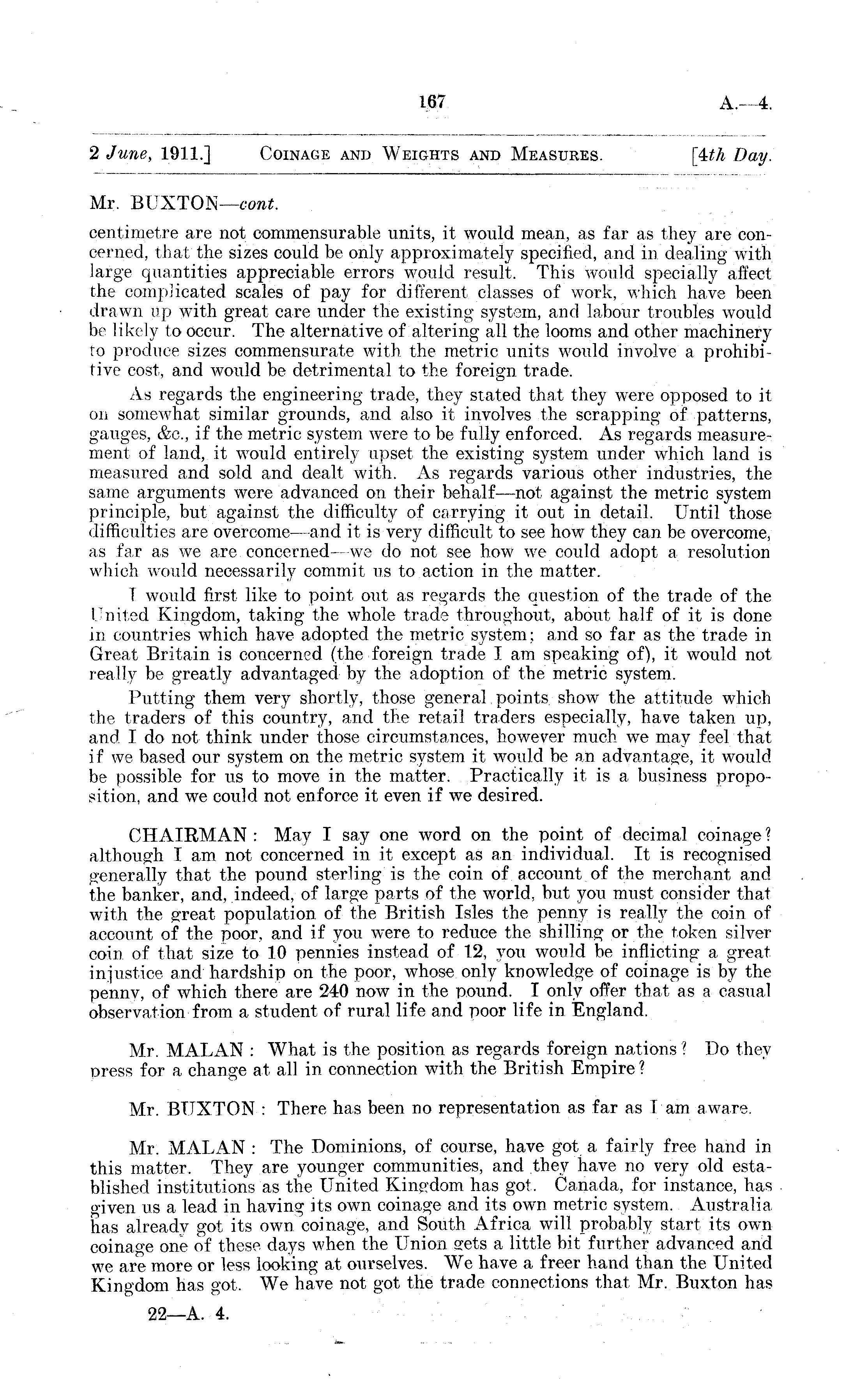 2 June, 1911.] Coinage and Weights and Measures. [Uh Day. Mr. BUXTON— cont. centimetre are not commensurable units, it would mean, as far as they are concerned, that the sizes could be only approximately specified, and in dealing with large quantities appreciable errors would result. This would specially affect the complicated scales of pay for different classes of work, which have been drawn up with great care under the existing system, and labour troubles would be likely to occur. The alternative of altering all the looms and other machinery to produce sizes commensurate with the metric units would involve a prohibitive cost, and would be detrimental to the foreign trade. As regards the engineering trade, they stated that they were opposed to it on somewhat similar grounds, and also it involves the scrapping of patterns, gauges, &c, if the metric system were to be fully enforced. As regards measurement of land, it would entirely upset the existing system under which land is measured and sold and dealt with. As regards various other industries, the same arguments were advanced on their behalf —not against the metric system principle, but against the difficulty of carrying it out in detail. Until those difficulties are overcome— -and it is very difficult to see how they can be overcome, as far as we are concerned —we do not see how we could adopt a resolution which would necessarily commit us to action in the matter. I would first like to point out as regards the Question of the trade of the United Kingdom, taking the whole trade throughout, about half of it is done in countries which have adopted the metric system; and so far as the trade in Great Britain is concerned (the foreign trade I am speaking of), it would not really be greatly advantaged by the adoption of the metric system. Putting them very shortly, those general points show the attitude which the traders of this country, and the retail traders especially, have taken up, and I do not think under those circumstances, however much we may feel that if we based our system on the metric system it would be an advantage, it would be possible for us to move in the matter. Practically it is a business proposition, and we could not enforce it even if we desired. CHAIRMAN : May I say one word on the point of decimal coinage? although lam not concerned in it except as an individual. It is recognised generally that the pound sterling is the coin of account of the merchant and the banker, and, indeed, of large parts of the world, but you must consider that with the great population of the British Isles the penny is really the coin of account of the poor, and if you were to reduce the shilling or the token silver coin of that size to 10 pennies instead of 12, you would be inflicting a great injustice and hardship on the poor, whose only knowledge of coinage is by the penny, of which there are 240 now in the pound. I only offer that as a casual observation from a student of rural life and poor life in England. Mr. MALAN : What is the position as regards foreign nations ? Do they press for a change at all in connection with the British Empire? Mr. BUXTON : There has been no representation as far as T am aware. Mr. MALAN : The Dominions, of course, have got a fairly free hand in this matter. They are younger communities, and they have no very old established institutions as the United Kingdom has got. Canada, for instance, has o'iven us a lead in having its own coinage and its own metric system. Australiahas already got its own coinage, and South Africa will probably start its own coinage one of these days when the Union sets a little bit further advanced and we are more or less looking at ourselves. We have a freer hand than the United Kingdom has got, We have not got the trade connections that Mr. Buxton has