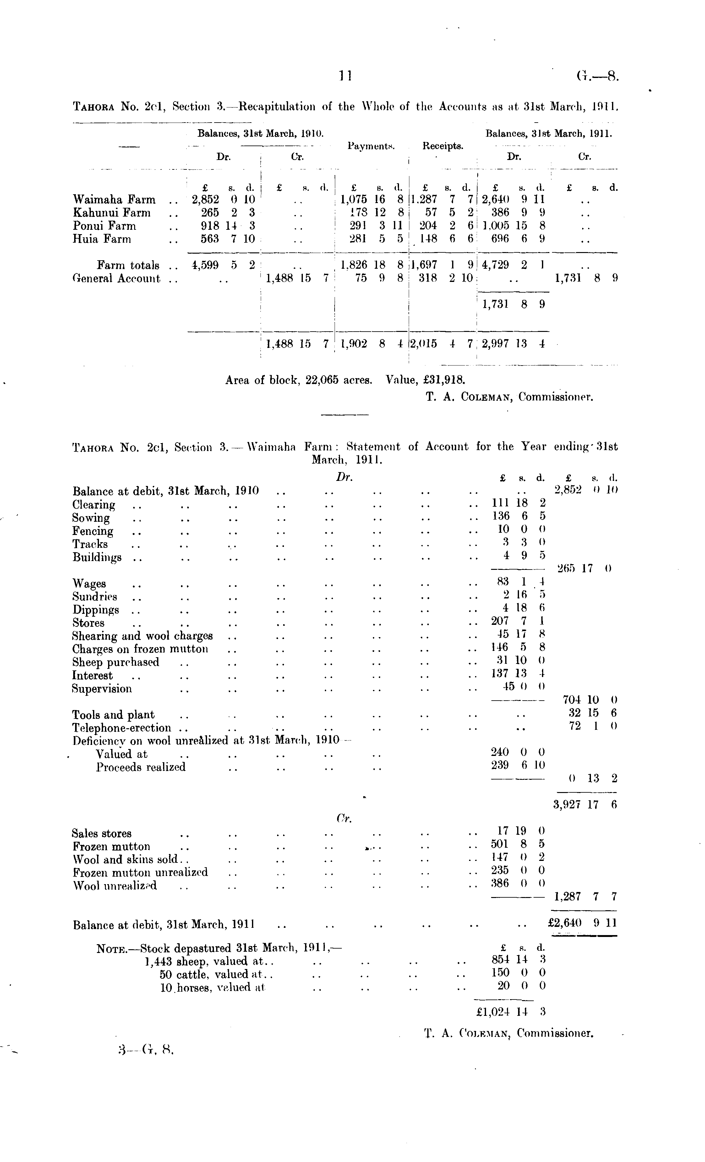 Tahora No. 2c1, Section 3.-Recapitulation of the Whole of the Accounts as at 31st March, 1911.