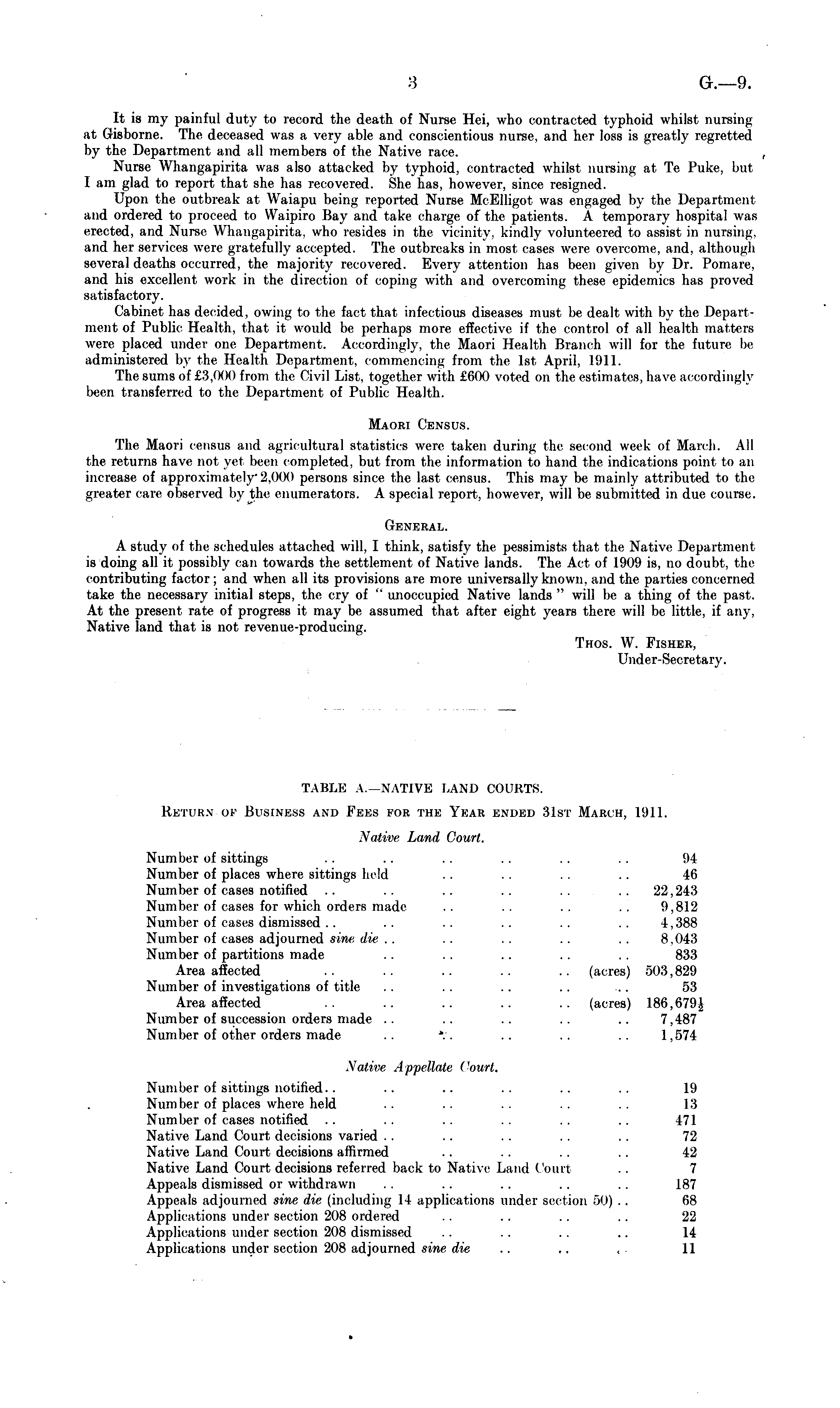 It is my painful duty to record the death of Nurse Hei, who contracted typhoid whilst nursing at Gisborne. The deceased was a very able and conscientious nurse, and her loss is greatly regretted by the Department and all members of the Native race. Nurse Whangapirita was also attacked by typhoid, contracted whilst nursing at Te Puke, but 1 am glad to report that she has recovered. She has, however, since resigned. Upon the outbreak at Waiapu being reported Nurse MeElligot was engaged by the Department and ordered to proceed to Waipiro Bay and take charge of the patients. A temporary hospital was erected, and Nurse Whangapirita, who resides in the vicinity, kindly volunteered to assist in nursing. and her services were gratefully accepted. The outbreaks in most cases were overcome, and, although several deaths occurred, the majority recovered. Every attention has been given by Dr. Pomare, and his excellent work in the direction of coping with and overcoming these epidemics has proved satisfactory. Cabinet has decided, owing to the fact that infectious diseases must be dealt with by the Department of Public Health, that it would be perhaps more effective if the control of all health matters were placed under one Department. Accordingly, the Maori Health Blanch will for the future be administered by the Health Department, commencing from the Ist April, 1911. The sums of £3,000 from the Civil List, together with £600 voted on the estimates, have accordingly been transferred to the Department of Public Health. Maori Census. The Maori census and agricultural statistics were taken during the second week of March. All the returns have not yet been completed, but from the information to hand the indications point to an increase of approximately 2.000 persons since the last census. This may be mainly attributed to the greater care observed by"the enumerators. A special report, however, will be submitted in due course. General. A study of the schedules attached will, I think, satisfy the pessimists that the Native Department is doing all it possibly can towards the settlement of Native lands. The Act of 1909 is, no doubt, the contributing factor; and when all its provisions are more universally known, and the parties concerned take the necessary initial steps, the cry of " unoccupied Native lands " will be a thing of the past. At the present rate of progress it may be assumed that after eight years there will be little, if any, Native land that is not revenue-producing. Thos. W. Fisher, Under-Secretary.