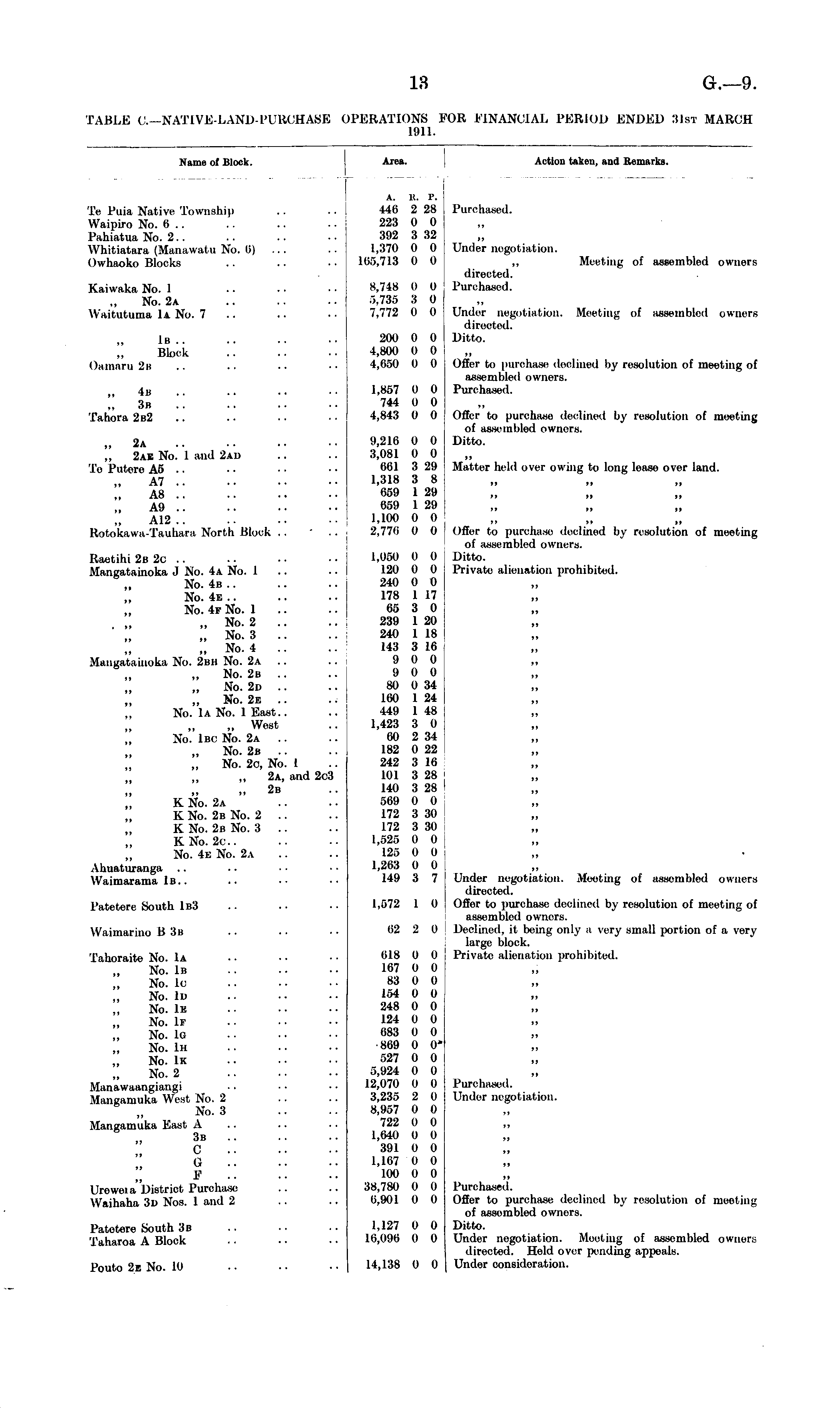 Name of Block. Area. ActiuD taken, and Remarks. Tβ Puia Native Township Waipiro No. 6 .. Pahiatua No. 2.. Whitiatara (Manawatu No. 8) Owhaoko Blocks A. K. P. 446 2 28 223 0 0 392 3 32 1,370 0 0 165,713 0 0 Purchased. >> Under negol iation. S,7iS 0 0 5,736 3 0 7,772 0 0 ,, Meeting of assembled owners directed. Purchased. Kaiwaka No. 1 No. 2a W'aitutuma Iα No. 7 .. Under negotiation. Meeting of assembled owners directed. Ditto. Block i l.iin.ini :2k 200 0 0 4,800 0 0 1,660 0 0 Offer In purchase declined by resolution of meeting of assembled owners. Purchased. 4b 3b Tahora 2b2 1,857 0 0 744 0 0 4,843 0 0 Offer to purchase deolined by resolution of meeting of assembled owners. Ditto. „ 2a „ 2ab No. 1 and 2ai> Te Putero A5 .. A7 .. A8 .. A9 A12 .. Rotokawa-Tauhara North Block .. 9,216 0 0 3,081 0 0 661 3 29 1,318 3 8 659 1 29 659 1 29 1,100 0 0 2,776 0 0 Matter held over owing to long lease over land. ii n ii t> *i », »» »» rt Raetihi 2n 2c .. Mangatainoka J No. 4a No. 1 .. No. 4b .. No. 4b .. No. 4f No. 1 „ No. 2 .. „ No. 3 „ No. 4 Mangatainoka No. 2bh No. 2a No. 2b .. No. 2d .. No. 2e .. No. Iα No. 1 East.. „ West No. Ibc No. 2a No. 2b .. No. 2c, No. I „ 2a, and 2o3 2b K No. 2a K No. 2b No. 2 .. K No. 2b No. 3 .. KNo. 2c. No. 4e No. 2a Almaturauga Waimarama Iβ. . 1,050 0 0 120 0 0 240 0 0 178 1 17 65 3 0 239 1 20 240 1 18 143 3 16 9 0 0 9 0 0 80 0 34 160 1 24 449 1 48 1,423 3 0 00 2 34 182 0 22 242 3 16 101 3 28 140 3 28 569 0 0 172 3 30 172 3 30 1,525 0 0 L26 0 0 1,263 0 0 149 3 7 Offer to purchase deolined by resolution of meeting of assembled owners. Ditto. Private alienation prohibited. I'at el ere South 1b3 1,572 1 0 Under negotiation. Meeting of assembled owners directed. Offer to purchase declined by resolution of meeting of assembled owners. Declined, it being only a very small portion of a very large block. Private alienation prohibited. Waimarino B 3b 02 2 0 Tahoraite No. Iα No. Iβ No. lc No. Id No. Iβ No. If No. 1g No. In No. Ik No. 2 Manawaangiangi Blangamuka West No. 2 No. 3 Mangamuka East A ;: l B :: :: :: G J' , Uroweia District Purchase Waihaha 3d Nos. 1 and 2 618 0 0 Iii7 0 0 83 0 0 154 0 0 248 0 0 124 0 0 083 0 0 •869 0 0* r>27 0 0 5,924 0 0 12,070 0 0 3,286 2 0 8,957 0 0 722 0 0 1,640 0 0 391 0 0 1,167 0 0 100 0 0 38,780 0 0 0,901 0 0 Purchased. Under negotiation. Patetere South 3b Taharoa A Block 1,127 0 0 16,096 0 0 Purchased. Offer to purchase declined by resolution of meeting of assembled owners. Ditto. Under negotiation. Meeting of assembled owner directed. Held over pending appeals. Under consideration. Pouto 2e No. 10 14,138 0 0