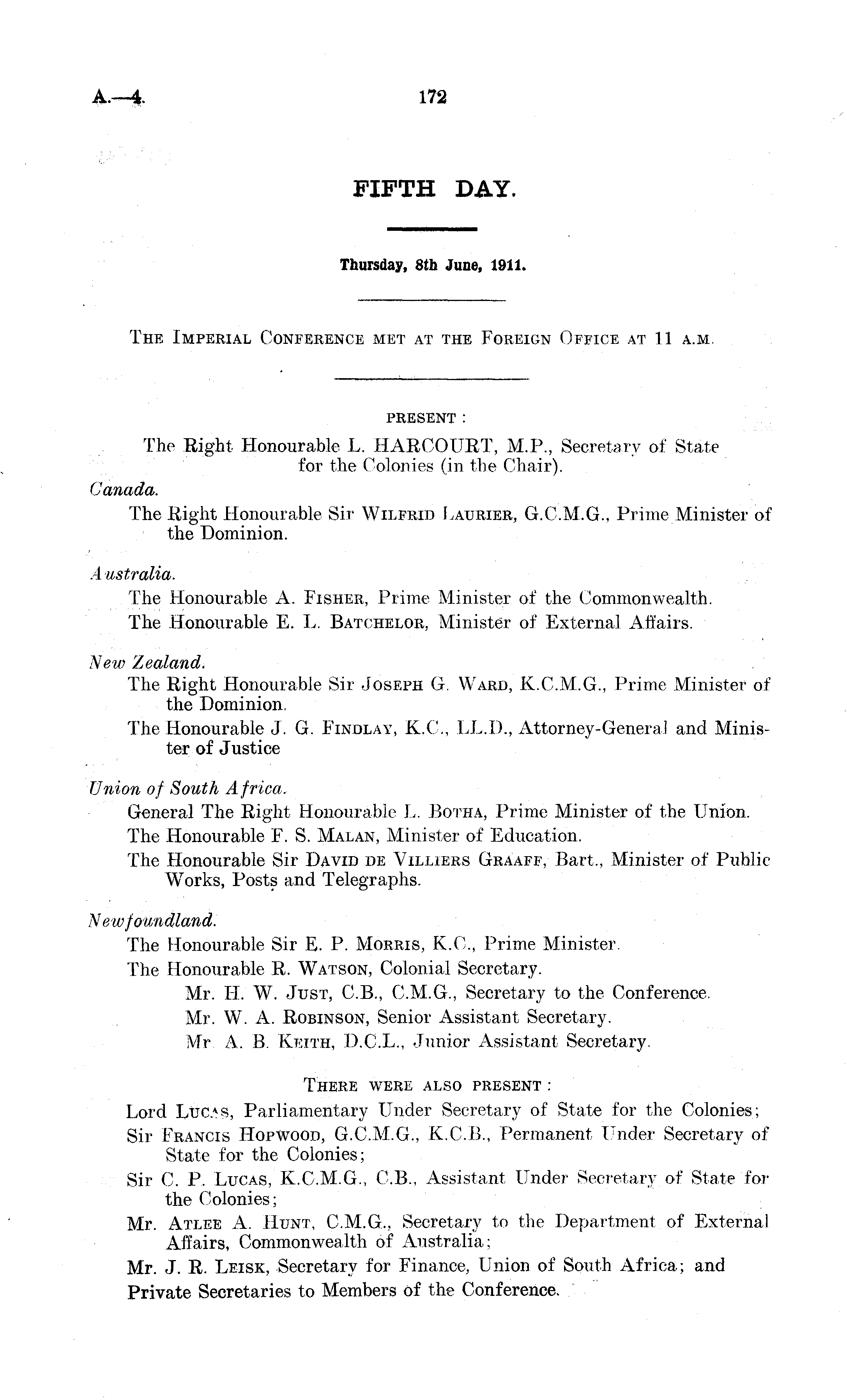 FIFTH DAY. Thursday, Bth June, 1911. The Imperial Conference met at the Foreign Office at 11 a.m. PRESENT : The Right Honourable L. HARCOURT, M.P., Secretary of State for the Colonies (in the Chair). Canada. The Right Honourable Sir Wilfrid Laurier, G.C.M.G., Prime Minister of the Dominion. A ustralia. The Honourable A. Fisher, Prime Minister of the Commonwealth. The Honourable E. L. Batchelor, Minister of External Affairs. New Zealand. The Right Honourable Sir Joseph G. Ward, K.C.M.G., Prime Minister of the Dominion. The Honourable J. G. Findlay, K.C., LL.D., Attorney-General and Minister of Justice Union of South Africa. General The Right Honourable L. Botha, Prime Minister of the Union. The Honourable F. S. Malan, Minister of Education. The Honourable Sir David de Villiers Graaff, Bart., Minister of Public Works, Posts and Telegraphs. Newfoundland. The Honourable Sir E. P. Morris, K.C., Prime Minister. The Honourable R. Watson, Colonial Secretary. Mr. H. W. Just, C.8., C.M.G., Secretary to the Conference. Mr. W. A. Robinson, Senior Assistant Secretary. Mr A. B. Keith, D.C.L., Junior Assistant Secretary. There were also present : Lord Luc.ss, Parliamentary Under Secretary of State for the Colonies; Sir Francis Hopwood, G.C.M.G., X.C.8., Permanent Under Secretary of State for the Colonies; Sir C. P. Lucas, K.C.M.G., C.8., Assistant Under Secretary of State for the Colonies; Mr. Atlee A. Hunt, C.M.G., Secretary to the Department of External Affairs, Commonwealth of Australia; Mr. J. R. Leisk, Secretary for Finance, Union of South Africa; and Private Secretaries to Members of the Conference.
