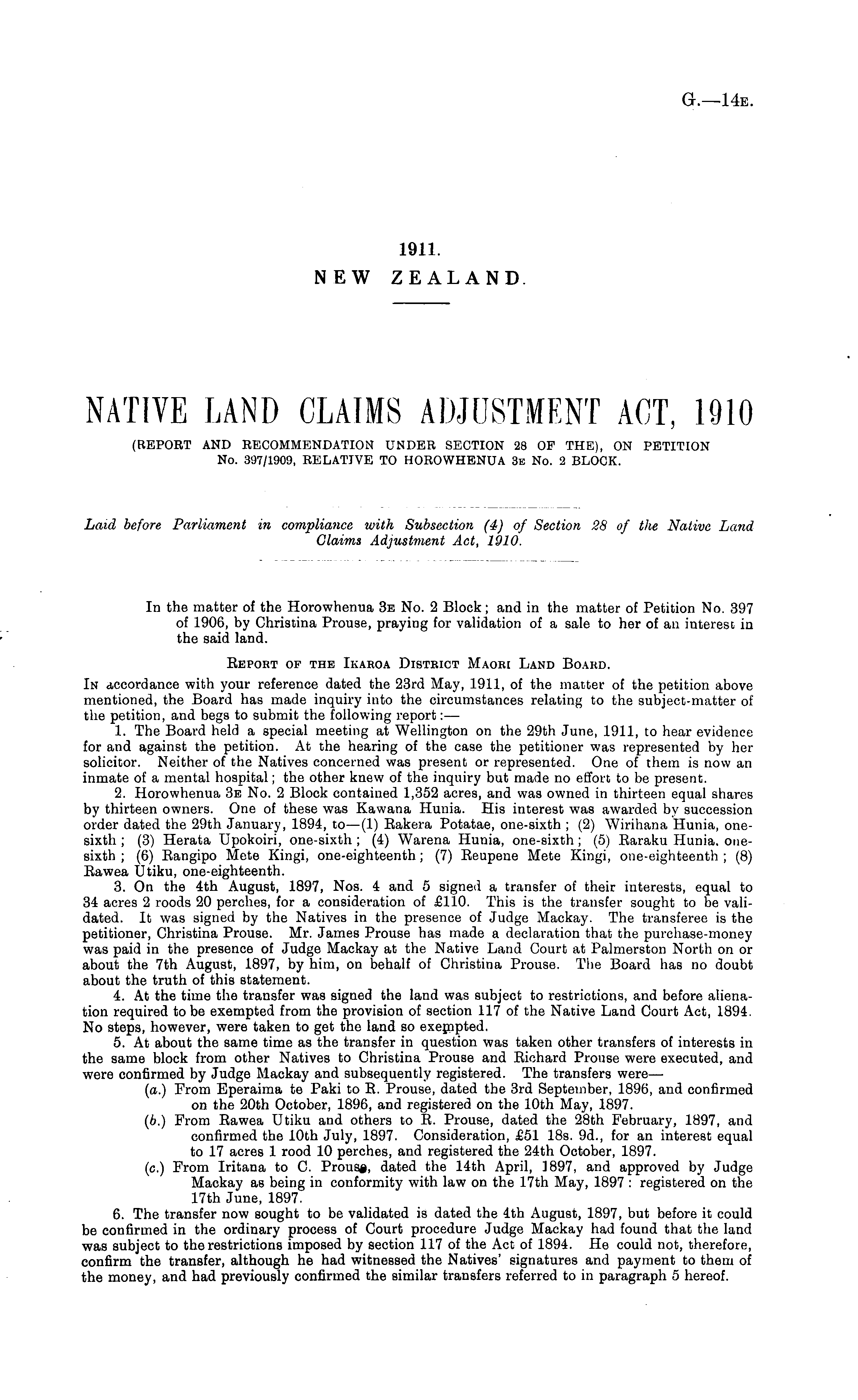 In the matter of the Horowhenua 3e No. 2 Block; and in the matter of Petition No. 397 of 1906, by Christina Prouse, praying for validation of a sale to her of an interest in the said land. Report of the Ikakoa District Maori Land Board. In accordance with your reference dated the 23rd May, 1911, of the matter of the petition above mentioned, the Board has made inquiry into the circumstances relating to the subject-matter of the petition, and begs to submit the following report:— 1. The Board held a special meeting at Wellington on the 29th June, 1911, to hear evidence for and against the petition. At the hearing of the case the petitioner was represented by her solicitor. Neither of the Natives concerned was present or represented. One of them is now an inmate of a mental hospital; the other knevv of the inquiry but made no effort to be present. 2. Horowhenua 3e No. 2 Block contained 1,352 acres, and was owned in thirteen equal shares by thirteen owners. One of these was Kawana Hunia. His interest was awarded by succession order dated the 29th January, 1894, to —(1) Eakera Potatae, one-sixth ; (2) Wirihana Hunia, onesixth ; (3) Herata Upokoiri, one-sixth ; (4) Warena Hunia, one-sixth; (5) Earaku Hunia, onesixth ; (6) Rangipo Mete Kingi, one-eighteenth; (7) Reupene Mete Kingi, one-eighteenth ; (8) Rawea Utiku, one-eighteenth. 3. On the 4th August, 1897, Nos. 4 and 5 signed a transfer of their interests, equal to 34 acres 2 roods 20 perches, for a consideration of £110. This is the transfer sought to be validated. It was signed by the Natives in the presence of Judge Mackay. The transferee is the petitioner, Christina Prouse. Mr. James Prouse has made a declaration that the purchase-money was paid in the presence of Judge Mackay at the Native Land Court at Palmerston North on or about the 7th August, 1897, by him, on behalf of Christina Prouse. The Board has no doubt about the truth of this statement. 4. At the time the transfer was signed the land was subject to restrictions, and before alienation required to be exempted from the provision of section 117 of the Native Land Court Act, 1894. No steps, however, were taken to get the land so exempted. 5. At about the same time as the transfer in question was taken other transfers of interests in the same block from other Natives to Christina Prouse and Richard Prouse were executed, and were confirmed by Judge Mackay and subsequently registered. The transfers were— (a.) From Eperaima te Paki to R. Prouse, dated the 3rd September, 1896, and confirmed on the 20th October, 1896, and registered on the 10th May, 1897. (b.) From Rawea Utiku and others to R. Prouse, dated the 28th February, 1897, and confirmed the 10th July, 1897. Consideration, £51 18s. 9d., for an interest equal to 17 acres 1 rood 10 perches, and registered the 24th October, 1897. (c.) From Iritana to C. Prous#, dated the 14th April, 1897, and approved by Judge Mackay as being in conformity with law on the 17th May, 1897 : registered on the 17th June, 1897. 6. The transfer now sought to be validated is dated the 4th August, 1897, but before it could be confirmed in the ordinary process of Court procedure Judge Mackay had found that the land was subject to the restrictions imposed by section 117 of the Act of 1894. He could not, therefore, confirm the transfer, although he had witnessed the Natives' signatures and payment to them of the money, and had previously confirmed the similar transfers referred to in paragraph 5 hereof.