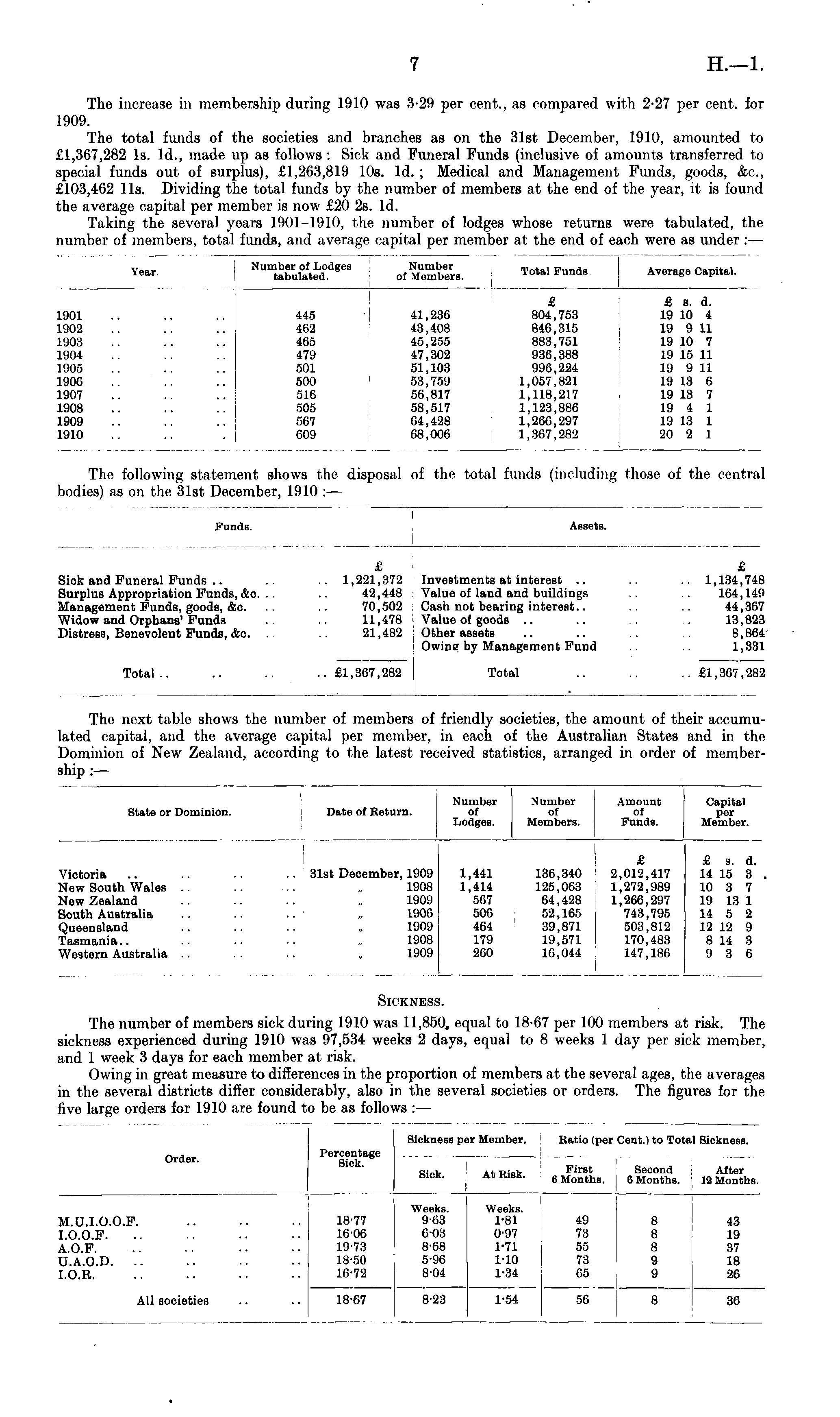 The increase in membership during 1910 was 3-20 per cent., as compared with 2-27 per cent, for 1909. The total funds of the societies and branches as on the 31st December, 1910, amounted to £1,367,282 Is. Id., made up as follows : Sick and Funeral Funds (inclusive of amounts transferred to special funds out of surplus), £1,263,819 10s. Id. ; Medical and Management Funds, goods, &c, £103,462 11s. Dividing the total funds by the number of members at the end of the year, it is found the average capital per member is now £20 2s. Id. Taking the several yoara 1901-1910, the number of lodges whose returns were tabulated, the number of members, total funds, and average capital per member at the end of each were as under : —