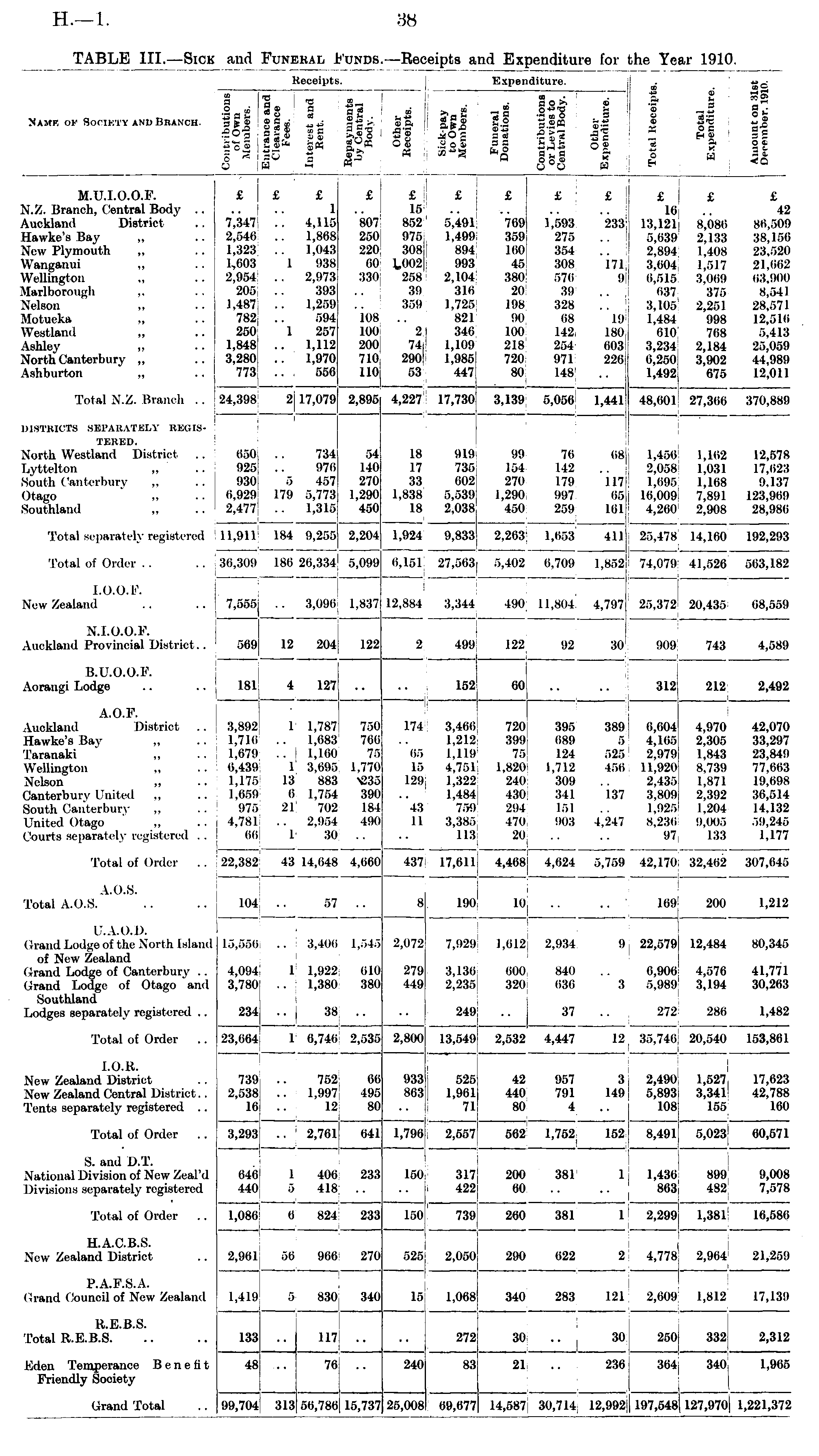 TABLE III.— Sick and Funeral Funds.—Receipts and Expenditure for the Year 1910.