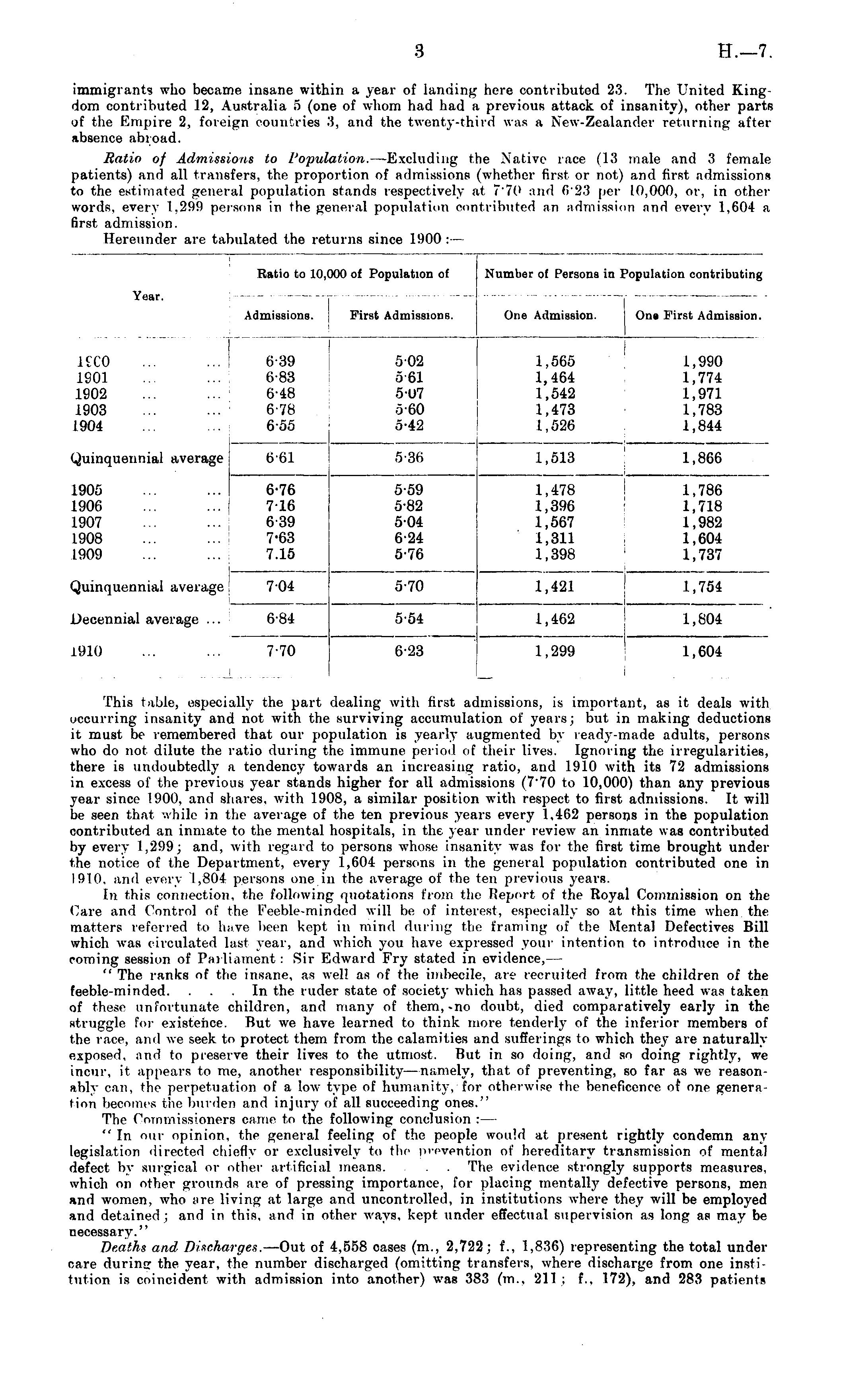 This table, especially the part dealing with first admissions, is important, as it deals with occurring insanity and not with the surviving accumulation of years; but in making deductions it must be remembered that our population is yearly augmented by ready-made adults, persons who do not dilute the ratio during the immune period of their lives. Ignoring the irregularities, there is undoubtedly r tendency towards an increasing ratio, and 1910 with its 72 admissions in excess of the previous year stands higher for all admissions (770 to 10,000) than any previous year since 1900, and shares, with 1908, a similar position with respect to first admissions. It will be seen that while in the average of the ten previous years every 1,462 persons in the population contributed an inmate to the mental hospitals, in the year under review an inmate was contributed by every l,2!)9; and. with regard to persons whose insanity was for the first time brought under the notice of the Department, every 1,604 persons in the general population contributed one in 1910, and every 1,804 persons one in the average of the ten previous years. In this connection, the following quotations from the Report of the Royal Commission on the Care and Control of the Feeble-minded will be of interest, especially so at this time when the matters referred to have been kept in mind during the framing of the Mental Defectives Bill which was circulated last year, and which you have expressed your intention to introduce in the coming session of Parliament : Sir Edward Fry stated in evidence, — " The ranks of the insane, as well as of the imbecile, are recruited from the children of the feeble-minded. ... In the ruder state of society which has passed away, little heed was taken of those unfortunate children, and many of them,-no doubt, died comparatively early in the xtvupgle For existence. But we have learned to think more tenderly of the inferior members of the race, ami we seek to protect them from the calamities and sufferings to which they are naturally exposed, and to preserve their lives to the utmost. But in so doing, and so doing rightly, we incur, it appears to mc, another responsibility — namely, that of preventing, so far as we reasonably can, the perpetuation of a low type of humanity, for otherwise the beneficence of one genera tion becomes the burden and injury of all succeeding ones." The Commissioners came to the following conclusion : — " In our opinion, the general feeling of the people would at present rightly condemn any legislation directed chiefly or exclusively to the prevention of hereditary transmission of mental defect by surgical or other artificial means. . . The evidence strongly supports measures, which on other grounds are of pressing importance, for placing mentally defective persons, men and women, who are living at large and uncontrolled, in institutions where they will be employed and detained ; and in this, and in other ways, kept under effectual supervision as long as may be necessary." De.afht and Discharges. —Out of 4,558 cases (m., 2,722; f., 1,836) representing the total under oare durinsr the year, the number discharged (omitting transfers, where discharge from one institution is coincident with admission into another) was 383 (m., 211 : f., 172), and 283 patients