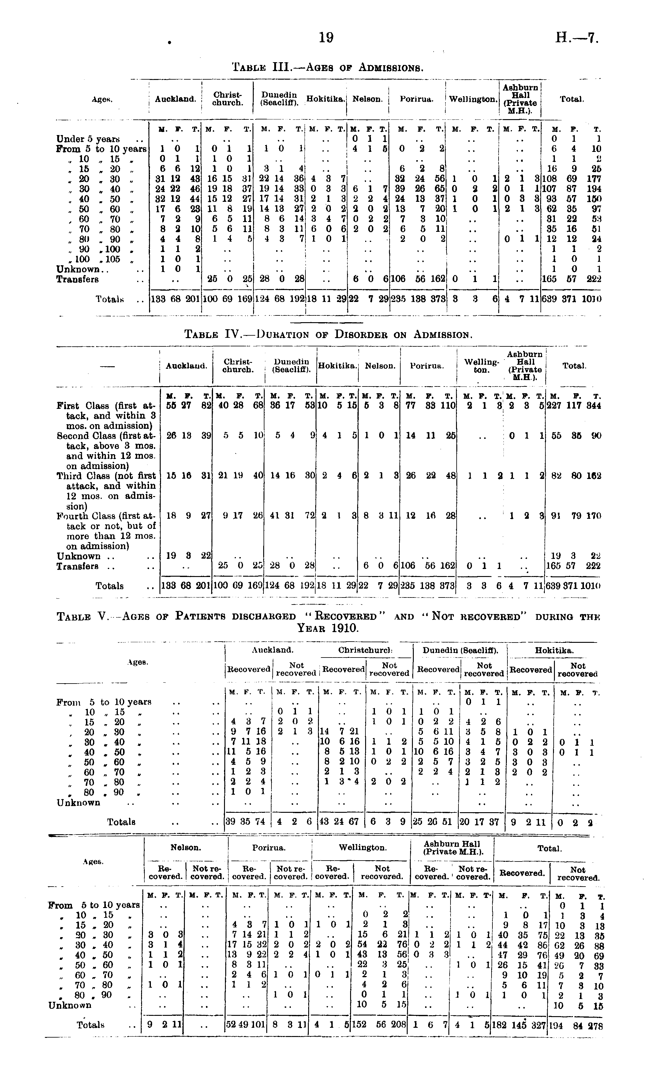 Ases. Auckland. Chiibtohurch. (SeaclfffJ. Hokitika. Nelson. Porirutt. Wellington. Aehburn Hall (Private M.H.). Total. Under 5 years From 5 to 10 years , 10 „ 15 , ,15 ,20 ., . 20 . 30 „ ,30 „ 40 . . 40 . 50 . „ 50 „ 60 „ . 60 „ 70 ., , 70 „ 80 „ ,. 80 . 90 „ ., 90 .100 . . 100 . 106 .. Unknown Transfers M. r. T. M. P. T. M. P. T.i If. P. T. M. P. T. Oil 4 1 5 M. P. T.j M. P. T. M. P. T. M. P. T. 0 1 1 I 6 4 10 l l a 16 9 26 108 69 177 107 87 194 93 67 15" 62 35 97 31 22 5» 35 16 61 Yi. 12 24 1 1 2 1 0 1 1 0 1 165 67 i'ii 1 0 1 0 1 1 6 6 12 31 13 43 24 22 46 32 12 44 17 6 23 7 2 9 8 2 10 4 4 8 1 1 2 10 1 I 0 1 0 11 1 0 1 1 0 1 16 15 31 19 18 37 15 12 27 11 8 19 6 5 11 5 6 11 1 4 B 1 0 1 0 2 2 •• 3 1 4 22 14 36 19 14 33 17 14 31 14 13 27 8 6 14 8 3 ll| 4 3 7! • • 6 2 8 32 24 56; 39 26 65, 24 13 37 13 7 20 7 3 10 , 6 5 II 2O2J 4 3 7 0 3 3 2 1 3 2 0 2 3 4 7 6 0 6 1 0 1 6 1 7 2 2 4 2 0 2 0 2 2 2 0 2 1 0 1 0 2 2 1 0 1 J 0 1 2 18 Oil 0 3 8 2 1 8 , . 0 1 1 •• '' •• \ •• .. .. 25 0 26 100 69 169 28 0 28 6 0 6 106 56 162 oil Totals .. 133 68 201 1-J4 68 192! 18 11 29 22 7 2! 235 138 373 8 a 6 4 7 11 639 371 1011)