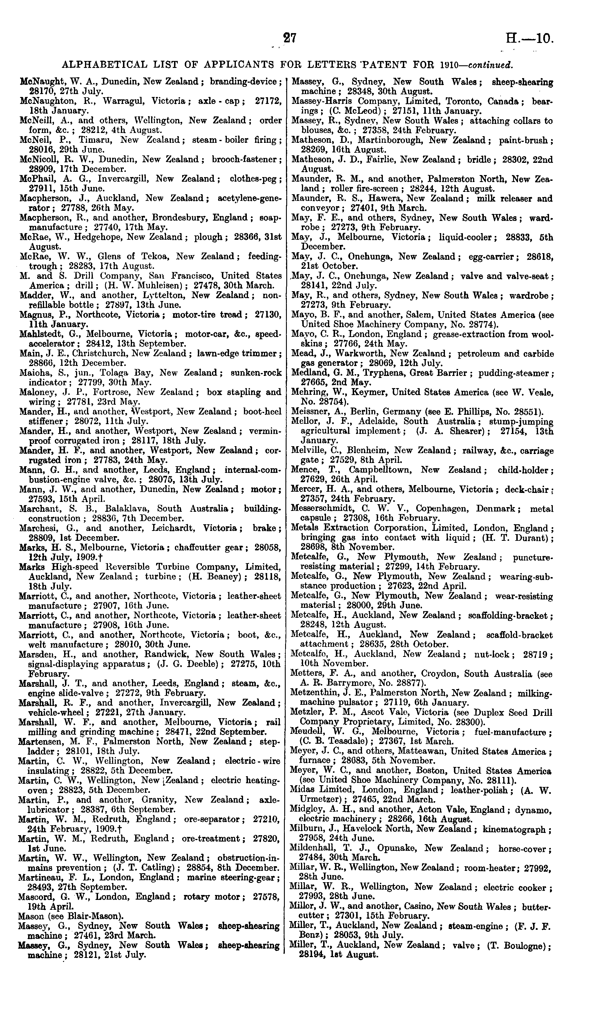 McNaught, W. A., Dunedin, New Zealand ; branding-device ; 28170, 27th July. McNaughton, R., Warragul, Victoria ; axle - cap ; 27172, 18th January. McNeill, A., and others, Wellington, New Zealand ; order form, &c. ; 28212, 4th August. McNeil, P., Timaru, New Zealand; steam - boiler firing; 28016, 29th June. McNicoll, R. W., Dunedin, New Zealand; brooch-fastener; 28909, 17th December. McPhail, A. G., Invercargill, New Zealand; clothes-peg; 27911, 15th June. Macpherson, J., Auckland, New Zealand; acetylene-gene-rator ; 27788, 26th May. Macpherson, R., and another, Brondesbury, England; soapmanufacture ; 27740, 17th May. Mcßae, W., Hedgehope, New Zealand; plough ; 28366, 31st August. Mcßae, W. W., Glens of Tekoa, New Zealand; feedingtrough ; 28283, 17th August. M. and S. Drill Company, San Francisco, United States America ; drill; (H. W. Muhleisen); 27478, 30th March. Madder, W., and another, Lvttelton, New Zealand; nonrefillable bottle ; 27897, 13th June. Magnus, P., Northcote, Victoria; motor-tire tread; 27130, llth January. Mahlstedt, G., Melbourne, Victoria; motor-car, &c, speedaccelerator ; 28412, 13th September. Main, J. E., Christchurch, New Zealand ; lawn-edge trimmer ; 28866, 12th December. Maioha, S., jun., Tolaga Bay, New Zealand; sunken-rock indicator ; 27799, 30th May. Maloney, J. P., Fortrose, New Zealand; box stapling and wiring ; 27781, 23rd May. Mander, H., and another, Westport, New Zealand ; boot-heel stiffener; 28072, llth July. Mander, H., and another, Westport, New Zealand; verminproof corrugated iron ; 28117, 18th July. Mander, H. P., and another, Westport, New Zealand; corrugated iron ; 27783, 24th May. Mann, G. H., and another, Leeds, England ; internal-com-bustion-engine valve, &c. ; 28075, 13th July. Mann, J. W., and another, Dunedin, New Zealand; motor; 27593, 15th April. Marchant, S. 8., Balaklava, South Australia; buildingconstruction ; 28830, 7th December. Marchesi, G., and another, Leichardt, Victoria; brake; 28809, Ist December. Marks, H. S., Melbourne, Victoria ; chaffcutter gear; 28058, 12th July, 1909.t Marks High-speed Reversible Turbine Company, Limited, Auckland, New Zealand; turbine; (H. Beaney) ; 28118, 18th July. Marriott, C., and another, Northcote, Victoria ; leather-sheet manufacture ; 27907, 16th June. Marriott, C, and another, Northcote, Victoria; leather-sheet manufacture ; 27908, 16th June. Marriott, C, and another, Northcote, Victoria; boot, &c, welt manufacture ; 28010, 30th June. Marsden, H., and another, Randwick, New South Wales; signal-displaying apparatus ; (J. G. Deeble); 27275, 10th February. Marshall, J. T., and another, Leeds, England; steam, &c, engine slide-valve ; 27272, 9th February. Marshall, R. F., and another, Invercargill, New Zealand; vehicle-wheel; 27221, 27th January. Marshall, W. F., and another, Melbourne, Victoria; rail milling and grinding machine ; 28471, 22nd September. Martensen, M. F., Palmerston North, New Zealand ; stepladder ; 28101, 18th July. Martin, C. W., Wellington, New Zealand; electric - wire insulating ; 28822, sth December. Martin, C. W, Wellington, New .Zealand; electric heatingoven ; 28823, sth December. Martin, P., and another, Granity, New Zealand; axlelubricator ; 28387, 6th September. Martin, W. M., Redruth, England; ore-separator; 27210, 24th February, 1909. t Martin, W. M., Redruth, England; ore-treatment; 27820, Ist June. Martin, W. W., Wellington, New Zealand; obstruction-in-mains prevention ; (J. T. Catling); 28854, Bth December. Martineau, F. L., London, England; marine steering-gear; 28493, 27th September. Mascord, G. W., London, England; rotary motor; 27578, 19th April. Mason (see Blair-Mason). Massey, G., Sydney, New South Wales; sheep-shearing machine ; 27461, 23rd March. Massey, G., Sydney, New South Wales; sheep-shearing machine ; 28121, 21st July.