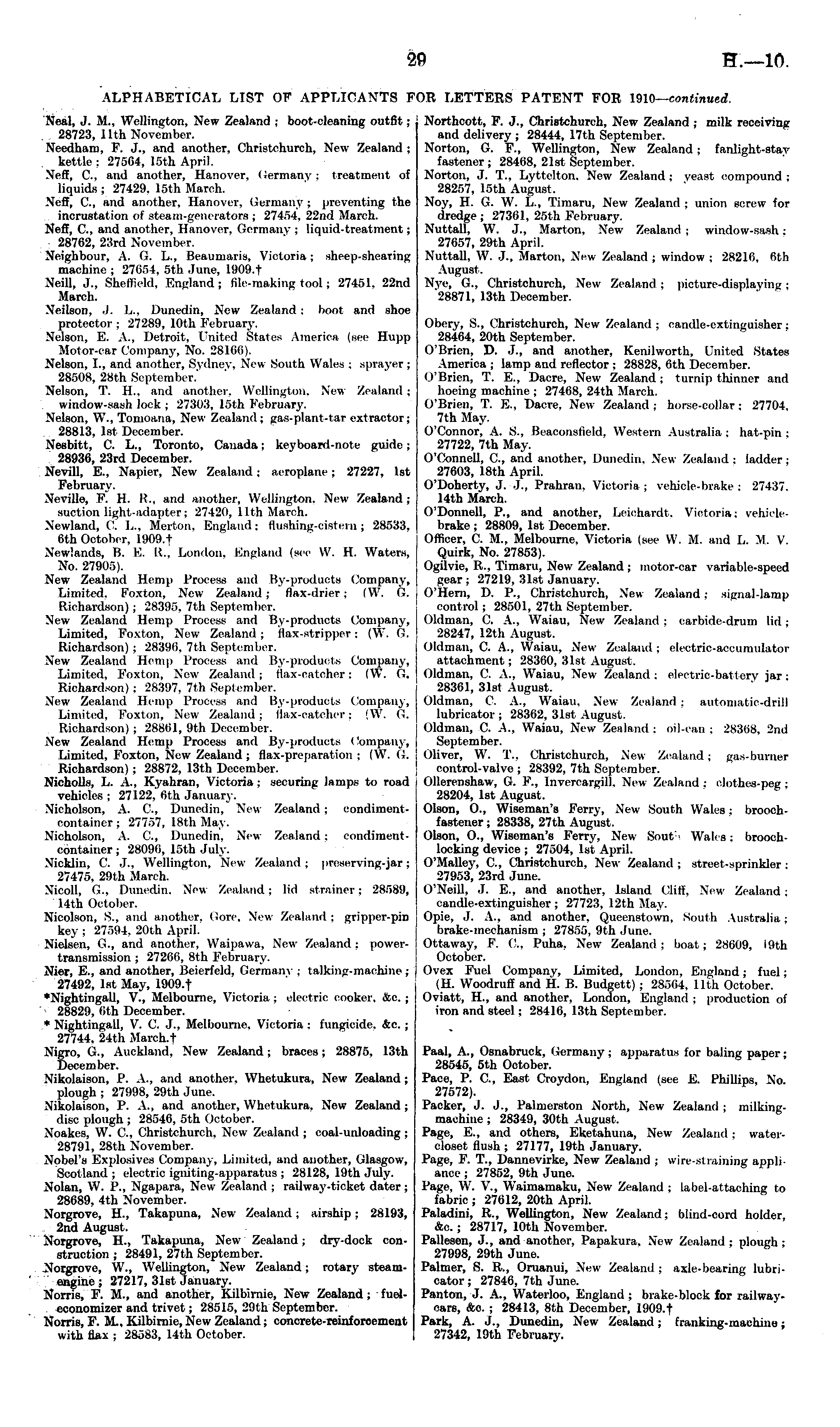Northcott, F. J., Christchurch, New Zealand ; milk receiving and delivery ; 28444, 17th September. Norton, G. F., Wellington, New Zealand; fanlight-stay fastener ; 28468, 21st September. Norton, J. T., Lyttelton. New Zealand : veast compound ; 28257, 15th August. Noy, H. G. W. L., Timaru, New Zealand ; union screw for dredge ; 27361, 25th February. Nuttall, W. J., Marton, New Zealand ; window-sash : 27657, 29th April. Nuttall. W. J., Marton. New Zealand ; window ; 28216, 6th August. Nye, G., Christchurch, New Zealand : picture-displaying ; '28871, 13th December. Obery, S., Christchurch, New Zealand ; candle-extinguisher: 28464, 20th September. O'Brien, D. J., and another, Kenilworth, United States America ; lamp) and reflector ; 28828, 6th December. O'Brien, T. E., Dacre, New Zealand ; turnip thinner and hoeing machine ; 27468, 24th March. O'Brien, T. E., Dacre, New Zealand ; horse-collar; 27704. 7th May. O'Connor, A. S., Beaeonsfield, Western Australia ; hat-pin : 27722, 7th May. O'Connell, C, and another, Dunedin. New Zealand; ladder; 27603, 18th April. O'Doherty, J. J., Prahrau. Victoria ; vehicle-brake : 27437. Uth March. O'Donnell, P., and another, Leichardt, Victoria: vehiclebrake ; 28809, Ist December. Officer, C. M.. Melbourne. Victoria (see \\. M. and L. M. V. Quirk, No. 27853). Ogilvie, R., Timaru, New Zealand ; motor-car variable-speed gear ; 27219, 31st January. O'Hern, D. P., Christchurch, New Zealand: signal-lamp control; 28501, 27th September. Oldman, C. A., Waiau, New Zealand; carbide-drum lid; 28247, 12th August. Oldman, C. A., Waiau, New Zealand ; electric-accumulator attachment; 28360, 31st August. Oldman, C. A., Waiau, New Zealand : electric-battery jar: 28361, 31st August. Oldman, C. A., Waiau. New Zealand ; automatic-drill lubricator ; 28362, 31st August. Oldman, C. A., Waiau, New Zealand : oil-can ; 28368, 2nd September. Oliver, W. T., Christchurch, New Zealand; gas-burner control-valve ; 28392, 7th September. Ollerenshaw, G. F., Invercargill. New Zealand : clothes-peg ; 28204, Ist August. Olson, 0., Wiseman's Ferry. New South Wales: broochfastener ; 28338, 27th August. Olson, 0., Wiseman's Ferry. New South Wales: broochlocking device ; 27504, Ist April. O'Malley, C, Christchurch, New Zealand ; street-sprinkler : 27953, 23rd June. O'Neill, J. E., and another, Island Cliff. New Zealand; candle-extinguisher ; 27723, 12th May. Opie, J. A., and another, Queenstown, South Vustralia; brake-mechanism ; 27855, 9th June. Ottaway, F. C, Puha, New Zealand; boat; 28609, i9th October. Ovex Fuel Company, Limited, London, England; fuel; (H. Woodruff and H. B. Budgett) ; 28504, llth October. Oviatt, H., and another, London, England ; production of iron and steel; 28416, 13th September. Paal, A., Osnabruck, Germany; apparatus for baling paper; 28545, sth October. Pace, P. C, East Crovdon. England (see E. Phillips, No. 27572). Packer, J. J., Palmerston North, New Zealand ; milkingmachine ; 28349, 30th August. Page, E., and others, Eketahuna, New Zealand; watercloset flush ; 27177, 19th January. Page, F. T, Dannevirke, New Zealand ; wire-straining appliance ; 27852, 9th June. Page, W. V., Waimamaku, New Zealand ; label-attaching to fabric ; 27612, 20th April. Paladini, R., Wellington, New Zealand; blind-cord holder, &c.; 28717, 10th November. Pallesen, J., and another, Papakura. New Zealand ; plough ; 27998, 29th June. Palmer, S. R., Oruanui, New Zealand; axle-bearing lubricator ; 27846, 7th June. Panton, J. A., Waterloo, England ; brake-block for railwayears, <fec. ; 28413, Bth December, 1909. t Park, A. J., Dunedin, New Zealand; franking-machine; 27342, 19th February.