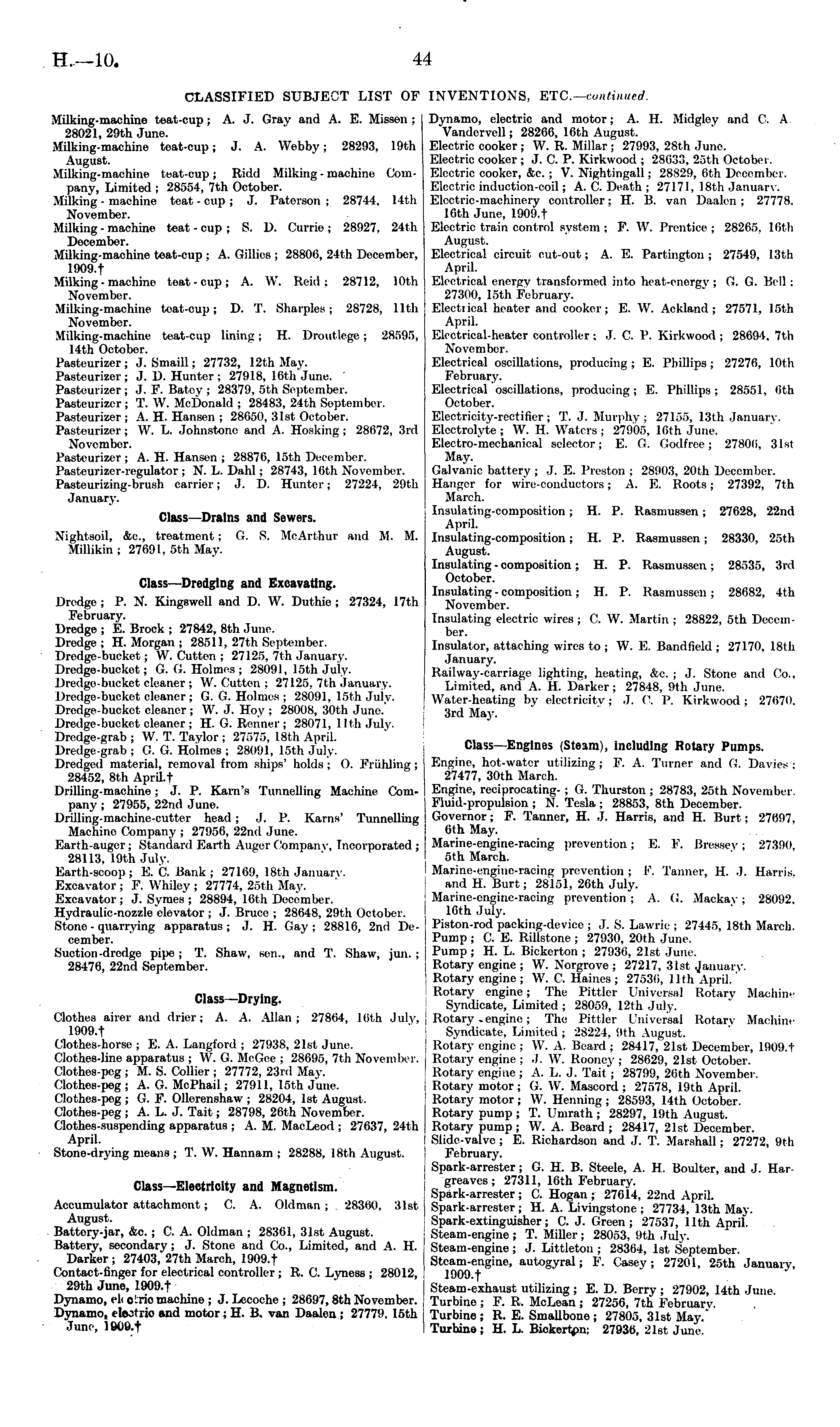 Dynamo, electric and motor; A. H. Midgley and C. A 'Vandervcll; 28266, 16th August. Electric cooker ; W. R. Millar ; 27993, 28th June. Electric cooker ; J. C. P. Kirkwood ; 28633. 25th October. Electric cooker, &c. ; V. Nightingall ; 28829, 6th December. Electric induction-coil; A. C. Death ; 27171, 18th January. Electric-machinery controller; H. B. van Daalen ; 27778. 16th June, 1909. t Electric train control system ; F. VV. Prentice ; 28265, 16th August. Electrical circuit cut-out; A. E. Partington; 27549, 13th April. Electrical onorgv transformed into heat-energv ; G. G. Bell; 27300, 15th February. Electrical heater and cooker; E. W. Ackland; 27571. 15th April. Electrical-heater controller; J. C. P. Kirkwood; 28691. 7th November. Electrical oscillations, producing ; E. Phillips ; 27276, 10th February. Electrical oscillations, producing; E. Phillips; 28551, 6th October. Electricity-rectifier; T. J. Murphy ; 27155, 13th January. Electrolyte; VV. H. Waters; 27905, 16th June. Electro-mechanical selector; E. G. Godfree; 27800, 31st May. Galvanic battery ; J. E. Preston ; 28903, 20th December. Hanger for wire-conductors; A. E. Boots; 27392, 7th March. Insulating-composition; H. P. Rasmussen; 27628, 22nd April. Insulating-composition; H. P. Rasmussen; 28330, 25th August. Insulating - composition; H. P. Rasmussen: 28535, 3rd October. Insulating - composition ; H. P. Rasmussen ; 28682, 4th November. Insulating electric wires ; C. W. Martin ; 28822, sth December. Insulator, attaching wires to ; W. E. Bandfiold ; 27170, 18th January. Railway-carriage lighting, heating, &c. ; J. Stone and Co., Limited, and A. 11. Darker; 27848, 9th June. Water-heating by electricity; .1. C. I'. Kirkwood; 27079. 3rd May. Class—Engines (Steam), including Rotary Pumps. Engine, hot-water utilizing; F. A. Turner and G. Davies: 27477, 30th March. Engine, reciprocating- ; G. Thurston ; 28783, 25th November. Fluid-propulsion ; N. Tosla ; 28853, Bth December. Governor ; F. Tanner, H. J. Harris, and H. Burt : 27697. 6th May. Marine-engine-racing prevention; E. F. Bressey; 27890, sth March. Marine-enginc-racing prevention ; F. Tanner, H. J. Harris. and H. Burt; 28151, 26th July. Marine-engine-racing prevention ; A. G. Mackay; 28092. 16th July. Piston-rod packing-device ; J. S. Lawrio ; 27445, 18th March. Pump ; C. E. Rillstone ; 27930, 20th Juno. Pump ; H. L. Bickcrton ; 27930, 21st June. Rotary engine ; W. Norgrove ; 27217, 31st .January. Rotary engine ; W. C. Haines ; 27536, llth April. Rotary engine; The Pittler Universal Rotarv Machine Syndicate, Limited ; 28059, 12th July. Rotary-engine; The Pittler Universal Rotary Machine Syndicate, Limited ; 28224, 9th August. Rotary engine; W. A. Beard; 28417,215t December, L909.f Rotary engine ; J. W. Rooncy ; 28629, 21st October. Rotary engine; A. L. J. Tait'; 28799, 26th November. Rotary motor ; G. VV. Mascord ; 27578, 19th April. Rotary motor ; VV. Henning ; 28593, Uth October. Rotary pump ; T. Umrath ; 28297, 19th August. Rotary pump; W. A. Board ; 28417, 21st December. Slide-valve; E. Richardson and J. T. Marshall; 27272, 9th February. Spark-arrester; G. H. B. Steele, A. H. Boulter, and J. Hargreaves; 27311, 16th February. Spark-arrester ; C. Hogan ; 27614, 22nd April. Spark-arrester ; H. A. Livingstone ; 27734, 13th May. Spark-extinguisher; C. J. Green; 27537, llth April. Steam-engine; T.Miller; 28053, 9th July. Steam-engine ; J. Littleton ; 28364, Ist September. Steam-engine, autogyral; F. Casey; 27201, 25th January, 1909.f Steam-exhaust utilizing ; E. D. Berry ; 27902, Uth June. Turbine ; F. R. McLean ; 27256, 7th February. Turbine ; R. E. Smallbone ; 27805, 31st May." Turbine ; H. L. Bickerton; 27936, 21st Juno.