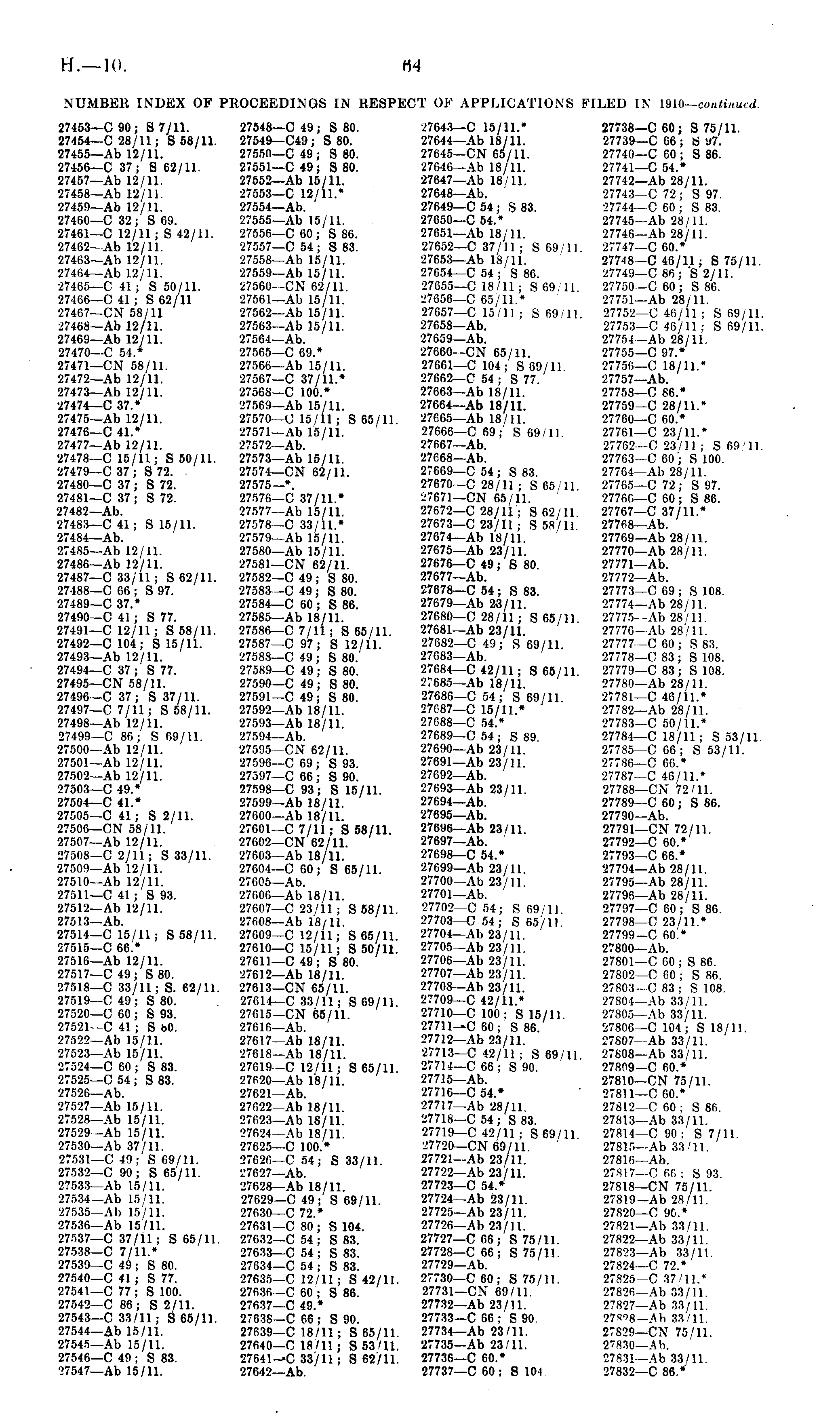 NUMBER INDEX OF PROCEEDINGS IN RESPECT OP APPLICATIONS FILED IN 1910— continued. 27453—C 90; S 7/11. 27548—C 49; S 80. 27643—C 15/11.* 27738—C 60 ; S 75/11. 27454—C 28/11; S 58/11. 27549—C49 ; S 80. 27644—Ab 18/11. 27739—C 66 ; S u7. 27455—Ab 12/11. 27550—C 49 ; S 80. 27645—CN 65/11. 27740—C 60 ; S 86. 27456—C 37; S 62/11. 27551—C 49; S 80. 27646—Ab 18/11. 27741—C 54.* 27457—Ab 12/11. 27552—Ab 15/11. 27647—Ab 18/11. 27742—Ab 28/11. 27458—Ab 12'/11. 27553—C 12/11.* 27648—Ab. 27743—C 72 ; S 97. 27459—Ab 12/11. 27554—Ab. ' 27649—C 54 ; S 83. 27744—C 60 ; S 83. 27460—C 32; S 69. 27555—Ab 15/11. 27650—C 54.* 27745—Ab 28. 11. 27461—C 12/11 ; S 42/11. 27556—C 60; S 86. 27651—Ab 18/11. 27746—Ab 28/11. 27462—Ab 12/11. 27557—C 54 ; S 83. 27652—C 37/11 ; S 69/11. 27747—C 60.* 27463—Ab 12/11. 27558—Ab 15/11. 27653—Ab 18/11. 27748—C 46/11; S 75/11. 27464—Ab 12/11. 27559—Ab 15/11. 27654—C 54 ; S 86. 27749—C 86; 'S 2/11. 27465—C 41; S 50/11. 27560—CN 62/11. 27655—C 18/11; 569 11. 27750—C 60 ; S 86. 27466—C 41; S 62/11 27561—Ab 15/11. 27656—C 65/11.* 27751—Ab 28/11. 27467—CN 58/11 27562—Ab 15/11. 27657—C 15/11 ; S 69/11. 27752—C 46/11 ; S 69/11 27468—Ab 12/11. 27563—Ab 15/11. 27658—Ab. 27753—C 46/11 : S 69/11 27469—Ab 12/11. 27564—Ab. 27659—Ab. 27754—Ab 28/11. 27470—C 54.* 27565—C 69.* 27660--CN 65/11. 27755—C 97.* 27471—CN 58/11. 27566—Ab 15/11. 27661—C 104 : S 69/11. 27756—C 18/11.* 27472—Ab 12/11. 27567—C 37/11.* 27662—C 54 ; S 77. 27757—Ab. 27473—Ab 12/11. 27568—C 100.* 27663—Ab 18/11. 27758—C 86.* 27474—C 37.* 27569—Ab 15/11. 27664—Ab 18/11. 27759—C 28/11.* 27475—Ab 12/11. 27570—C 15/11 ; S 65/11. 27665—Ab 18/11. 27760—C 60.* 27476—C 41.* 27571—Ab 15/11. 27666—C 69 ;S 69 11. 27761—C 23/11.* 27477—Ab 12/11. 27572—Ab. 27667—Ab. 27762—C 28/11; 569 11 27478—C 15/11; S 50/11. 27573—Ab 15/11. 27068—Ab. 27763—C 60; S 100. 27479—C 37 ; S 72. 27574—CN 62/11. 27669—C 54 ; S 83. 27764—Ab 28/11. 27480—C 37; S 72. 27575—*. 27670—C 28/11 ;S 65 11. 27765—C 72 ; S 97. 27481—C 37 ; S 72. 27576—C 37/11.* 27671—CN 65/11. 27766—C 60 ; S 86. 27482—Ab. 27577—Ab 15/11. 27672—C 28/11; S 62/11. 27767—C 37/11.* 27483—C 41; S 15/11. 27578—C 33/11.* 27673—C 23/11 ; S 58/11 27768—Ab. 27484—Ab. 27579—Ab 15/11. 27674—Ab 18/11. 27769—Ab 28,11. 27485—Ab 12/11. 27580—Ab 15/11. 27675—Ab 23/11. 27770—Ab 28/11. 27486—Ab 12/11. 27581—CN 62/11. 27676—C 49 ; S 80. 27771—Ab. 27487—C 33/11; S 62/11. 27582—C 49 ; S 80. 27677—Ab. 27772—Ab. 27488—C 66 ; S 97. 27583—C 49 ; S 80. 27678—C 54 ; S 83. 27773—C 69 ; S 108. 27489—C 37.* 27584—C 60 ; S 86. 27679—Ab 23/11. 27774—Ab 28/11. 27490—C 41; S 77. 27585—Ab 18/11. 27680—C 28/11 ; S 65/11 27775--Ab 28/11. 27491—C 12/11; S 58/11. 27586—C 7/11; S 65/11. 27681—Ab 23/11. 27776—Ab 28 11. 27492—C 104; S 15/11. 27587—C 97 ; S 12/11. 27682—C 49 ; S 69/11. 27777—C 60 ; S 83. 27493—Ab 12/11. 27588—C 49 ; S 80. 27683—Ab. 27778—C 83 ; S 108. 27494—C 37; S 77. 27589—C 49 ; S 80. 27684—C 42/11 ; S 65/11 27779—C 83 ; S 108. 27495—CN 58/11. 27590—C 49 ; S 80. 27685—Ab 18/11. 27780—Ab 28/11. 27496—C 37; S 37/11. 27591—C 49; S 80. 27686—C 54; S 69/11. 27781—C 46/11.* 27497—C 7/11; S 58/11. 27592—Ab 18/11. 27087—C 15/11.* 27782—Ab 28/11. 27498—Ab 12/11. 27593—Ab 18/11. 27688—C 54.* 27783—C 50/11.* 27499—C 86; S 69/11. 27594—Ab. 27689—C 54 ; S 89. 27784— C 18/11 ; S 53/11. 27500—Ab 12/11. 27595—CN 62/11. 27690—Ab 23/11. 27785—C 66 ; S 53/11. 27501—Ab 12/11. 27596—C 69; S 93. 27691—Ab 23/11. 27786—C 66.* 27502—Ab 12/11. 27597—C 66 ; S 90. 27692—Ab. 27787—C 46/11.* 27503—C 49.* 27598—C 93; S 15/11. 27693—Ab 23/11. 27788—CN 72 11. 27504—C 41.* 27599—Ab 18/11. 27694—Ab. 27789—C 60 ; S 86. 27505—C 41; S 2/11. 27600—Ab 18/11. 27695—Ab. 27790—Ab. 27506—CN 58/11. 27601—C 7/11 ; S 58/11. 27696—Ab 23/11. 27791—CN 72/11. 27507—Ab 12/11. 27602—CN 62/11. 27697—Ab. 27792—C 60.* 27508—C 2/11; S 33/11. 27603—Ab 18/11. 27698—0 54.* 27793—C 66.* 27509—Ab 12/11. 27604—C 60 ; S 65/11. 27699—Ab 23/11. 27794—Ab 28/11. 27510—Ab 12/11. 27605—Ab. 27700—Ab 23/11. 27795—Ab 28/11. 27511—C 41; S 93. 27606—Ab 18/11. 27701—Ab. 27796—Ab 28/11. 27512—Ab 12/11. 27607—C 23/11 ; S 58/11 27702— C54 ; S 69/11 27797—C 60 ; S 86. 27513—Ab. 27608—Ab 18/11. 27703—C 54; S 65/11. 27798—C 23/11.* 27514—C 15/11; S 58/11. 27609—C 12/11; S 65/11. 27704—Ab 23/11. 27799—0 60!* 27515—C 66.* 27610—C 15/11; S 50/11. 27705—Ab 23/11. 27800—Ab. 27516—Ab 12/11. 27611—C 49 ; S 80. 27706—Ab 23/11. 27801—C 60 ; S 86. 27517—C 49; S 80. 27612—Ab 18/11. 27707—Ab 23/11. 27802—C 60 ; S 86. 27518—C 33/11; S. 62/11. 27613—CN 65/11. 27708—Ab 23/11. 27803—C 83 ; S 108. 27519—C 49; S 80. 27614—C 33/11 ; S 69/11. 27709—C 42/11.* 27804—Ab 33/11. 27520—C 60 ; S 93. 27615—CN 65/11. 27710—C 100 ; S 15/11. 27805—Ab 33/11. 27521--C 41 ; S 80. 27616—Ab. 27711--C 60 ; S 86. 27806—C 104 ; S 18/11. 27522—Ab 15/11. 27617—Ab 18/11. 27712—Ab 23/11. 27807—Ab 33/11. 27523—Ab 15/11. 27618—Ab 18/11. 27713—C 42/11; S 69/11 27808—Ab 33 11. 27524—C 60 ; S 83. 27619—C 12/11; S 65/11. 27714—C 66 ; S 90. 27809—C 60.* 27525—C 54 ; S 83. 27620—Ab 18/11. 27715—Ab. 27810—CN 75/11. 27526—Ab. 27621—Ab. 27716—C 54.* 27811—C 60.* 27527—Ab 15/11. 27622—Ab 18/11. 27717—Ab 28/11. 27812—C 60 ; S 86. 27528—Ab 15/11. 27623—Ab 18/11. 27718—C 54 ; S 83. 27813—Ab 33/11. 27529 -Ab 15/11. 27624—Ab 18/11. 27719—C 42/11 ; S 69/11 27814—C 90 ; S 7/11. 27530—Ab 37/11. 27625—C 100.* 27720—CN 69/11. 27815—Ab 33 11 27531—C 49;