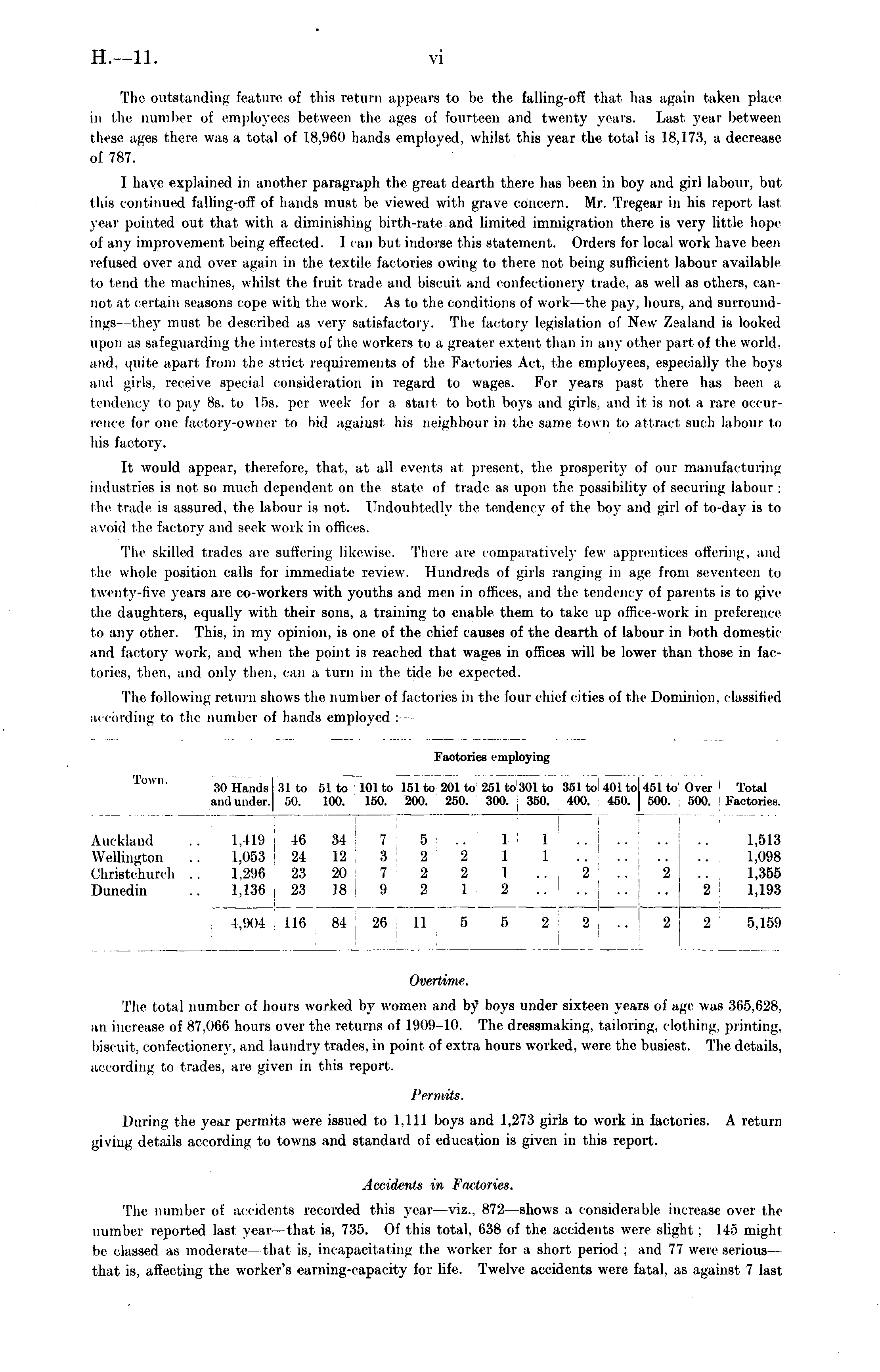 Overtime. The total number of hours worked by women and by boys under sixteen years of age was 365.628, an increase of 87.0(i(i hours over the returns of 1909-10. The dressmaking, tailoring, clothing, printing, biscuit, confectionery, and laundry trades, in point of extra hours worked, were the busiest. The details, according to trades, are given in this report. I'eniiils. During the year permits were issued to 1.111 boys and 1,273 girls to work in factories. A return giving details according to towns ami standard of education is given in this report. Accidents in Factories. The number of accidents recorded this year —viz.. 872—shows a considerable incrca.se over the number reported last year—that is, 735. Of this total. 638 of the accidents were slight : 145 might fie classed as moderate —that is, incapacitating the worker for a short period : and 77 were serious— that is, affecting the worker's earning-capacity for life. Twelve accidents were fatal, as against 7 last