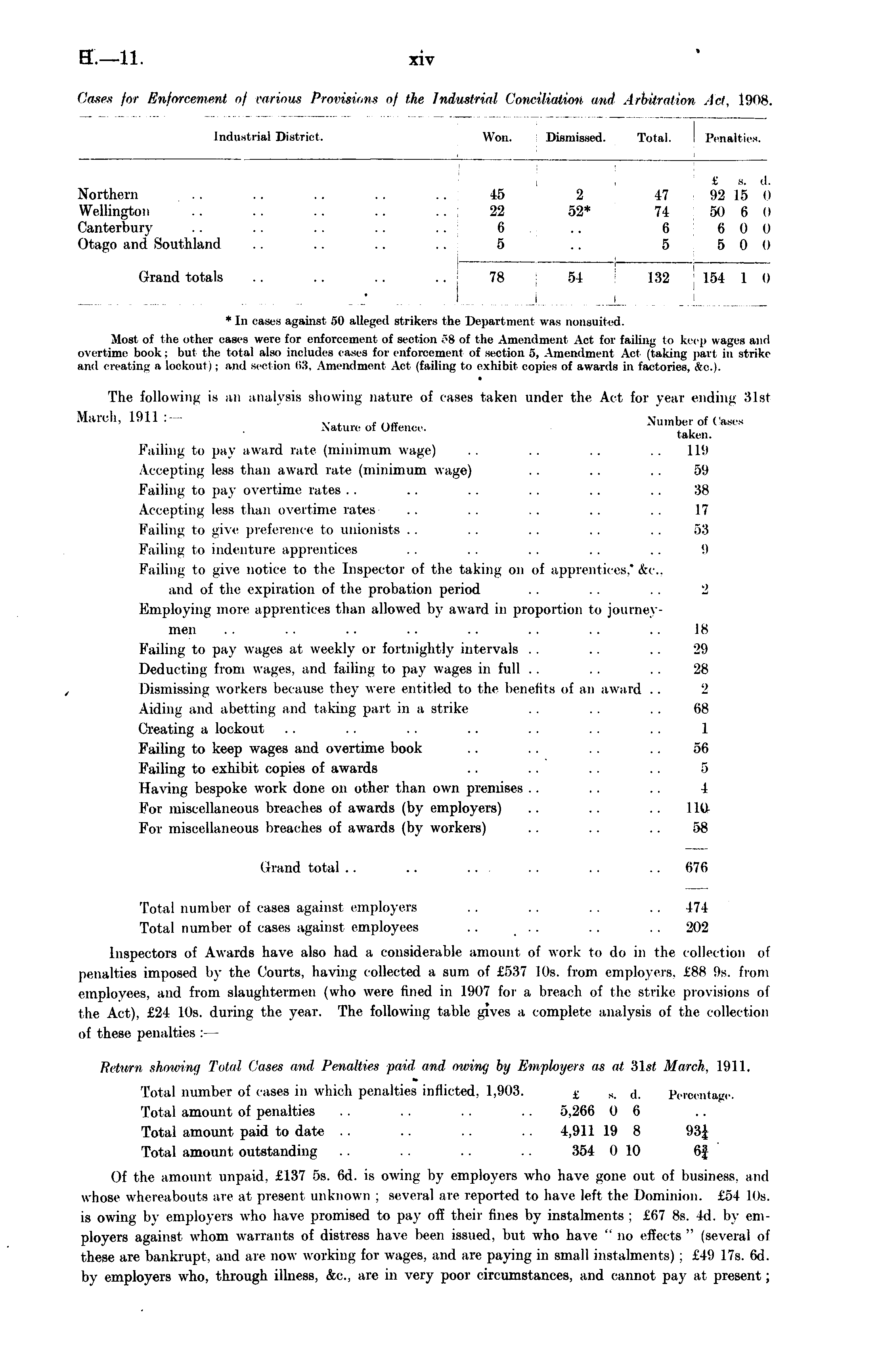 Most of the other cases were for enforcement of section 58 of the Amendment Act for failing to keep wages and overtime book: but the total also includes cases for enforcement of section 5, Amendment Act (taking part in strike and creating a lockout); and section 63. Amendment Act (tailing to exhibit copies of awards in factories. &c.). The following is an analysis showing nature of cases taken under the Act for year ending 31 si March, Mill : Number of Cases Mature ot (Jttence. . , taken. Failing to pay award rate (minimum wage) .. .. .. .. 119 Accepting less than award rate (minimum wage) .. .. .. 59 Failing to pay overtime rates .. .. .. .. .. .. 38 Accepting less than overtime rates .. .. .. .. .. 17 Failing to give preference to unionists .. .. .. .. . . 53 Failing to indenture apprentices .. .. .. .. .. 9 Failing to give notice to the Inspector of the taking on of apprentices* &c, and of the expiration of the probation period .. .. .. 2 Employing more apprentices than allowed by award ill proportion to journeymen .. .. .. .. .. .. .. .. 18 Failing to pay wages at weekly or fortnightly intervals . . . . . . 29 Deducting from wages, and failing to pay wages in full . . . . . . 28 Dismissing workers because they were entitled to the benefits of an award . . 2 Aiding and abetting and taking part in it strike .. . . . . 68 Creating a lockout .. .. .. .. .. .. 1 Failing to keep wages and overtime book .. .. .. 56 Failing to exhibit copies of awards .. .. .. 5 Having bespoke work done on other than own premises . . . . .. 4 For miscellaneous breaches of awards (by employers) .. .. .. I1U For miscellaneous breaches of awards (by workers) .. .. .. 68 Grand total .. .. .. .. .. 676 Total number of cases againsl employers .. .. .. .. 474 Total number of cases against employees .. .. .. . . 202 Inspectors of Awards have also had a considerable amount of work to do in the collection of penalties imposed by the. Courts, having collected a sum of £5:17 10s. from employers, £88 9s. from employees, and from slaughtermen (who were fined in 1907 for a breach of the strike provisions of the Act), £24 10s. during the year. The following table gives a complete analysis of the collection of these penalties : — Return showing Total Cases and Penalties paid and owing bij Employers as at 'Alst March, 1911. Total number of cases in which penalties inflicted, 1,903. _ s . ( |. Percentage. Total amount of penalties .. .. .. .. 5,266 0 6 Total amount paid to date .. .. .. 4,911 19 8 «.>3J Total amount outstanding . . .. 354 0 10 6f Of the amount unpaid, £137 5s. 6d. is owing by employers who have gone out of business, and whose whereabouts arc at present unknown : several arc reported to have left the Dominion. £54 10s. is owing by employers who have promised to pay off their fines by instalments ; £67 8s. 4d. by employers against whom warrants of distress have been issued, but who have " no effects " (several of these arc bankrupt, and are now working for wages, and are paying in small instalments) : £49 17s. 6d. by employers who, through illness, &c, are in very poor circumstances, and cannot pay at present;
