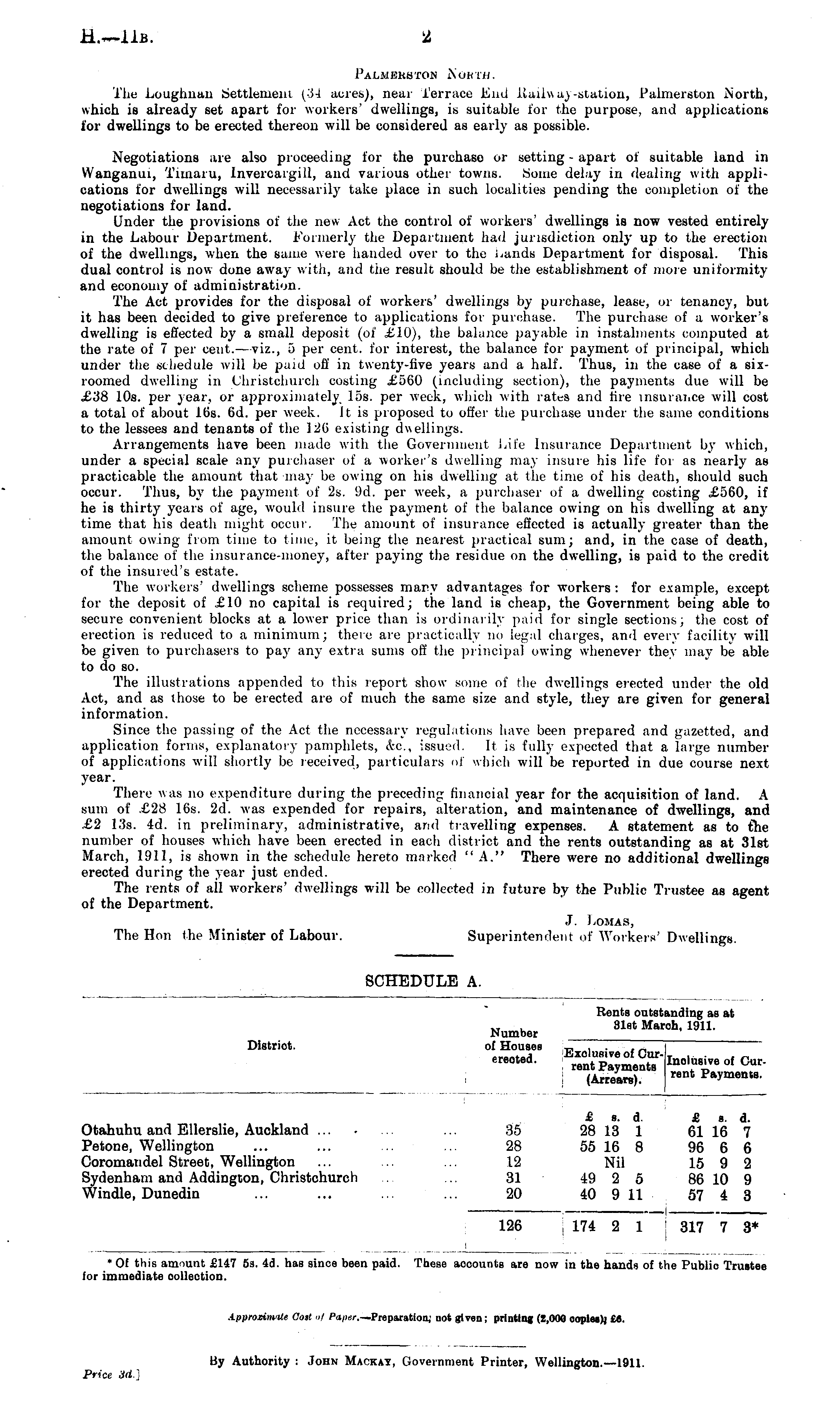 Palmhbston North. The Loughnan Settlement (34 acres), near Terrace End liailway-station, Palmerston North, which is already set apart for workers' dwellings, is suitable for the purpose, and applications for dwellings to be erected thereon will be considered as early as possible. Negotiations are also proceeding for the purchase or setting - apart of suitable land in Wanganui, Timaru, Invercargill, and various other towns. Home delay in dealing with applications for dwellings will necessarily take place in such localities pending the completion of the negotiations for land. Under the provisions of the new Act the control of workers' dwellings is now vested entirely in the Labour Department. Formerly the Department had jurisdiction only up to the erection of the dwellings, when the same were handed over to the i.ands Department for disposal. This dual control is now done away with, and the result should be the establishment of more uniformity and economy of administration. The Act provides for the disposal of workers' dwellings by purchase, lease, or tenancy, but it has been decided to give preference to applications for purchase. The purchase of a worker's dwelling is effected by a small deposit (of £10), the balance payable in instalments computed at the rate of 7 per cent. —viz., 5 per cent, for interest, the balance for payment of principal, which under the schedule will be paid off in twenty-five years and a half. Thus, in the case of a sixroomed dwelling in Christchurch costing £560 (including section), the payments due will be £38 10s. per year, or approximately. 15s. per week, which with rates and h're insurance will cost a total of about 16s. 6d. per week. It is proposed t<> olid , tin; purchase under the same conditions to the lessees and tenants of the 12G existing dwellings. Arrangements have been made with the Government Life Insurance Department by which, under a special scale any purchaser of a worker's dwelling may insure his life for as nearly as practicable the amount that m;i\ lie owing on his dwelling at the time of his death, should such occur. Thus, by the payment of 2s. 9d. per week, a purchaser of a dwelling costing £560, if he is thirty years of age, would insure the payment of the balance owing on his dwelling at any time that his death might occur. The amount of insurance effected is actually greater than the amount owing from time to time, it being the nearest practical sum; and, in the case of death, the balance of the insurance-money, after paying the residue on the dwelling, is paid to the credit of the insured's estate. The workers' dwellings scheme possesses many advantages for workers : for example, except for the deposit of £10 no capital is required; the land is cheap, the Government being able to secure convenient blocks at a lower price than is ordinarily paid for single sections; the cost of erection is reduced to a minimum; there are practically no legal charges, and every facility will be given to purchasers to pay any extra sums off the principal owing whenever they may be able to do so. The illustrations appended to this report show some of the dwellings erected under the old Act, and as those to be erected are of much the same size and style, they are given for general information. Since the passing of the Act the necessary regulations have been prepared and gazetted, and application forms, explanatory pamphlets, &c, issued. It is fully expected that a large number of applications will shortly be received, particulars r>f which will be reported in due course next year. There was no expenditure during the preceding financial year for the acquisition of land. A sum of £28 16s. 2d. was expended for repairs, alteration, and maintenance of dwellings, and £2 13s. 4d. in preliminary, administrative, and travelling expenses. A statement as to the number of houses which have been erected in eacli district and the rents outstanding as at 31st March, 1911, is shown in the schedule hereto marked " A." There were no additional dwellings erected during the year just ended. The rents of all workers' dwellings will be collected in future by the Public Trustee as agent of the Department. J. Lomas, The Hon the Minister of Labour. Superintendent of Workers' Dwellings.