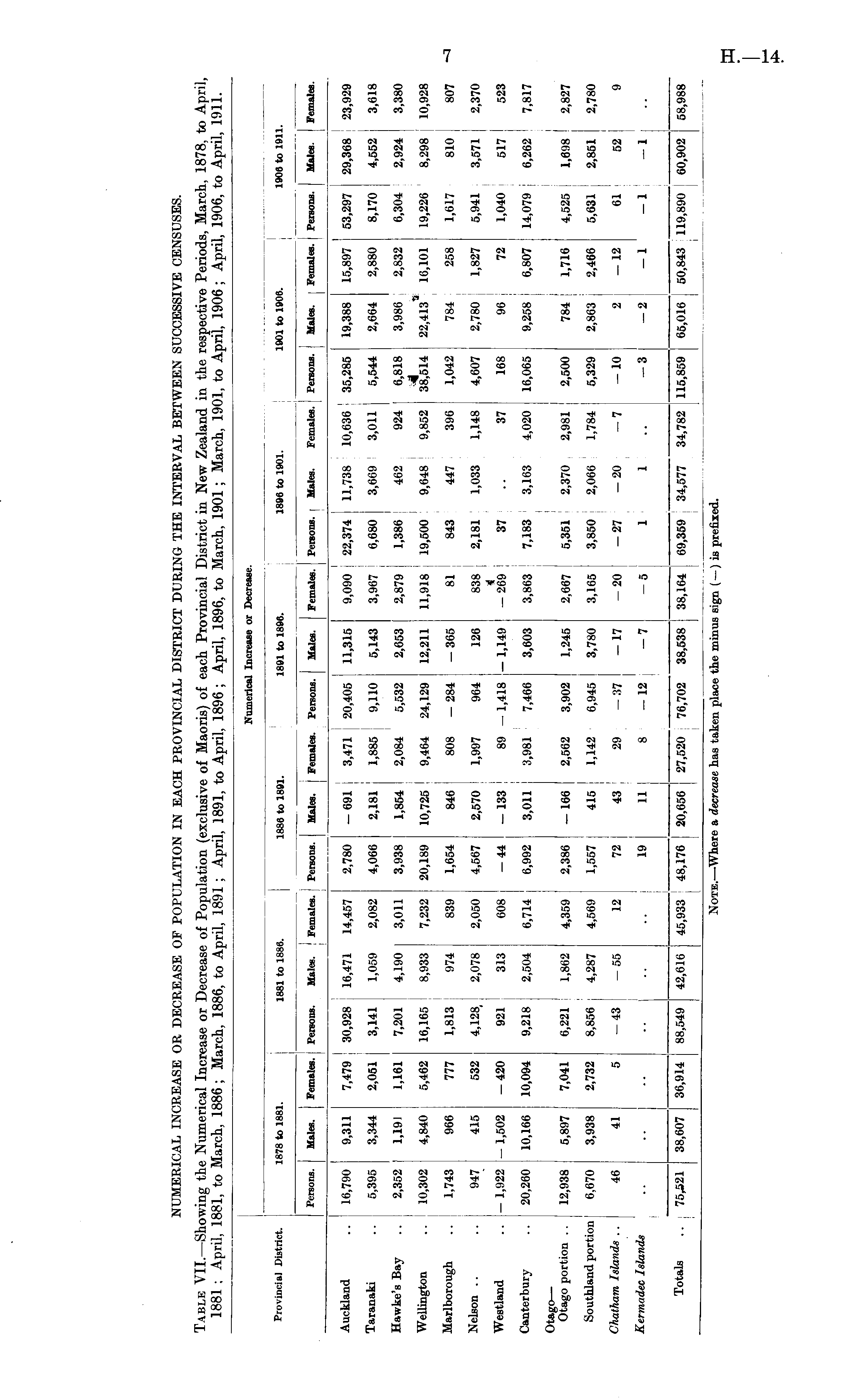 NUMERICAL INCREASE OR DECREASE OF POPULATION IN EACH PROVINCIAL DISTRICT DURING THE INTERVAL BETWEEN SUCCESSIVE CENSUSES. Table VII.—Showing the Numerical Increase or Decrease of Population (exclusive of Maoris) of each Provincial District in New Zealand in the respective Periods, March, 1878, to April, 1881; April, 1881, to March, 1886; March, 1886, to April, 1891; April, 1891, to April, 1896; April, 1896, to March, 1901; March, 1901, to April, 1906; April, 1906, to April, 1911.