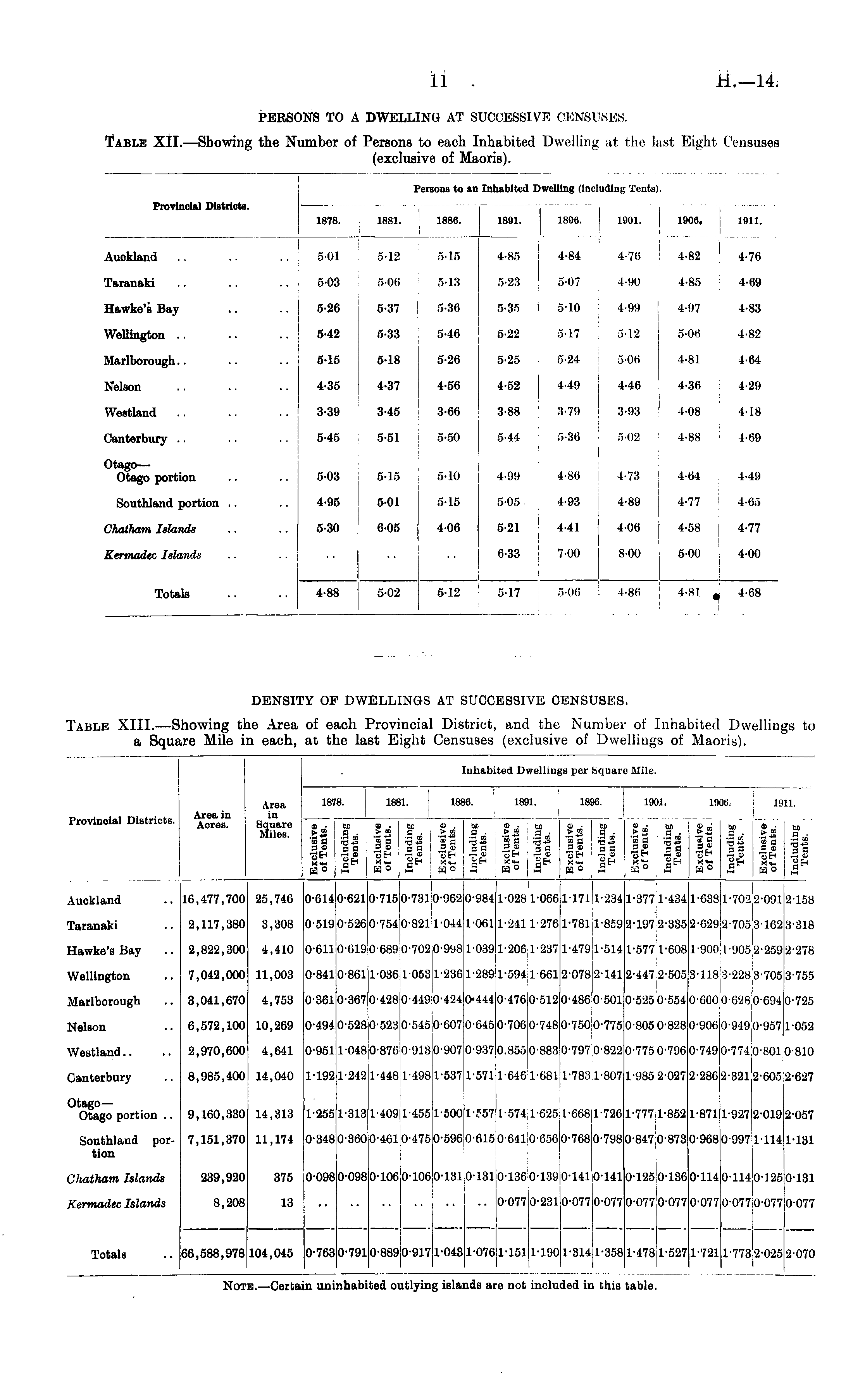 DENSITY OF DWELLINGS AT SUCCESSIVE CENSUSES. Table XIII.—Showing the Area of each Provincial District, and the Number of Inhabited Dwellings to a Square Mile in each, at the last Eight Censuses (exclusive of Dwellings of Maoris).