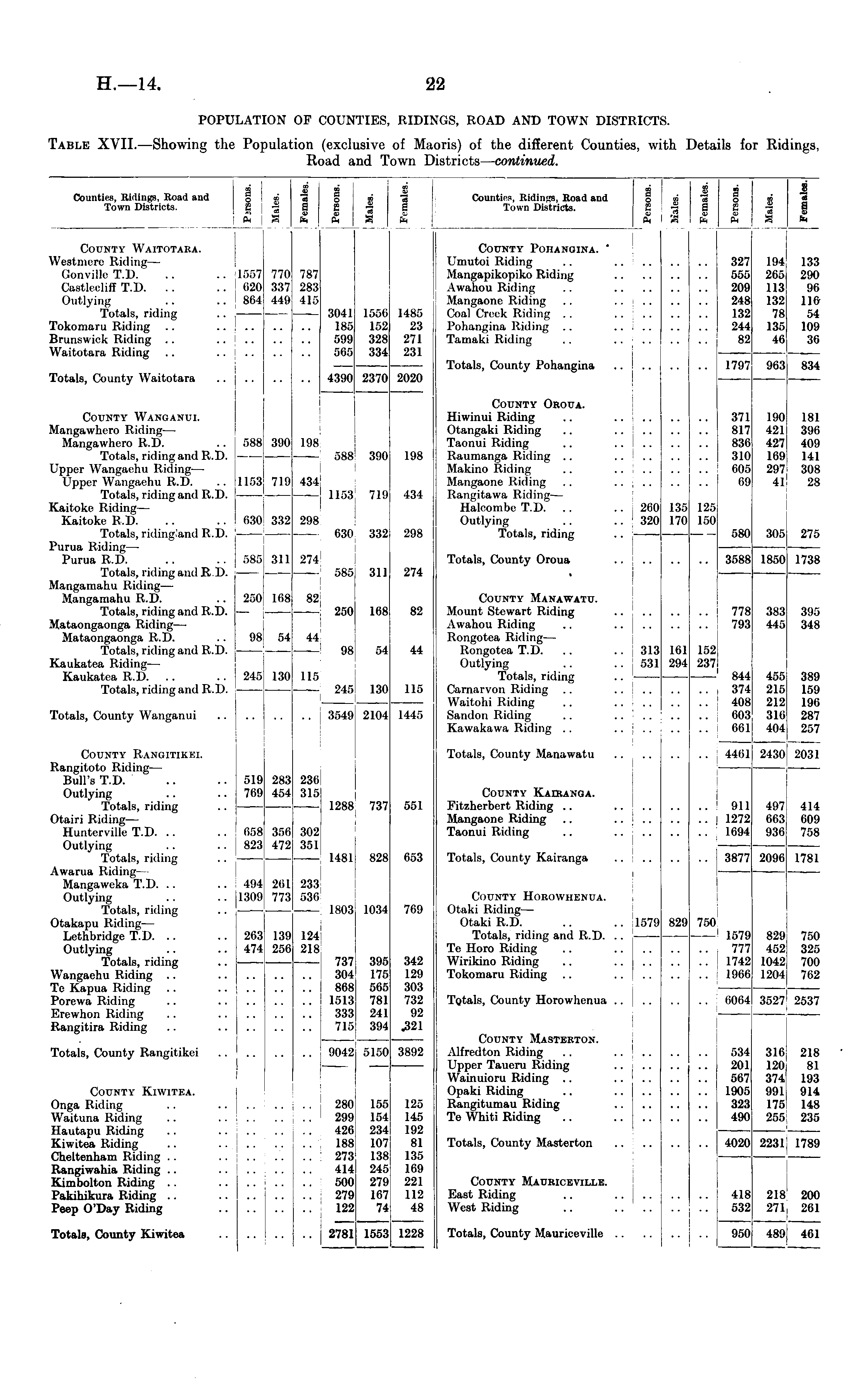 POPULATION OF COUNTIES, RIDINGS, ROAD AND TOWN DISTRICTS. Table XVII.—Showing the Population (exclusive of Maoris) of the different Counties, with Details for Ridings, Road and Town Districts— continued.