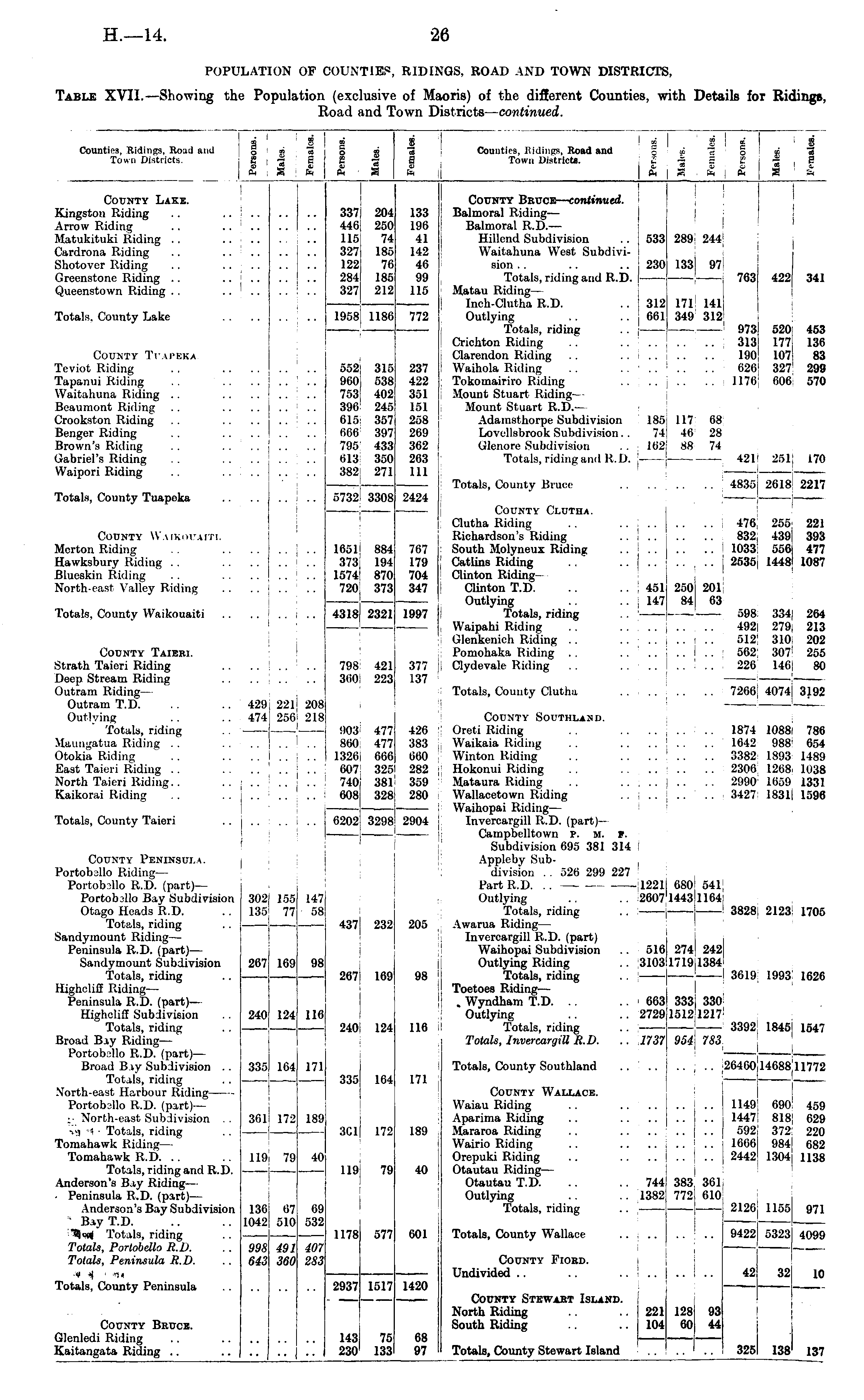 POPULATION OF COUNTIES, RIDINGS, ROAD AND TOWN DISTRICTS. Table XVII. —Showing the Population (exclusive of Maoris) of the different Counties, with Details for Ridings, Road and Town Districts — continued.
