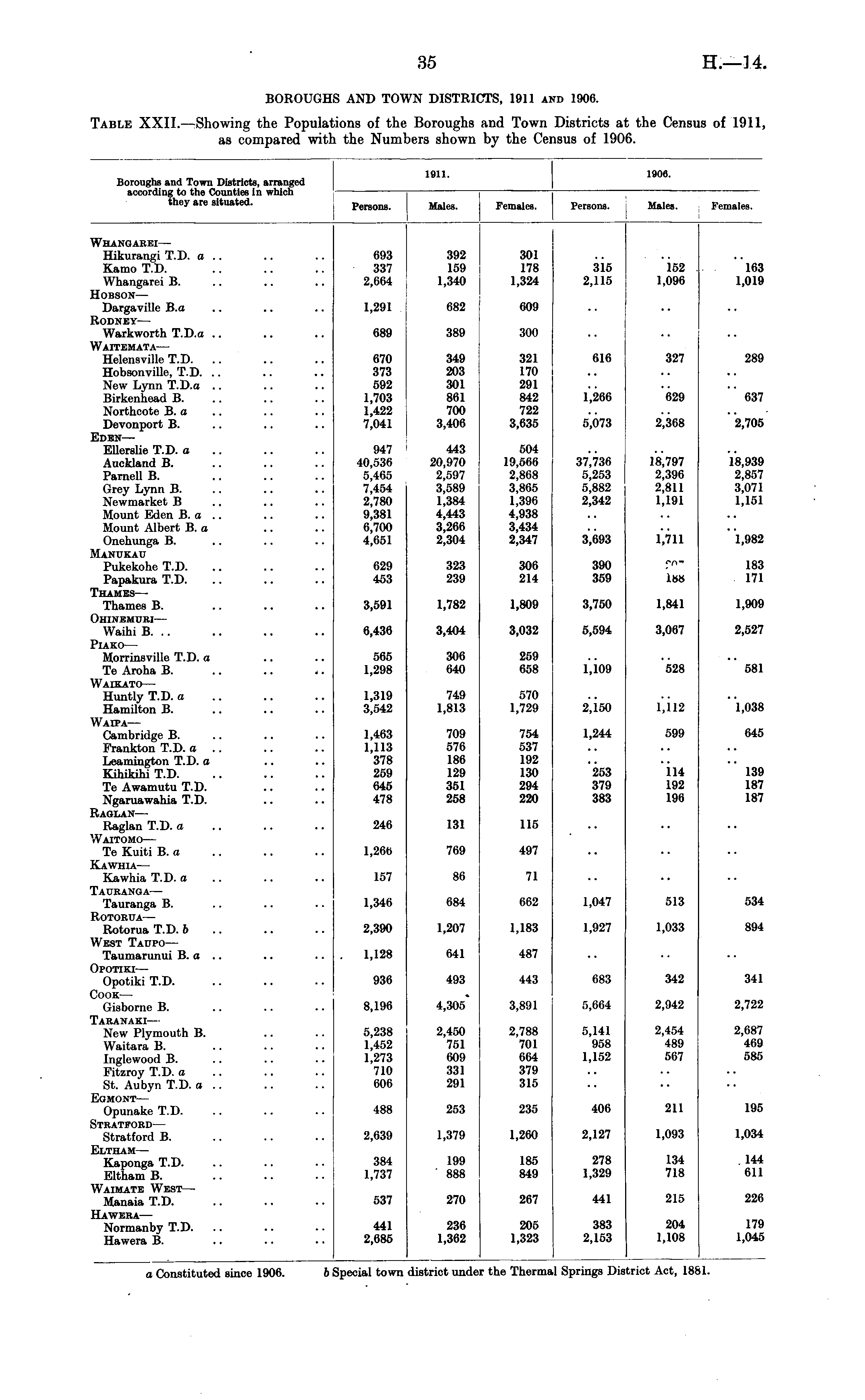 1911. 1906. Boroughs and Town Districts, arranged according to the Counties in which they are situated. Persons. Males. Females. Persons. Males. Females. Whangarei— Hikurangi T.D. a .. Kamo T.D. Whangarei B. Hobson — Dargaville B.a Rodney— Warkworth T.D.a .. Waitemata— Helensville T.D. .. Hobsonville, T.D. .. New Lynn T.D.a .. Birkenhead B. Northcote B. a Devonport B. Eden — Ellerslie T.D. a Auckland B. Parnell B. Grey Lynn B. Newmarket B Mount Eden B. a Mount Albert B. a Onehunga B. Manukau Pukekohe T.D. Papakura T.D. Thames— Thames B. OlIIN'KMUJU Waihi B. .. Piako — Morrinsville T.D. a Te Aroha B. 693 337 2,664 1,291 689 670 373 592 1,703 1,422 7,041 947 40,536 5,465 7,454 2,780 9,381 6,700 4,651 392 159 1,340 682 389 349 203 301 861 700 3,406 443 20,970 2,597 3,589 1,384 4,443 3,266 2,304 301 178 1,324 609 300 321 170 291 842 722 3,635 504 19,566 2,868 3,865 1,396 4,938 3,434 2,347 315 2,115 616 1,266 5,073 37,736 5,253 5,882 2,342 152 1,096 327 629 2,368 18,797 2,396 2,811 1,191 163 1,019 289 637 2,705 18,939 2,857 3,071 1,151 3,693 1,711 1,982 629 453 323 239 306 214 390 359 <-o188 183 171 3,591 1,782 1,809 3,750 1,841 1,909 6,436 3,404 3,032 5,594 3,067 2,527 565 1,298 306 640 259 658 l,i09 528 581 Waikato — Huntly T.D. a Hamilton B. 1,319 3,542 749 1,813 570 1,729 2,150 1,112 1,038 Waipa— Cambridge B. Frankton T.D. a .. Leamington T.D. a Kihikihi T.D. Te Awamutu T.D. Ngaruawahia T.D. Raglan— Raglan T.D. a Waitomo — Te Kuiti B. a 1,463 1,113 378 259 645 478 709 576 186 129 351 258 754 537 192 130 294 220 1,244 253 379 383 599 114 192 196 645 139 187 187 246 131 115 1,266 769 497 Kawhia — Kawhia T.D. a Tauranga— Tauranga B. Rotorua — Rotorua T.D. 6 West Taupo— Taumarunui B. a 157 1,346 86 684 71 662 1,047 513 534 2,390 1,207 1,183 1,927 1,033 894 1,128 641 487 Opotiki— Opotiki T.D. Cook— Gisborne B. Taranaki — New Plymouth B. Waitara B. Inglewood B. Fitzroy T.D. a St. Aubyn T.D. a .. Egmont— Opunake T.D. Stratford— Stratford B. Eltham — Kaponga T.D. Eltham B. Waimate West — Manaia T.D. Hawera — Normanby T.D. Hawera B. 936 8,196 5,238 1,452 1,273 710 606 488 493 4,305' 2,450 751 609 331 291 253 443 3,891 2,788 701 664 379 315 235 683 5,664 5,141 958 1,152 406 342 2,942 2,454 489 567 211 341 2,722 2,687 469 585 195 2,639 1,379 1,260 2,127 1,093 1,034 384 1,737 199 ' 888 185 849 278 1,329 134 718 144 611 537 270 267 441 215 226 441 2,685 236 1,362 205 1,323 383 2,153 204 1,108 179 1,045 a Constituted since 1906. 6 Special town district undei the Thermal Springs District Act, 1881.