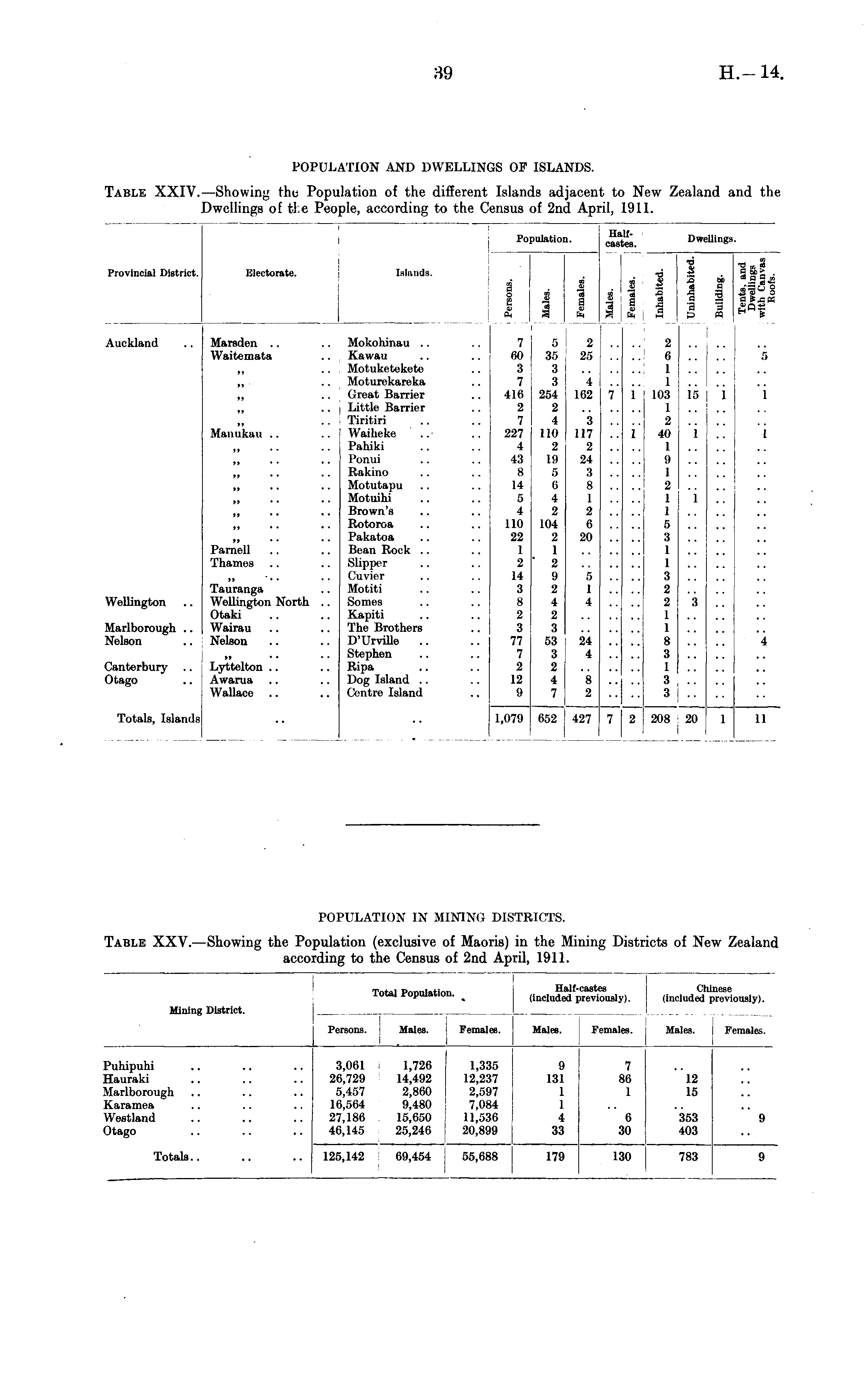 POPULATION AND DWELLINGS OF ISLANDS. Table XXIV.—Showing the Population of the different Islands adjacent to New Zealand and the Dwellings of the People, according to the Census of 2nd April, 1911.