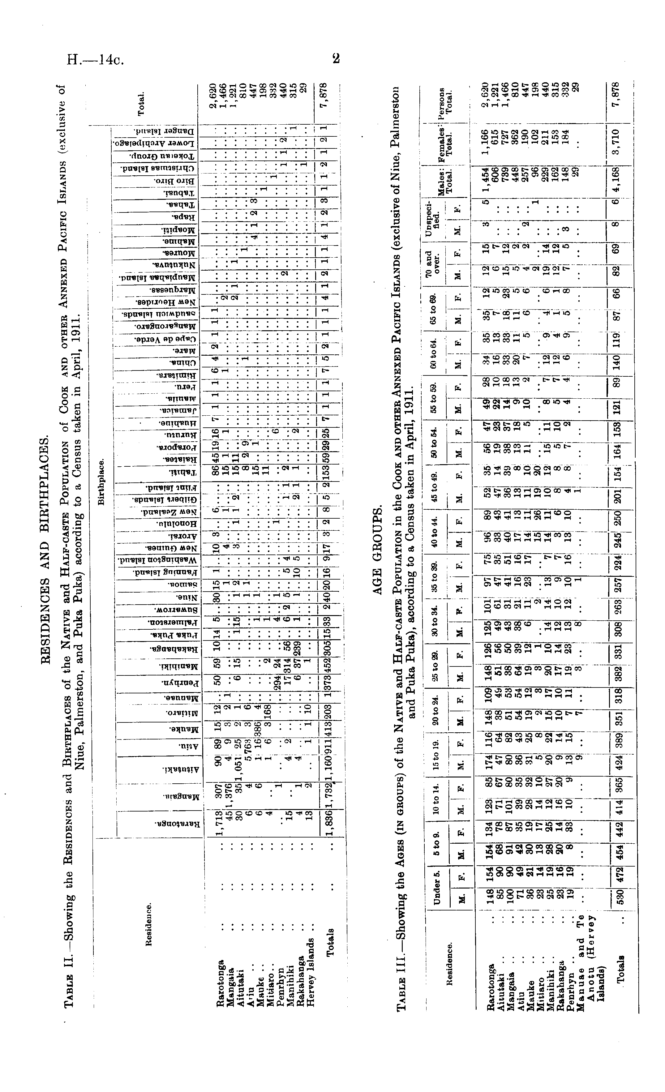 RESIDENCES AND BIRTHPLACES. Table II.-Showing the Residences and Birthplaces of the Native and Half-caste Population of Cook and other Annexed Pacific Islands (exclusive of Niue, Palmerston, and Puka Puka) according to a Census taken in April, 1911.