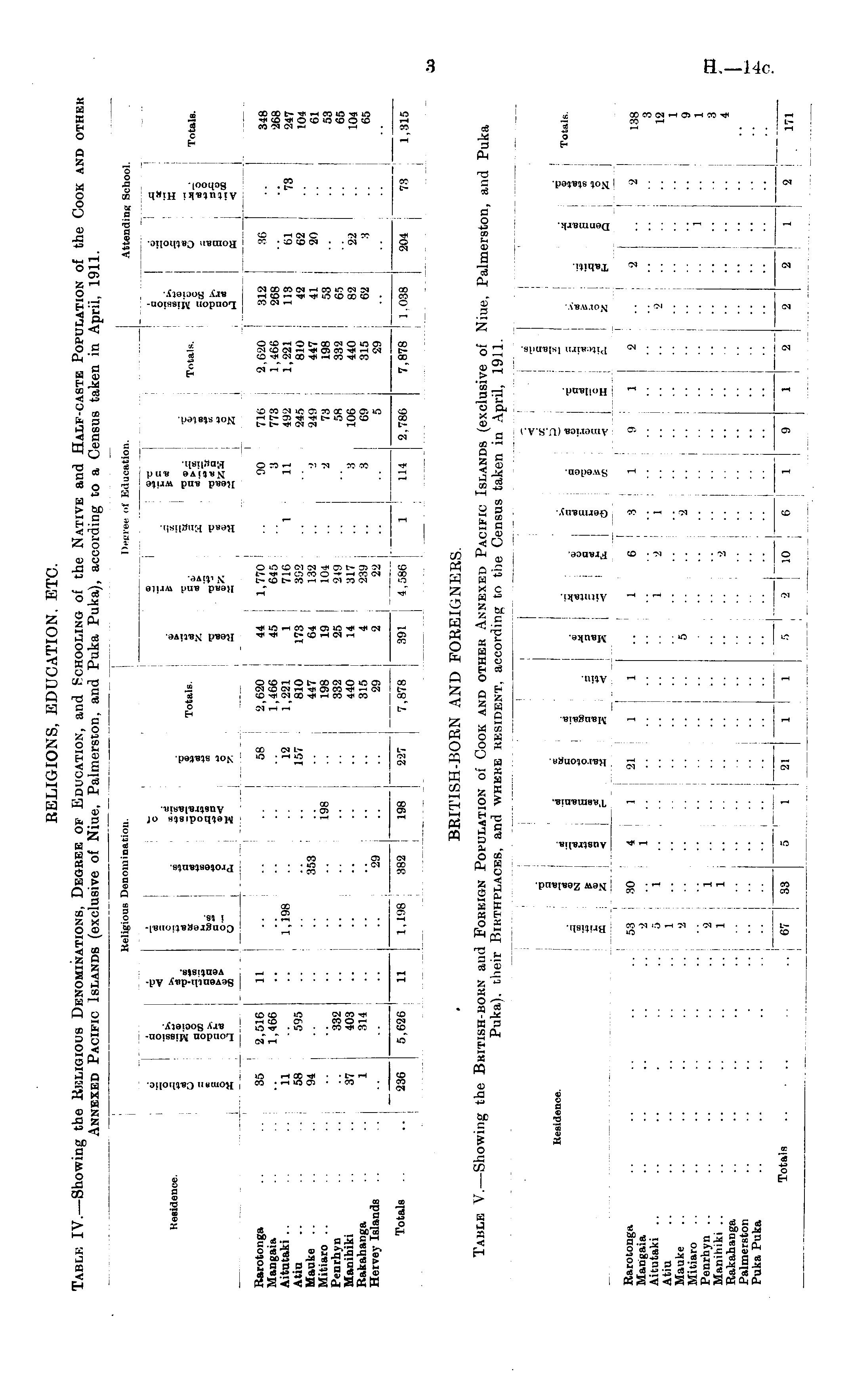 BRITISH-BORN AND FOREIGNERS. Table V.—Showing the British-born and Foreign Population of Cook and other Annexed Pacific Islands (exclusive of Niue, Palmerston, and Puka Puka), their Birthplaces, and where resident, according to the Census taken in April, 1911.