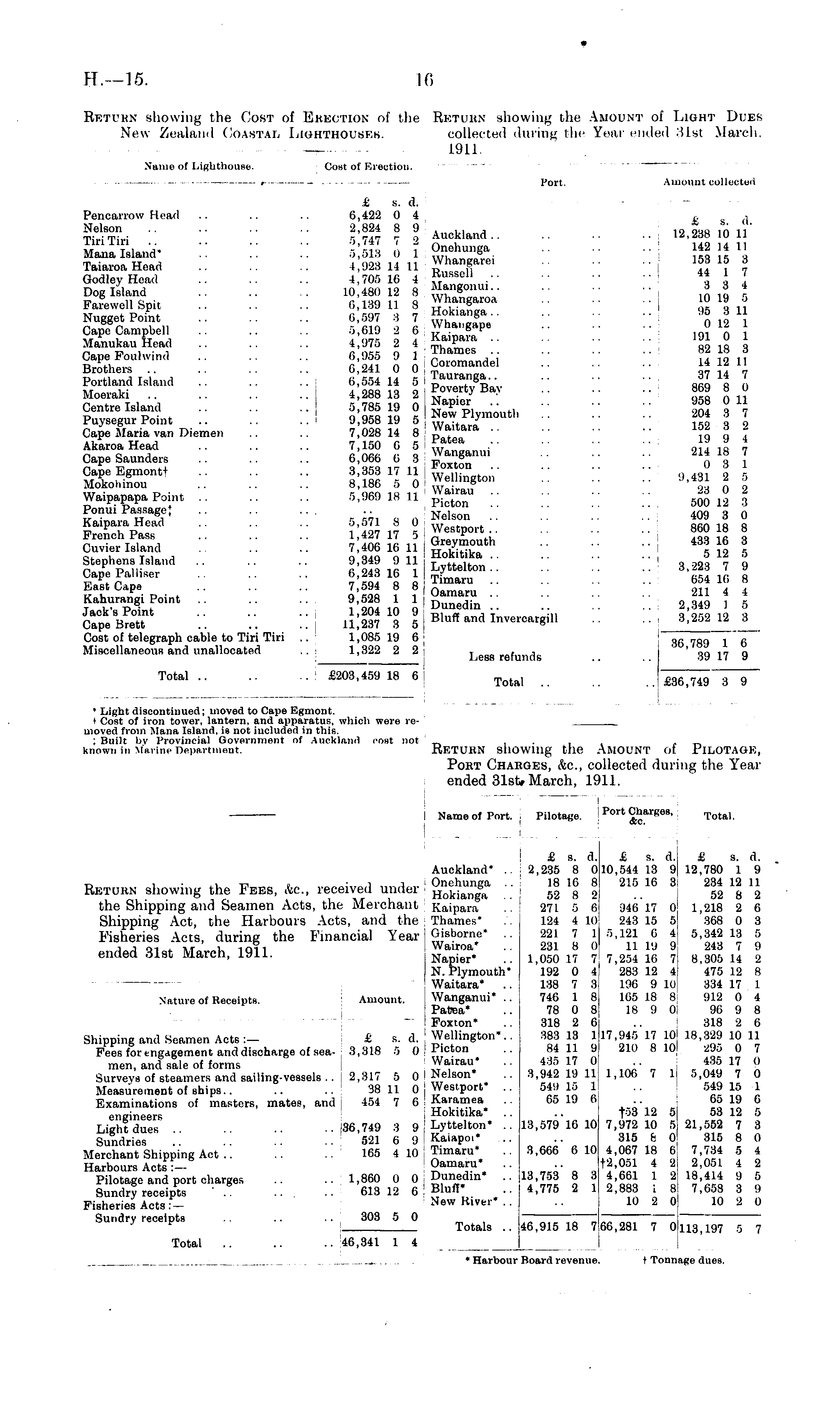 Name of Lighthouse. Cost of Erection. i s. a. Pencan-ow Head .. .. .. 6,422 0 4 Nelson .. .. .. .. 2,824 8 9 Tiri Tiri .. .. .. .. 5.7(7 7 2 Maim Island- .. .. .. 5,518 0 1 Taiaroa Head .. .. .. 1,928 1111 Godley Head .. .. .. 1.705 16 4 Dog Island .. .. .. 10,480 12 8 Farewell Spit .. .. .. 6, L89 11 S Nugget Point .. .. .. ii. :,', 17 3 7 Cape Campbell .. .. .. 5,619 t l> Manukau Head .. .. .. 1,975 2 4 Cape Foulwind .. .. .. 6,966 9 1 Brothers .. .. .. .. 6,241 0 0 Portland Island .. .. .. 6,554 14 5 Moeraki .. .. .. .. 4,288 13 2 Centre Island .. .. .. 5,785 19 0 Puysegur Point .. .. .. 9,958 19 5 Cape Maria van Dietnen .. .. 7,028 14 8 AkaroaHead .. .. .. 7,150 6 5 Cape Saunders .. .. .. 6,066 (i 3 Cape Egmontt .. .. .. 3,353 17 11 Mokoidnou .. .. .. 8,186 5 0 Waipapapa Point .. .. .. 5,969 18 11 Ponui Passage J .. .. Kaipara Head .. .. .. 5,571 8 0 French Pass .. .. .. 1,427 17 5 Cuvier Island .. .. .. 7,406 16 11 Stephens Island .. .. .. 9,349 9 11 Cape Pallieer .. .. .. 6,243 16 1 East Cape .. .. .. 7,594 8 8 Kahurangi Point .. .. .. 9,528 1 1 Jack's Point .. .. .. 1,204 10 9 Cape Brett .. .. .. 11,237 3 5 Cost of telegraph cable to Tiri Tiri .. 1,085 19 6 Miscellaneous and unallocated . 1,322 2 2 Total .. .. .. £203,459 18 6 ' Light discontinued; moved to Cape Egmont. + Cost of iron tower, lantern, and apparatus, which were removed from Maim Island, in not included in this. ; Built l>y Provincial Government of Auckland cost not known In Marine Department.