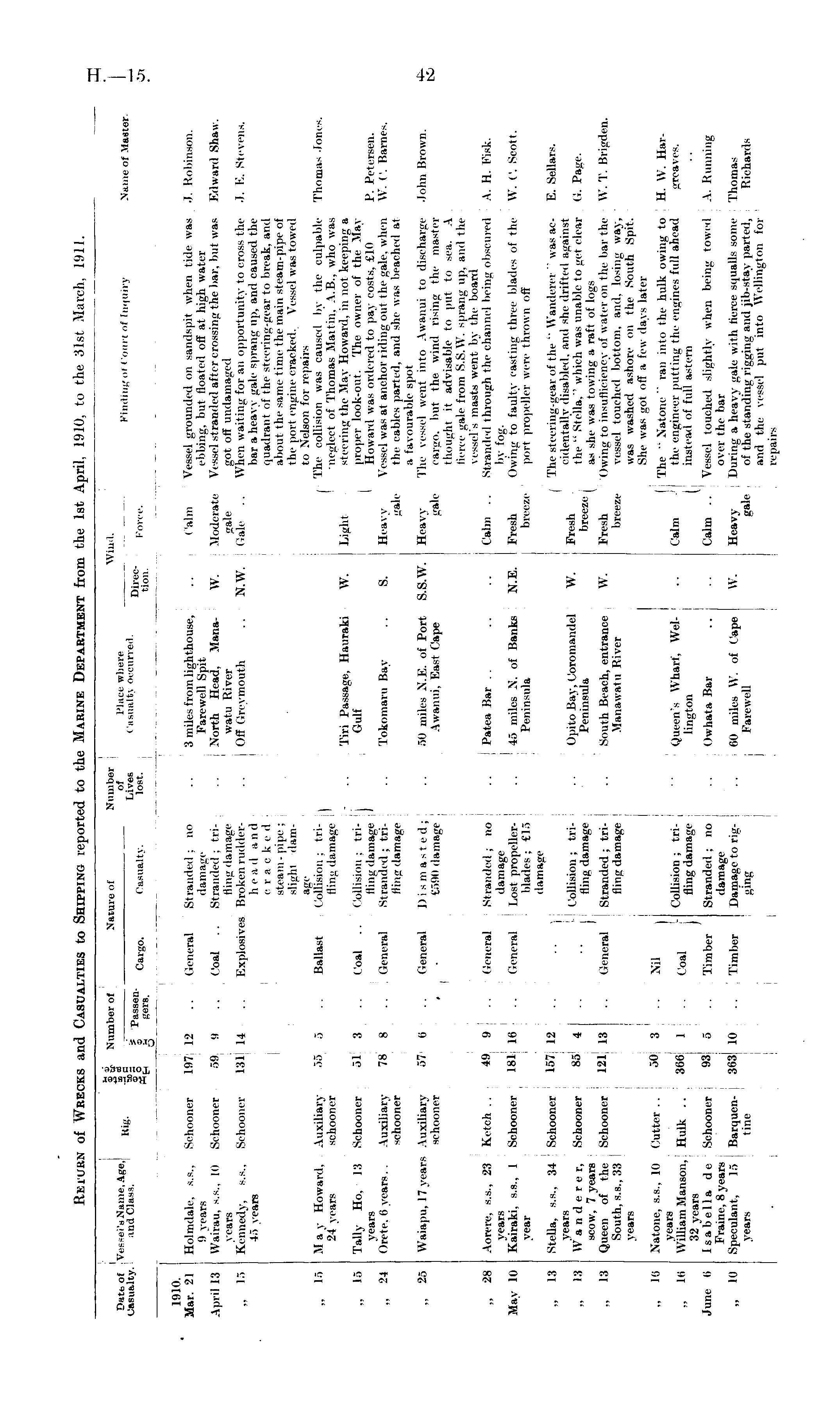 Datb of Casualty. a> er Number of Nature of Number i Wind. 7e "2Effi2:** »*■ |1 ~ Lives aJSSSESZ*. >•■„.«„«,.,«■„„„ »f .„„„„,. Nam.o«M«ter. «H J sere Cal 'S°- Casualty, lost. Force. Nature of 1010. Mar. 21 Holmdale, s.s.. Schooner 107 12 .. General Stranded; no .. 3 miles from lighthouse, .. Calm Vessel grounded on sandspil when tide was J. Robinson. 0 years damage Farewell Spit ebbing, but floated off at high water Waiiau. s.s.. Ill Schooner 59 9 .. Coal .. Stranded: tri- .. i North Head, Mana- W. Moderate Vessel stranded after crossing the bar, but was Edward Shaw. years Sing damage watu River gale got off undamaged Kennedy, s.s.. Schooner 131 14 .. Explosives Broken rudder- .. | Off Greymonth .. N.W. Gale .. When waiting for an opportunity to oross the J, E. Stevens. 4.~> years head and bar a heavy gale sprang up, and caused the cracked quadrant of the steering-gear to break, and steam- pipe ; about the same time the main steam-pipe of slight dam- the port engine cracked. Vessel was towed age to Nelson for repairs May Howard, Auxiliary 55 5 .. Ballast Collision; tri- , r The collision was caused by the culpable Thomas Jones. 24 years schooner Sing damage 'neglect of Thomas Maitin, A.B., who was Tiri Passage, Hauraki W. Light steering the May Howard, in not keeping a Tally Ho. 13 Schooner ol 3 .. Coal .. Collision; tri- Gulf proper look-out. The owner of the May years Iling damage ' Howard was ordered to pay costs, £10 P. Petersen. Orcte. (i years. . Auxiliary 78 8 .. General Stranded; tri- .. Tokomaru Hay .. S. Heavy Vessel was at anchor riding out the gale, when W.C.Barnes, -ehooner fling dam. gale the cables parted, and she was beached at a favourable spot Waiapu, 17 years Auxiliary 57 6 .. General Dismasted; .. ~>0 miles N.E. of Port S.S.W. Heavy The vessel went into Awanui to discharge John Brown. schooner , • £590 damage Awanui, East Cape gale cargo, but the wind rising the master thought it advisable to put to sea. A fierce gale from S.S.W. sprang up, and the vessel's masts went by the board Aorere. s.s., 23 Ketch .. 40 o .. General Stranded; no .. ! Patea Bar .. .. .. Calm .. Stranded through the channel being obscured A. H. Kisk. years damage by fog. Kairaki, s.s., I Schooner 181 16 .. General Lost propeller- .. 45 miles N. of Banks N.E. Fresh Owing to faulty easting three blades of the W. C. Scott. year blades: £16 Peninsula breeze port propeller were thrown ofi damage Stella, s.s., :i4 Schooner 167 12 .... ( The steering-gear of the" Wanderer " was ac- K. Scllars. years , ,,- . . ,. . „ ,, , , ,,, . eidentaUy disabled, and she drifted against Wanderer, Schooner S3 4 .. .. CoUision ; tri- .. Opito Bay Coromandel W. Fresh the " SteluFwhich was unable to get clear G. Page. scow, 7 years dama « e Peninsula breeze | g a nH of , ogs Queen of the Schooner 121 13 .. General Stranded; tri- ' .. South Beach, entrance , W. Fresh Owing to insufficiency of water on the bar the \V. T. Brigden. South, s.s., 33 fling damage Manawatu River breeze vessel touched bottom, and. losing way, years was washed ashore on the South Spit. She was got off a few days later Xatone, s.s., 10 Cutter.. M 3 .. Nil . I The " Natone" ran into the hulk owing to H. W. Harluir™ ii h u 'ii;i; i ,, ■ Collision; tri- Queen's Wharf. Wei- .. Calm ■■' the engineer putting the .engines full ahead greaves. William Manson, Hulk .. joo i .. Lo al , fling damage lington I instead of full astern Isabella de Schooner 03 .1 .. Timber Stranded; no .. Owhata Bar .. .. Calm .. Vessel touched slightly when being towed A. Running Fraine, 8 years damage over the bar Speculant, 15 Barquen- 3H3 10 .. Timber Damage to rig- .. 60 miles W. of Cape W. Heavy During a heavy gale with fierce squalls some Thomas years tine ging Farewell gale , of the standing rigging and jib-stay parted, Richards and the vessel put into Wellington for ' repairs April 13 .. 15 15 16 24 >t 25 „ 28 May 10 „ 13 „ 13 ., 13 ., 10 „ 1« June (i „ 10 W.