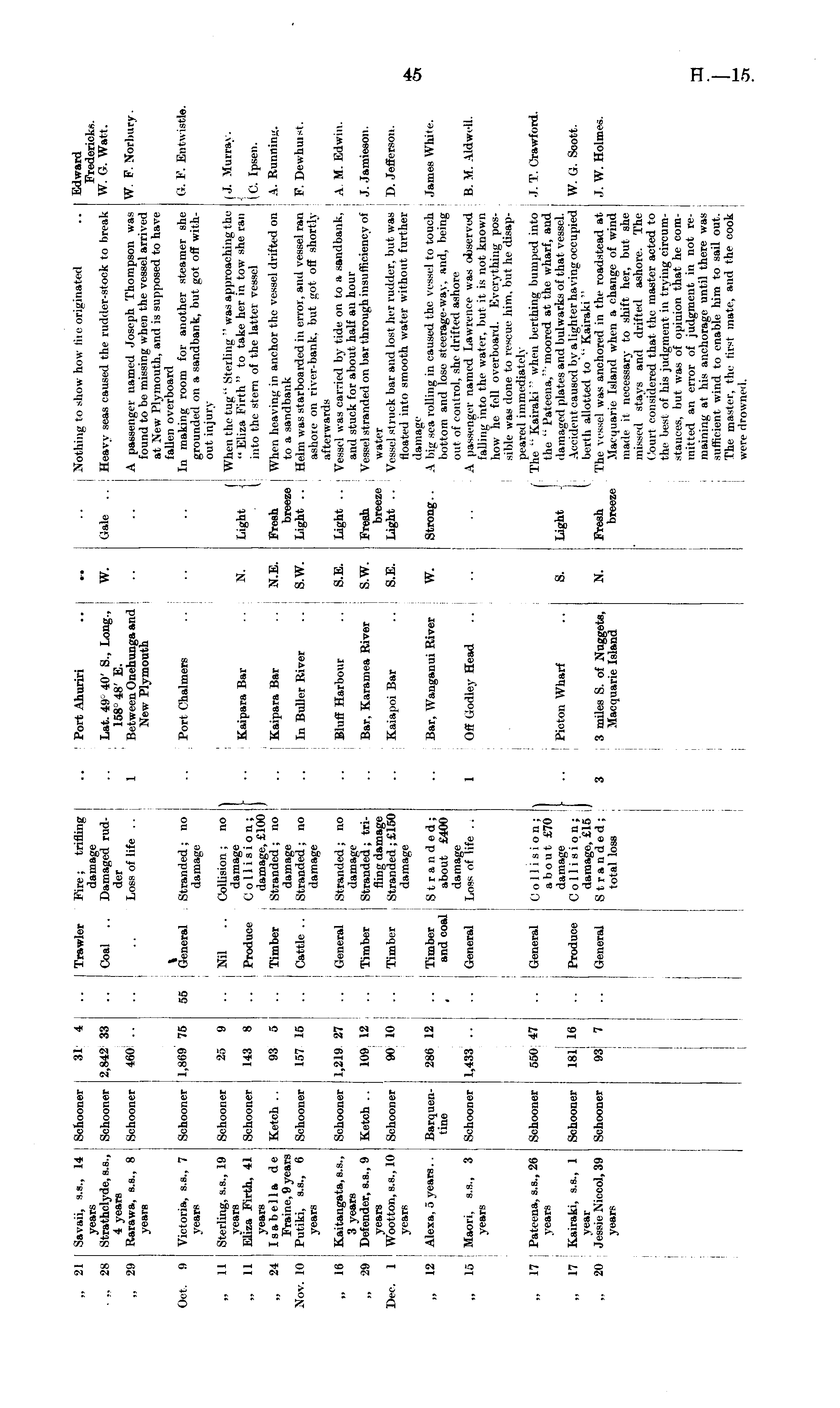 „ 21 Savaii, s.s., 14 years ., 28 Strathclyde, s.s., 4 years „ 29 Rarawa, s.s., 8 years Schooner 31 4 Trawler Fire; trifling damage Damaged rudder Loss of life .. 1 Port Ahuriri .. .. Lat. 49 40' 8., Long., W. 158' 48' E. Between Onehunga and New Plymouth Nothing to show how Sre originated .. Edward Fredericks. Gale .. Heavy seas caused the rudder-stock to break W. G. Watt. Schooner 2,842 33 Coal .. Schooner 460 .. A passenger named Joseph Thompson was W. F. Nbrlmry. found to be missing when the vessel arrived at New Plymouth, and is supposed to have fallen overboard In making room for another steamer she G. F. Entwistie grounded on a sandbank, but got off without injury Oct. 9 Victoria, s.s., 7 years Schooner 1,869 75 .")"> General Stranded ; no damage Port Chalmers „ 11 Sterling, s.s., 19 years „ 11 Eliza Firth, 41 years „ 24 Isabella de Fraine, 9 years Nov. 10 Putiki, s.s., 6 years Schooner 25 9 Nil .. Collision ; no K damage Collision; I damage, £100 J Stranded ; no damage Stranded; no damage Kaipara Bar .. N. Kaipara Bar .. I N.E. In Buller Eiver .. S.W. I When the tug" Sterling " was approaching the |.J. Murray. Light -i "Eliza Firth" to take her in tow she ran J ( into the stern of the lattei vessel (C. Ipsen. Schooner 143 8 Produce Ketch .. 93 5 Timber Cattle .. Fresh When heaving in anchor the vessel drifted on A. Running, breeze to a sandbank Light .. Helm was starboarded in error, and vessel ran F. Dewhuist. ashore on river-bank, but got off shortly afterwards Light .. ' Vessel was oarried by tide on to a sandbank. A M. Edwin. and stuck for about half an hour Fresh Vessel stranded on bar through insufficiency of .J. Jainieson. breeze wat or Light .. Vessel struck bar and lost her rodder, but was D. Jefferson. floated into smooth water without further damage Strong. . A big sea rolling in caused the vessel to touch James White. bottom and lose steerage-way, and, being out of control, she drifted ashore A passenger named Lawrence was observed B. M. Aldwell. falling into the water, but it is not known how he fell overboard. Everything possible was done to rescue him, but he disappeared immediately /' The " Kairaki " when berthing bumped into J. T. Crawford, the ' : Pateona,"' moored at the wharf, and Light -'. damaged plates and bulwarks of that vessel. Accident caused by a lighter having occupied W. G. Scott. I berth allotted to "Kairaki" Fresh The vessel was anchored in the roadstead at J. W. Holmes, breeze Uaequarie Island when a change of wind made it necessary to shift her, but she missed stays and drifted ashore. The Court considered that the master acted to the best of his judgment in trying circumstances. Init was of opinion that he committed an error of judgment in not remaining at his anchorage until there was sufficient wind to enable him to sail out. j The master, the first mate, and the cook j Schooner 157 15 „ 16 Kaitangata, s.s., 3 years „ 29 Defender, s.s., 9 years Dec. 1 Wootton, s.s., 10 Schooner 1,219 27 General Stranded; no damage Stranded; trifling damage Stranded; £150 damage Bluff Harbour .. S.E. Bar, Karamea River S.W. Kaiapoi Bar .. S.E. Ketch .. 109 12 Timber Schooner 90 10 Timber years ,, 12 Alexa, 5 years.. Barquentine 286 12 Timber and coal Stranded; about £400 damage Loss of life .. 1 Bar, Wanganui River W. Off Godley Head „ 15 Maori, s.s., 3 years * Schooner 1,433 .. General „ 17 Patoena, s.s., 26 years Schooner 550 47 ! General ,, 17 Kairaki, s.s., 1 year „ 20 Jessie NioooL 39 Schooner 181 16 93 7 Produce Collision; about £70 damage Collision; damage, £15 Stranded; total loss 3 Picton Wharf .. S. 3 miles S. of Nuggets, N. Macquarie Island S. Schooner General N. years