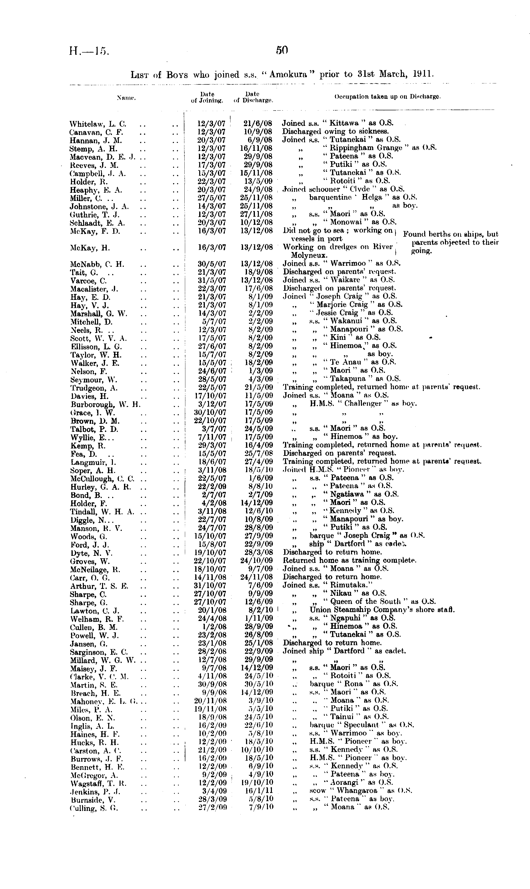 Nh me. of EtaSng. ,.f jffiarge. Occupation taken up on Discharge. Whitelaw, U C. .. < lanavan, C F. Hannan, J. M. Stein p, A. H. Macvean, I). F.. .1. . . Beeves, J. M. Campbell, .1. A. Holder. R. Heaphy. E. A. Miller, C. .. Johnstone, J. A. Guthrie, T. J. Schlaadt, E. A. McKay, F. D. McKay, H. MoNabb, c. II. Tait, G. .. Varcoe, C. Macalistci. .1. Hay, E. U. Hay, V. J. Marshall, G. W. .. Mitchell, T>. Neels, R. .. Scott, \V. V. A. ESlisson, L. G. Taylor, W. H. Walker, J. K. Nelson, F. Seymour, \\. Trndgeon, A. Uavies, H. Kurborough, W. H. Grace, I. W. Brown, D. M. Talbot, P. D. Wyllie, E... Kemp, R. Fea, D. .. Langmuir, 1. Soper, A. H. McCullough, (.'. (.'. Burley, G. A. K. .. Bond, B. .. Holder, V. Tindall, W. H. A. . . Uiggle, N... Manson, K. V. Woods, Q, Ford, J. J. Dyte, N. V. Groves, W. \lr\iilage, l<. Carr, 0. G. Arthur, T. S. E. .. Sharpe, C. Sharpe, (!. Lawton, C. J. Welham, R. F. Culleu, B. M. Powell, W. J. •Jansen, i i. Sarginson, E. C. Millard, W. G. \V. .. Maisey, J. F. Clarke. V. C. M. .. Martin, 8. E. Breach, H. E. Mahonoy. E. I.. Q. .. Miles, P. A. Olson. K. N. illL'lis. A. I,. Haincs, H. I ,, . Huoks, i:. II. Careton, A. C. Burrows, J. I ,, . Bennett, H. E. Mol Iregor, A. i at)'. T. B. Jenkins, P. .1. Burnride, V. Culling, S. (I. 12/3/07 21/6/08 Joined s.s. " Kittawa " as O.S. 12/3/07 10/9/08 Discharged owing to sickness. 20/3/07 (>/!)/08 Joined s.s. " Tutanekai " as 0.8. 12/3/07 16/11/08 „ " Rippingham Grange " as O.S. .. I 12/3/07 29/9/08 „ " Pateena " as O.S. 17/3/07 29/9/08 „ " Putiki" as O.S. 1.V3/O7 15/11/08 ., " Tutanekai" as O.S. 22/3/07 13/5/09 .. " Rotoiti " as O.S. 20/3/07 24/9/08 Joined schooner " CJvde " as O.S. 27/5/07 25/11/08 „ barquentine ' Hclga" as O.S. 14/3/07 25/11/08 „ „ .. as boy. 12/3/07 27/11/08 „ 8.8. "Maori : 'as O.S. 20/3/07 10/12/08 „ „ " Monowai " as O.S. 16/3/07 13/12/08 Did not go to sea ; working on , Fouml buJ ,„, ,„„ ■ .,,,-.„>, \ cssels in port. parents objeoted to their 16/3/07 13/12/08 Working on dredgee on River. , yQ \ ne Molyneux. 30/5/07 13/12/08 Joined 8.8. " Warrimoo " as O.S. 21/3/07 18/9/08 Discharged on parents'request. Sl/5/07 13/12/08 Joined 8.S. " Waikare " as 0.8. 22/3/07 17/6/08 Discharged on parente' request. 21/3/07 8/1/09 Joined K Joseph Craig " as O.S. 21/3/07 8/1/09 „ '• Marjorie Craig " as O.S. 14/3/07 2/2/09 .. " Jessie Craig " as O.S. .. ! 5/7/07 2/2/09 „ s.s. " Wakanui"' as O.S. 12/3/07 8/2/09 .. .. " Manapouri " as O.S. 17/5/07 8/2/09 .. .. ■ Kini ' as O.S. 27/6/07 8/2/09 „ „ " Hinemoa," as 0.8. 15/7/07 8/2/09 „ „ .. aslxn. 15/5/07 18/2/09 „ „ " Te Anau " as 0.8. 24/6/07 1/3/09 „ ,. " Maori " as O.S. 28/5/07 4/3/09 „ „ " Takapunii " as O.S. 22/5/07 21/5/0!) Training completed, returned home at parents' request. 17/10/07 11/5/09 Joined s.s. li Moana " as O.S. 3/12/07 17/5/09 „ E.M.S. " Challenger " as boy. 30/10/07 17/5/09 22/10/07 17/5/09 3/7/07 24/5/09 .. s.s. " Maori " as O.S. 7/11/07 17/5/09 „ „ " Hinemoa" as boy. 29/3/07 16/4/09 Training completed, returned home, at parr-ntis' request. 15/5/07 25/7/08 Discharged on parents' request. 18/6/07 27/4/09 Training completed, returned home at parent*' request. 3/11/08 18/5/10 Joined H.M.S. " Pioneer " as boy. 22/5/07 1/6/09 ,. s.s. " Pateena " as O.S. 22/2/09 8/8/10 .. .. " Pateena " ae O.8. 2/7/07 2/7/09 .. ,. " Ngatiawa" as O.S. 4/2/08 14/12/09 „ ,. " Maori" as O.S. .. : 3/11/08 12/6/10 ., .. "Kennedy"as 0.8. 22/7/07 10/8/09 .. .. " Manapouri" as boy. 24/7/07 28/8/09 „ „ " Putiki" as O.S. 15/10/07 27/9/09 „ barque " Joseph Craig" as U.S. 15/8/07 22/9/09 „ ship " Dartfonl " as oadeS. 19/10/07 28/3/08 Discharged to return home. 22/10/07 24/10/09 Returned home as training complete. 18/10/07 9/7/09 Joined s.s. " Moana " as O.S. 14/11/08 24/11/08 Discharged to return home. 31/10/07 7/6/09 Joined s.s. " Rimutaka." 27/10/07 9/0/09 „ „ " Nikau" as O.S. 27/10/07 12/6/09 „ „ " Queen of the South " as O.S. 20/1/08 8/2/10 I „ Union Steamship Company's shore stall. 24/4/08 1/11/09 „ s.s. " Ngapuhi " as O.S. 1/2/08 28/9/09 - „ „ " Hinemoa" as O.S. 23/2/08 26/8/09 „ „ " Tutanekai" as O.S. 23/1/08 25/1/08 Discharged to return home. 28/2/08 22/9/09 Joined ship " Dartford " as oadet. 12/7/08 29/9/09 9/7/08 14/12/09 „ s.s. " Maori " as O.S. 4/11/08 24/5/10 .. .. •'Rotoiti " as O.S. 30/9/08 30/5/10 .. barque " Rona " as O.S. 9/9/08 14/12/09 .. s.s. " Maori " as O.S. 20/11/08 3/9/10 .. .. " Moana " as O.S. 19/11 (IK 5/5/10 .. .. " Putiki" as 0.8. 18/9 '(is 24/5/10 .. .. " Tainui " as O.S. Iβ 2 09 l>1 , 6/10 .. barque " Speculant " as U.S. 10/2/09 .i 8 10 .. s.s. " Warnmoo" as boy. ... , 12/2/09 18/6/10 ,. ELM.8. " Pioneer " as boy. 21/2/09 10/10/10 .. S.S. " Kennedy " as O.8. 16/2/09 18/5/10 .. H.M.S. " Pioneer " as boy. 12/2/09 6/9/10 .. s.s. ■■ Kennedy " as U.S. ' 9/2/09 ; 4/9/10 .. .. " Pateena " as boy. l2/2/O!i in 10/10 .. .. "Aoiangi " as O.S. 3/4/09 10/1/11 .. scow " Whangaroa " as O.S. 28/3/09 5/8/10 ., s.s. " Pateena " as boy. 27/2/09 7/9/10 „ „ " Moana " as 0.8.