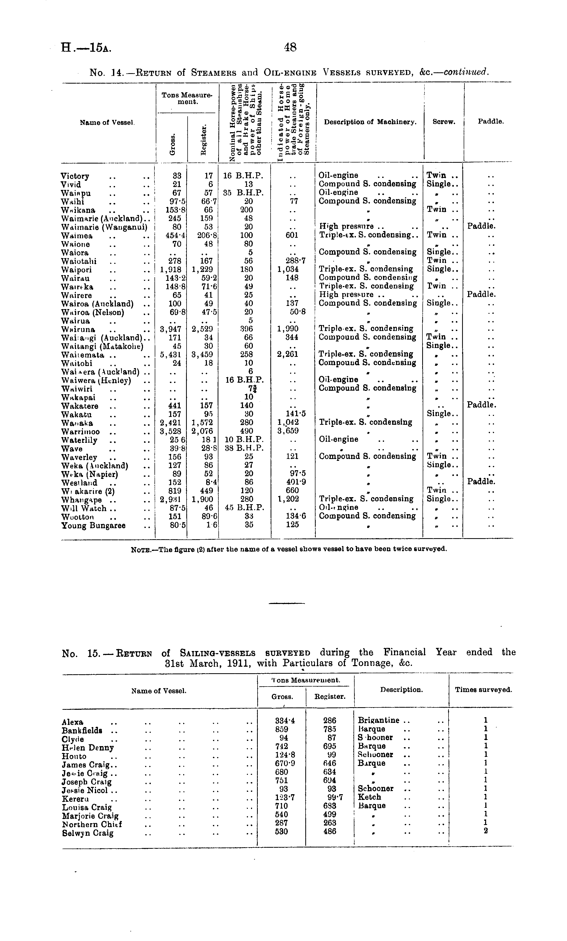 No. 15.—Return of Sailing-vessels surveyed during the Financial Year ended the 31st March, 1911, with Particulars of Tonnage, &c.
