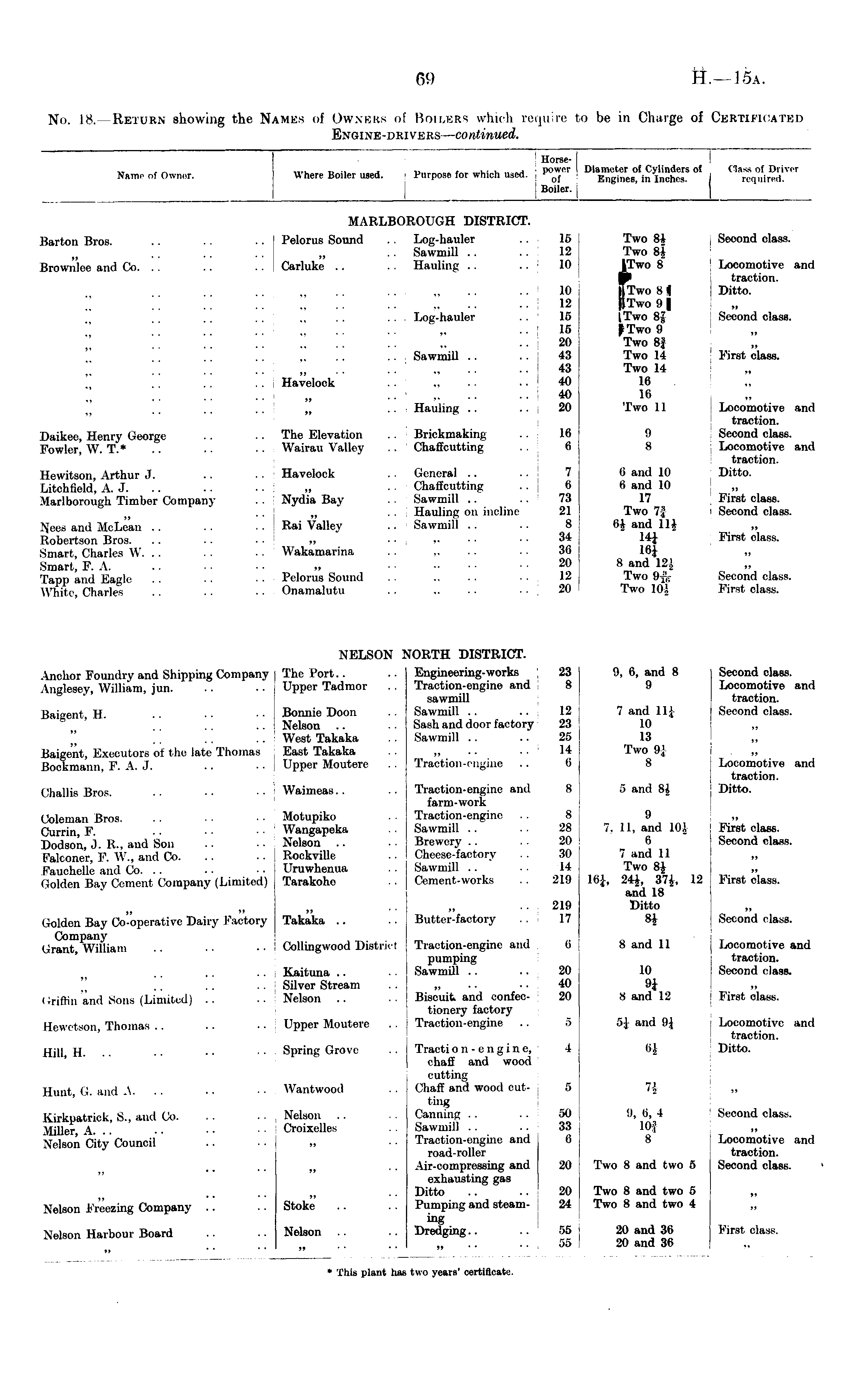 Name of Owner. Where Boiler used. Horse- .. . . . . j '■ power Diameter of Cylinders of Purpose for which used. ,„. Engines, in Inches. Boiler. | (lass of Driver required. MARYBOROUGH DISTRICT. Barton Bros. .. .. .. Pelorus Sound . . Log-hauler . . 16 . . Sawmill .. . . 12 Brownlee and Co. . . .. .. Carluke .. . . Hauling . . .. 10 Two 8i Two 8| (Two 8" Two 8 J Two 9 I (Two 81 |f Two 9 Two 8| Two 14 Two 14 16 16 Two 11 9 8 C and 10 8 and 10 17 Two 7i 6£ and 1H 14J 16i 8 and 12J Two 9* Two 10.! I Second class. Locomotive and traction. Ditto. Second class. ' First class. Locomotive and traction. Second class. Locomotive and traction. i Ditto. First class. ' Second class. First class. Second class. First class. .. 10 :: :: 12 .. Log-hauler . . 15 15 ;: :: .. » .. Sawmill .. .. 43 :: , •• ..43 .. Havelook . . „ .. .. 40 .40 „ .. Hauling .. . . 20 Daikee, Henry George . . .. The Elevation .. Brickmaking .. 16 Fowler, W. T.* .. .. .. Wairau Valley .. Chaffcutting .. 6 Hewitson, Arthur J. .. .. Havelock . . General .. 7 Litchfield, A. J. .. • • „ • ■ Chaffcutting . 6 Marlborough Timber Company . . Nydia Bay . Sawmill .. . . 73 „ . . Hauling on incline 21 N.eea and McLean .. .. . . Rai Valley .. Sawmill .. .. 8 Robertson Bros. .. .. .. » • • >• ■ • 34 Smart, Charles W. .. .. • ■ Wakamarina .. .. .. ■ • 36 Smart, P. A. .. • ■ • • ,. • ■ .... 20 Tapp and Eagle .. • • ■ • Pelorus Sound . . .. . . ■ . 12 White, Charles .. •■ ■■ Onamalutu .. .. .. ..20 NELSON NORTH DISTRICT. 9, 6, and 8 9 7 and 11J 10 13 Two 91 8 5 and >s.l Second class. Locomotive and traction. Second class. Locomotive and traction. Ditto. Anchor Foundry and Shipping Company [ The Port.. .. Engineering-works ] 23 Anglesey, William, jun. .. .. Upper Tadmor .. Traction-engine and 8 sawmill Baigent, H. .. • • • ■ Bonnie Doon . Sawmill .. .. 12 Nelson .. .. Sash and door factory 23 " ( .', .. .. West Takaka .. Sawmill .. .. 25 Baigent, Executors of the late Thomas East Takaka .. „ .. • ■ 14 Bockmann, F. A. J. .. ■ Upper Moutere .. Traction-engine .. 6 Challis Bros. .. .. •• Waimeas.. .. Traction-engine and 8 farm-work Coleman Bros. .. ■ • • ■ Motupiko .. Traction-engine . . 8 Currin, F. .. • • • • Wangapeka .. Sawmill .. . . 28 Bodson, J. K-. and Son .. ■■ Nelson .. .. Brewery.. .. 20 Falconer, F. W., and Co. .. • • Roekville .. Cheese-factory . . 30 Fauchelle and Co. .. . • • Uruwhenua .. Sawmill .. .. 14 Golden Bay Cement Company (Limited) Tarakoho .. Cement-works .. 219 9 7, 11, and 10J 6 7 and 11 Two 8J 24J, 37£, 12 and 18 Ditto 8} First class. Second class. First class. Second class. ■• 219 Golden Bay Co-operative Dairy Factory Takaka .. .. Butter-factory . . 17 Company Grant, William .. .. ■ Oollingwood District Traction-engine and 0 pumping Kaituna .. . . Sawmill .. .. 20 .. Silver Stream .. „ .. .. 40 Griffin and Sons (Limited) .. •• Nelson .. .. Biscuit and confec- 20 tionery factory Hewetson, Thomas .. .. .. Upper Moutere .. Traction-engine .. 5 8 and 11 10 9i S and 12 J Locomotive and traction. Second class. First class. Hill H. .. .. •• ■■ Spring Grove .. Traction-engine, 4 chaff and wood cutting Hunt Q and \. .. .. •• AVantwood .. Chaff and wood cut- 5 ting Kirkpatrick, 8., and Co. .. • • Nelson .. .. Canning .. .. 50 Miller, A. .. • • • • Croixelles .. Sawmill . . . . 33 Vlson City Council .. •• „ •• Traction-engine and G road-roller „ .. Air-compressing and 20 exhausting gas .. Ditto .. .. 20 Nelson Freezing Company .. .. Stoke .. .. Pumping and steam- 24 Nelson Harbour Board .. .. Nelson .. .. Dredging.. 55 .. •■ » ..55 r,\ and 0;| Locomotive and traction. Ditto. n l> !), 6, 4 10J 8 Two 8 and two 5 Seoond class. ft Locomotive and traction. Second class. Two 8 and two 5 Two 8 and two 4 20 and 36 20 and 36 First class. • This plant hue two years' certificate.