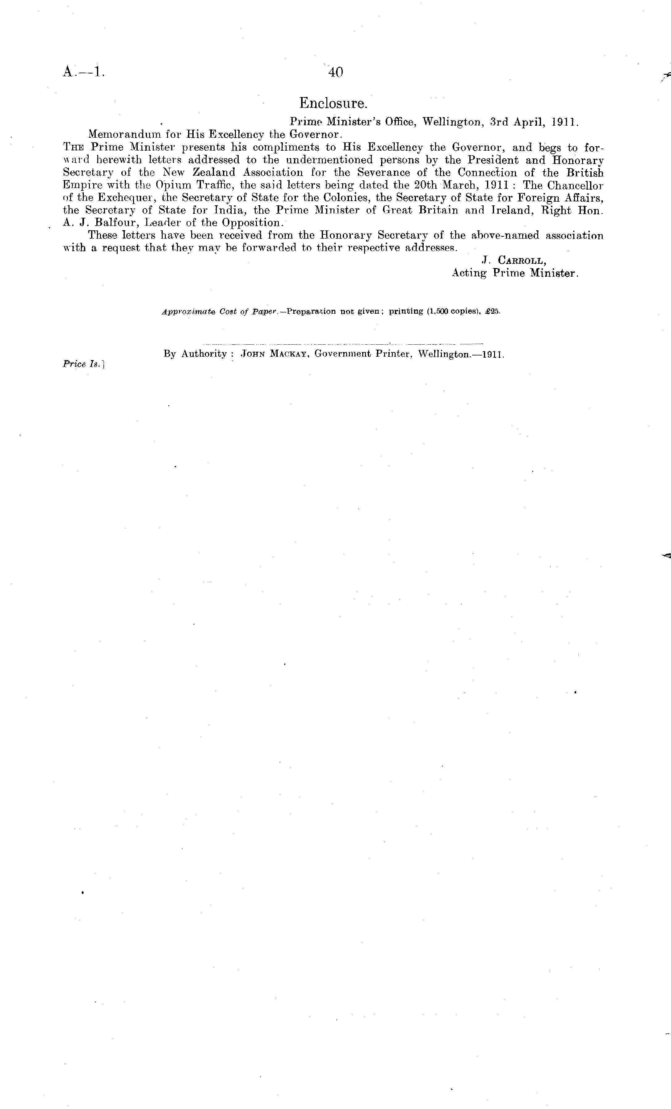 Enclosure. Prime Minister's Office, Wellington, 3rd April, 1911. Memorandum for His Excellency the Governor. The Prime Minister presents his compliments to His Excellency the Governor, and begs to forward herewith letters addressed to the undermentioned persons by the President and Honorary Secretary of the New Zealand Association for the Severance of the Connection of the British Empire with the Opium Traffic, the said letters being dated the 20th March, 1911 : The Chancellor of the Exchequer, the Secretary of State for the Colonies, the Secretary of State for Foreign Affairs, the Secretary of State for India, the Prime Minister of Great. Britain and Ireland, Right Hon. A. J. Balfour, Leader of the Opposition. These letters have been received from the Honorary Secretary of the above-named association with a request that they may be forwarded to their respective addresses. J. Carroll, Acting Prime Minister.
