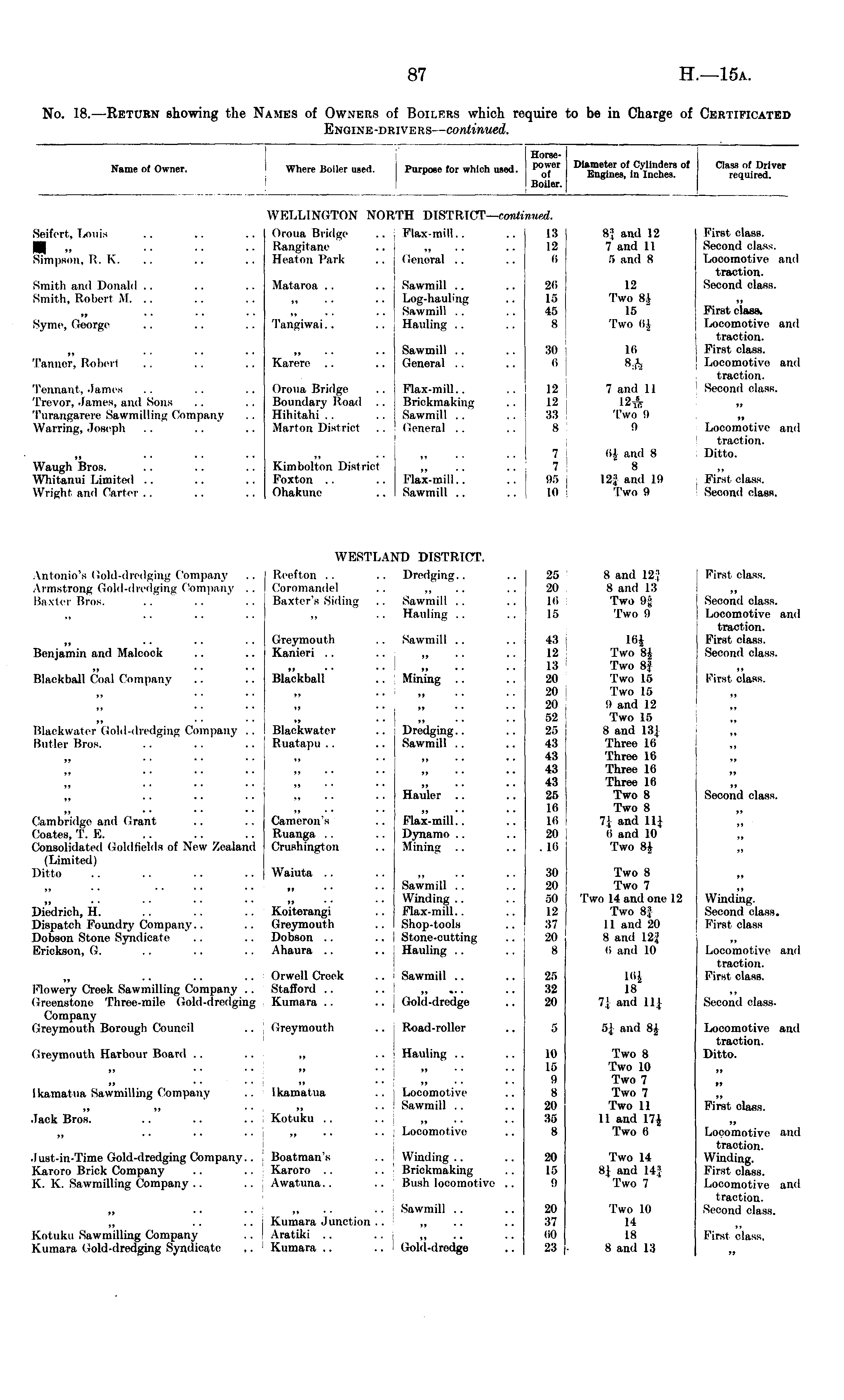 Name of Owner. Where Boiler used. Purpose for which used. Horsepower of Boiler. Diameter of Cylinders of Engines, in Inches. Class of Driver required. WELLINGTON NORTH DISTRICT— ronti; <ned. Seifert. LiOIlifl .. .. .. Oroua Bridge .. Flax-mill.. HI .. .. .. .. Rangitane .. ,, Simpson, R. K. .. .. .. Beaton Park .. General .. Smith and Donald .. .. .. Mataroa .. .. Sawmill .. Smith, Robert M. .. .. .. ,, .. .. Log-hauling „ .. .. .. ,, .. .. Sawmill .. Syme, George .. .. .. Tangiwai. i .. Hauling .. „ .. .. .. „ .. Sawmill .. Tanner, Robert .. .. .. Karere .. .. General Tennant. •liiines .. .. .. Oroua Bridge .. Flax-mill.. Trevor, James, and Sons .. .. Boundary Road .. Brickmaking Turangarere Sawmilling Company .. Hihitahi .. .. Sawmill .. Warring, Joseph .. .. .. Marton District .. Genera] .. i:s 12 f> 2(i 15 45 8 30 ii 12 12 33 8 7 7 95 10 8? ami 12 7 and 11 5 and 8 12 Two 8J 15 Two 8j Iβ 8A 7 and 11 Two 9 !) i>. 1 , and S 8 I2j and 19 Two 9 First class. Second class. Locomotive and traction. Second class. First class. Locomotive and traction. First class. Locomotive and traction. Seoond class. Locomotive and traction. Ditto. First class. Second class. Waugh Bros. .. .. .. Kimbolton District „ .. .. Whitanui Limited .. .. .. Foxton .. .. Flax-mill.. Wn'ulit and Cartel , .. .. .. Ohakune .. Sawmill .. .. ■ WKSTLAND DISTRICT. 25 20 Iβ 15 43 12 13 20 20 i 20 52 ! ■ir, 43 4:s 43 4:! 25 III Lβ 20 .10 8 and 12j 8 and L3 Two '■)'■ Two 9 16i Two 8£ Two 8f Two 15 Two 15 9 and 12 Two 15 8 and 131 Three Hi Three IB Three l(i Three 16 Two 8 Two 8 71 and II I (i and 10 Two 8£ First class. Second Blase. Locomotive and traction. First class. Second class. First class. »» ;; Second class. Antonio's Gold-dredging Company .. Ree.fton .. .. Dredging.. Armstrong Gold-dredging Company .. Coromandel .. ,, Baxter Bros. .. .. .. Baxter's Siding .. Sawmill .. „ .. Hauling .. ,, .. .. .. Greymoutli .. Sawmill Benjamin and Malcock .. .. Kanieri .. . . ,, »» • • ■ ■ »» • • ■ ■ »» • • • - I'.lackliall Goal Company .. .. Blackball .. Mining i, .. .. ., ..,,.. Blackweter Gold-dredging Company .. ! Blackwatcr .. Dredging.. Butler Bros. .. .. .. Ruatapu .. .. Sawmill .. „ .. .. .. ,, .. Hauler .. ,i • • ■ ■ * • »» • • • • »» • . Cambridge and IJrant .. .. Cameron's .. Flax-mill.. Coates, T. E. .. .. .. Ruanga .. .. Dynamo Consolidated Goldfields of New Zealand Crushington .. Mining (Limited) Ditto .. .. .. .. Waiuta .. ,, .. .. .. .. ,, .. .. Sawmill .. „ .. .. .. .. ,, .. .. Winding Diedrich, H. .. .. .. Koiterangi .. Flax-mill.. Dispatch Foundry Company.. •• Greymouth .. Shop-tools Dobaon Stone Syndicate .. .. Dobson .. .. Stone-outting Krickson, G. .. .. .. Ahaura .. .. Hauling .. 30 20 50 12 37 20 8 25 32 20 Two 8 Two 7 Two 14 and one 12 Two 8J 11 and 20 8 and 12; Ii and 10 K..J 18 7| and 11j Winding. Second class. First class Locomotive and traction. First class. Second class. „ .. .. .. Orwell Creek .. Sawmill Flowery Creek Sawmilling Company .. Stafford .. .. ,, Greenstone Three-mile Gold-dredging Kumara .. .. Gold-dredge Company Greymouth Borough Council .. Greymouth .. Road-roller Qreymouth Harbour Board .. .. „ .. Hauling .. [kamatua Sawmilling Company .. Ikamatua .. Locomotive „ „ .. „ .. Sawmill .lack Bros. .. .. . . Kotuku .. .. „ „ .. .. .. ,, .. .. Locomotive 5 10 15 9 8 20 36 8 20 15 !) 20 37 60 23 5| and 8£ Two 8 Two 10 Two 7 Two 7 Two 11 11 and IT. 1 , Two Ii Two 14 sj and 14;] Two 7 Two 10 14 IS 8 and 13 Locomotive and traction. Ditto. First class. Locomotive and traction. Winding. First class. Locomotive and traction. Second class. First class. J ust-in-Time Gold-dredging Company .. Boatman's .. Winding.. Karoro Brick Company .. . . Karoro .. .. Brickmaking K. K. Sawmilling Company .. .. Awatuna.. .. Bush locomotive .. ,, .. . . ,, . . Sawmill . . ,, .. .. j Kumara Junction .. ,, Kotuku Sawmilling Company .. Aratiki .. . . „ Kumara Gold-dredging Syndicate .. Kumara .. .. Gold-dredge