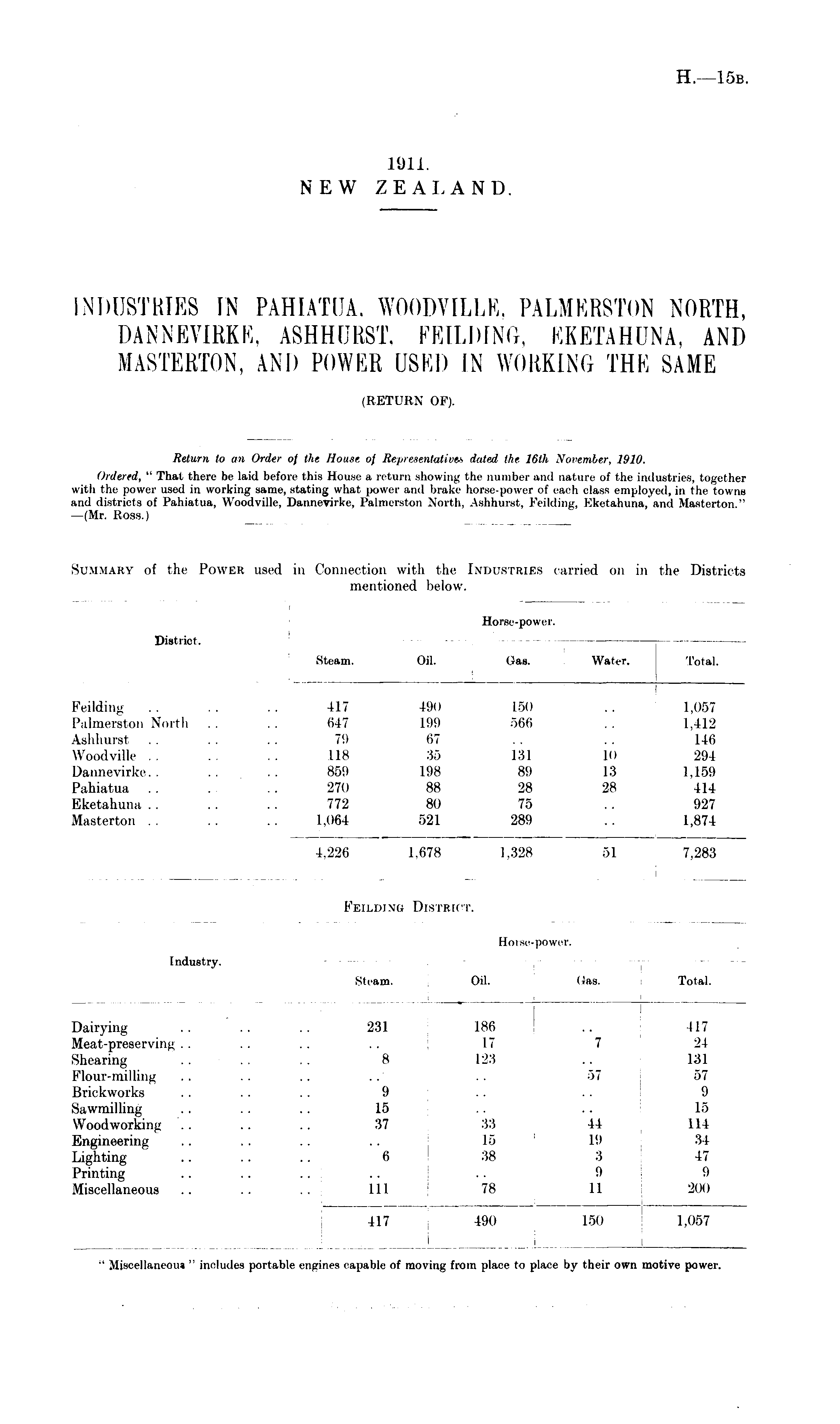 Return to an Order of the House of Representative* dated the 16th November, 1910. Ordered, " That there be laid before this House a return showing the number and nature of the industries, together with the power used in working same, stating what power and brake horse-power of each class employed, in the towns and districts of Pahiatua, Woodville, Dannevirke, Palmerston North, Ash-hurst, Feilding, Eketahuna, and Masterton." —(Mr. Ross.)