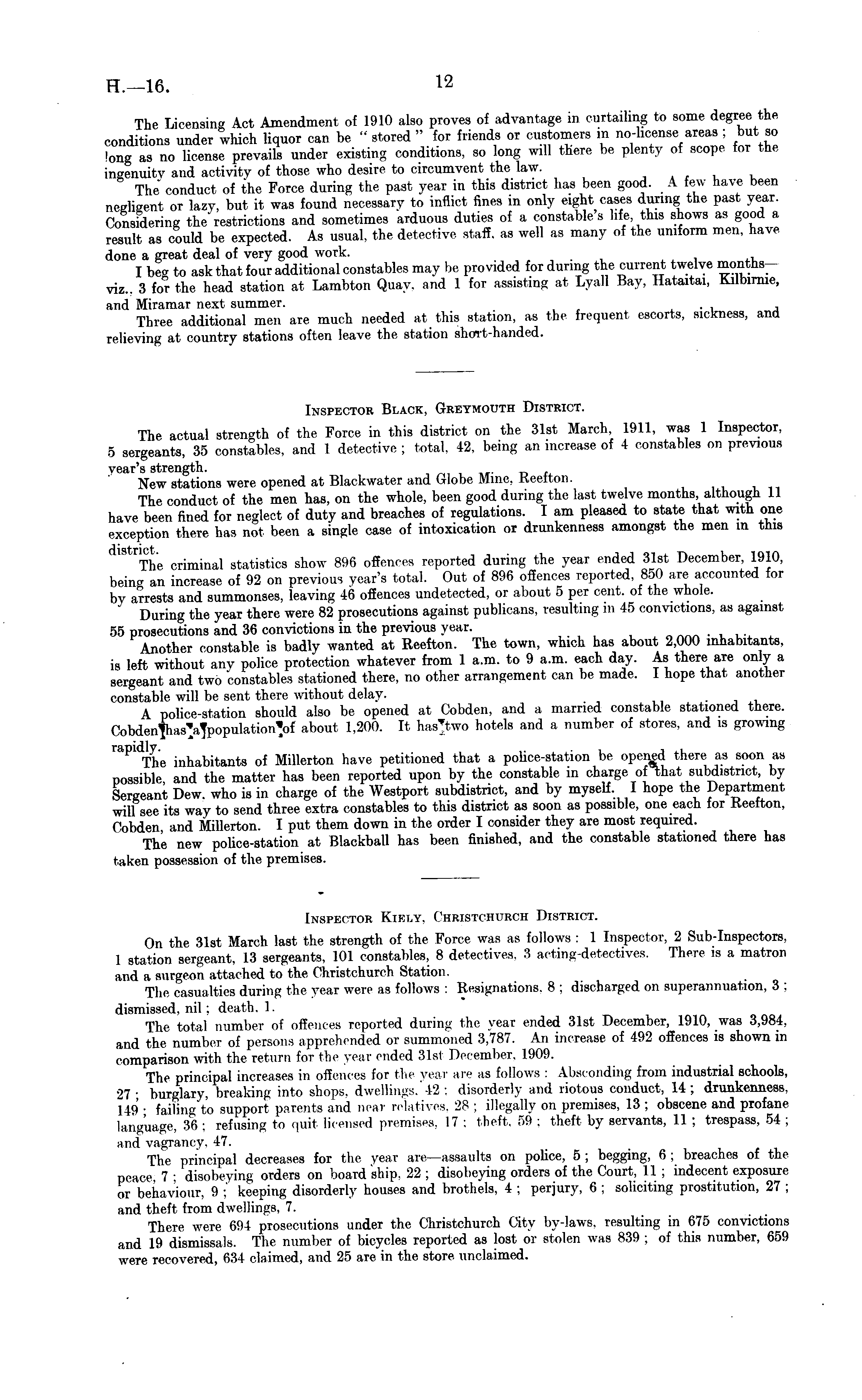 The Licensing Act Amendment of 1910 also proves of advantage to curtailing to some degree the. conditions under which liquor can be " stored " for friends or customers in no-license areas ; but so "one as no license prevails undei existing conditions, so long will there be plenty of scope foi the ingenuitx and activity of those who desire to circumvent the law. The conduct of the Force during the past year in this district lias been good. A few have been negligent or lazy, but it was found necessary to inflict fines in only eight cases during the past year. Consulerina the'restrictions and sometimes arduous duties of a constable's life this shows as good a result as could be expected. As usual, the detective etaff, as well as many of the uniform men, have done a great deal of very good work. I be* to ask that four additional constables may be, provided for during the current twelve monthsviz.. 3 for the head station at Lambton Quay, and 1 for assisting at Lyall Bay, Hataitai, Kilbinue, and Miramar next summer. . Three additional men are much needed at this station, as the frequent escorts, sickness, and relieving at country stations often leave the station short-handed.