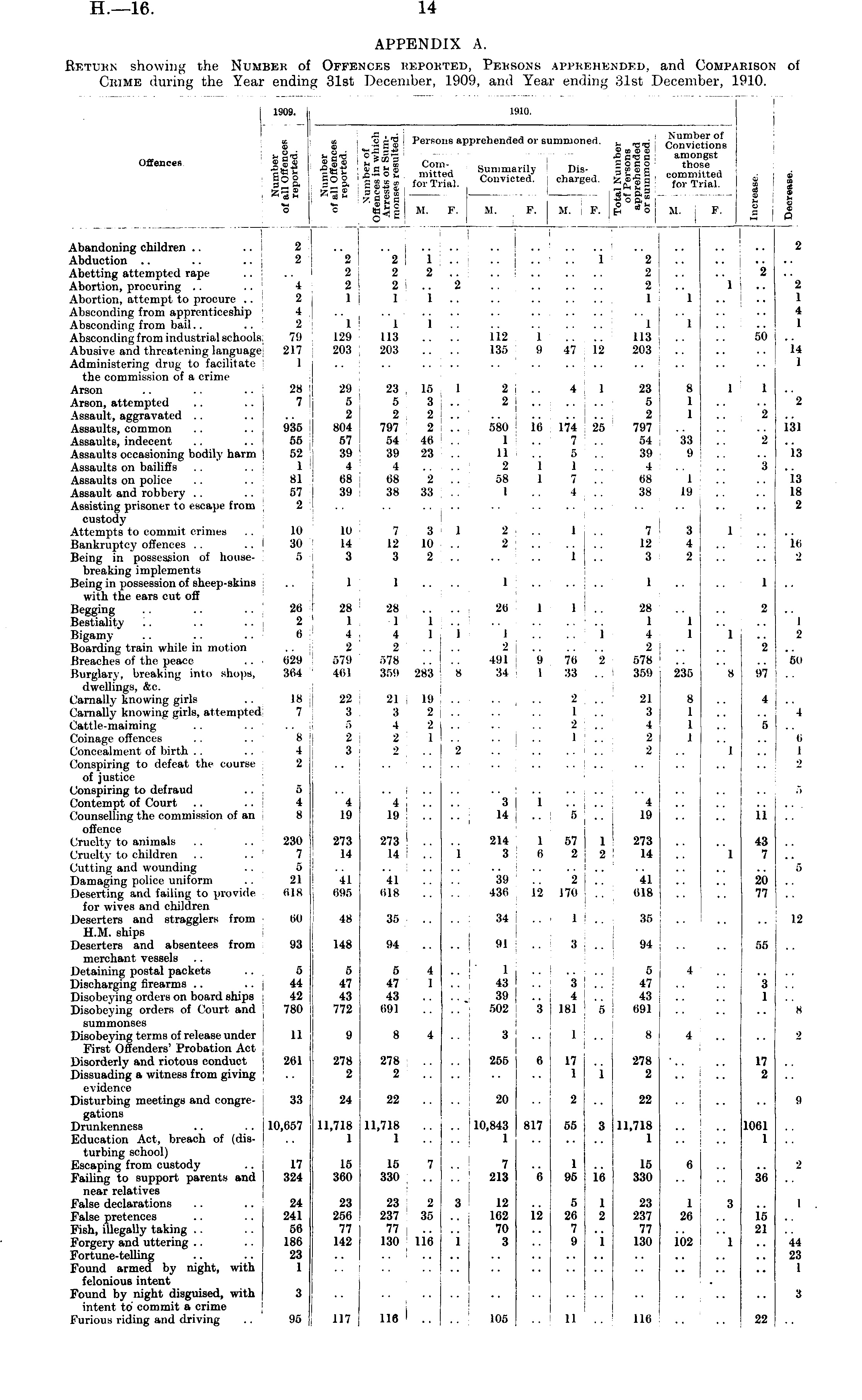 APPENDIX A. Return showing the Number of Offences reported, Persons apprehended, and Comparison of Crime during the Year ending 31st December, 1909, and Year ending 31st December, 1910.
