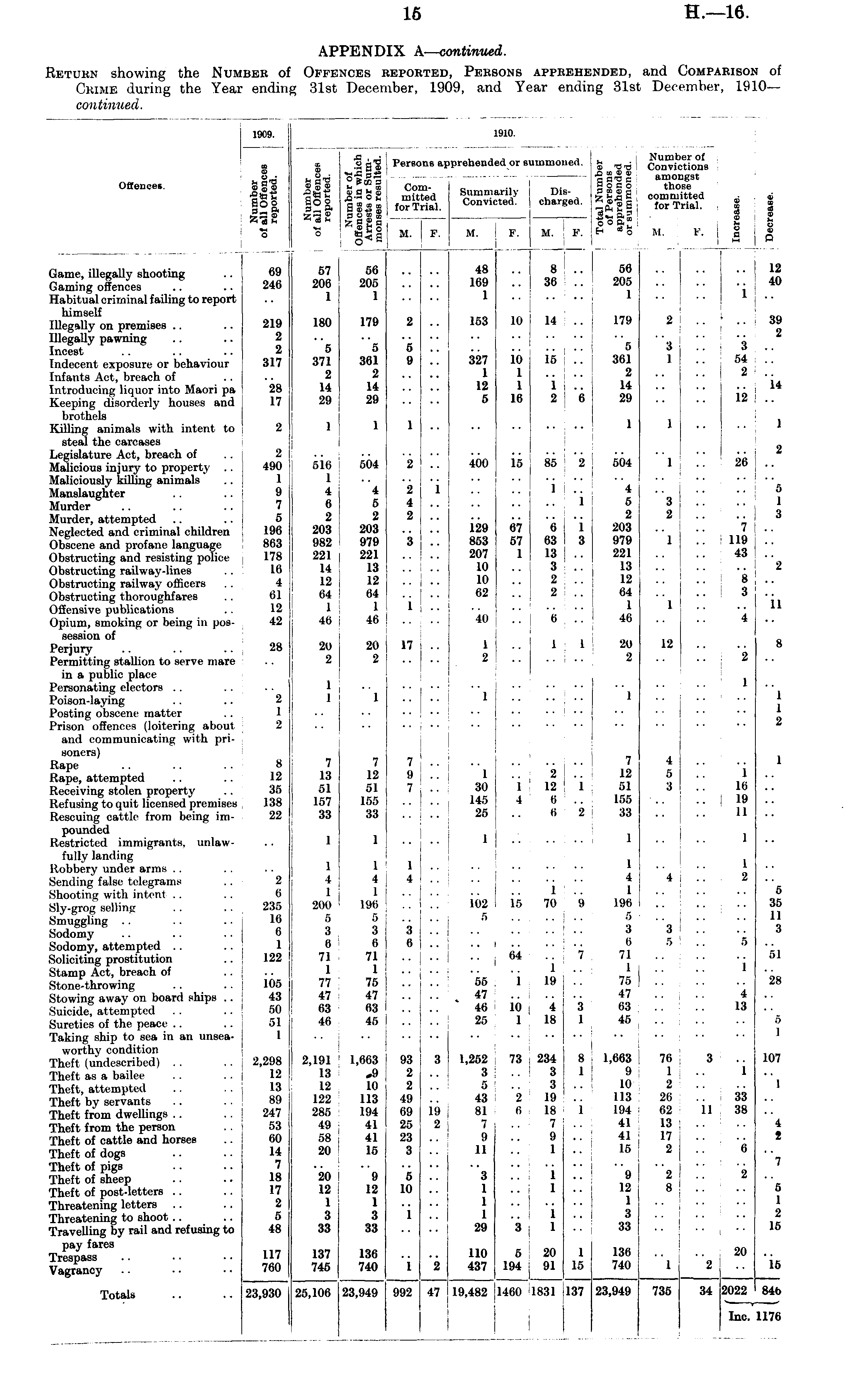 APPENDIX A—continued. Return showing the Number of Offences reported, Persons apprehended, and Comparison of Crime during the Year ending 31st December, 1909, and Year ending 31st December, 1910— continued.