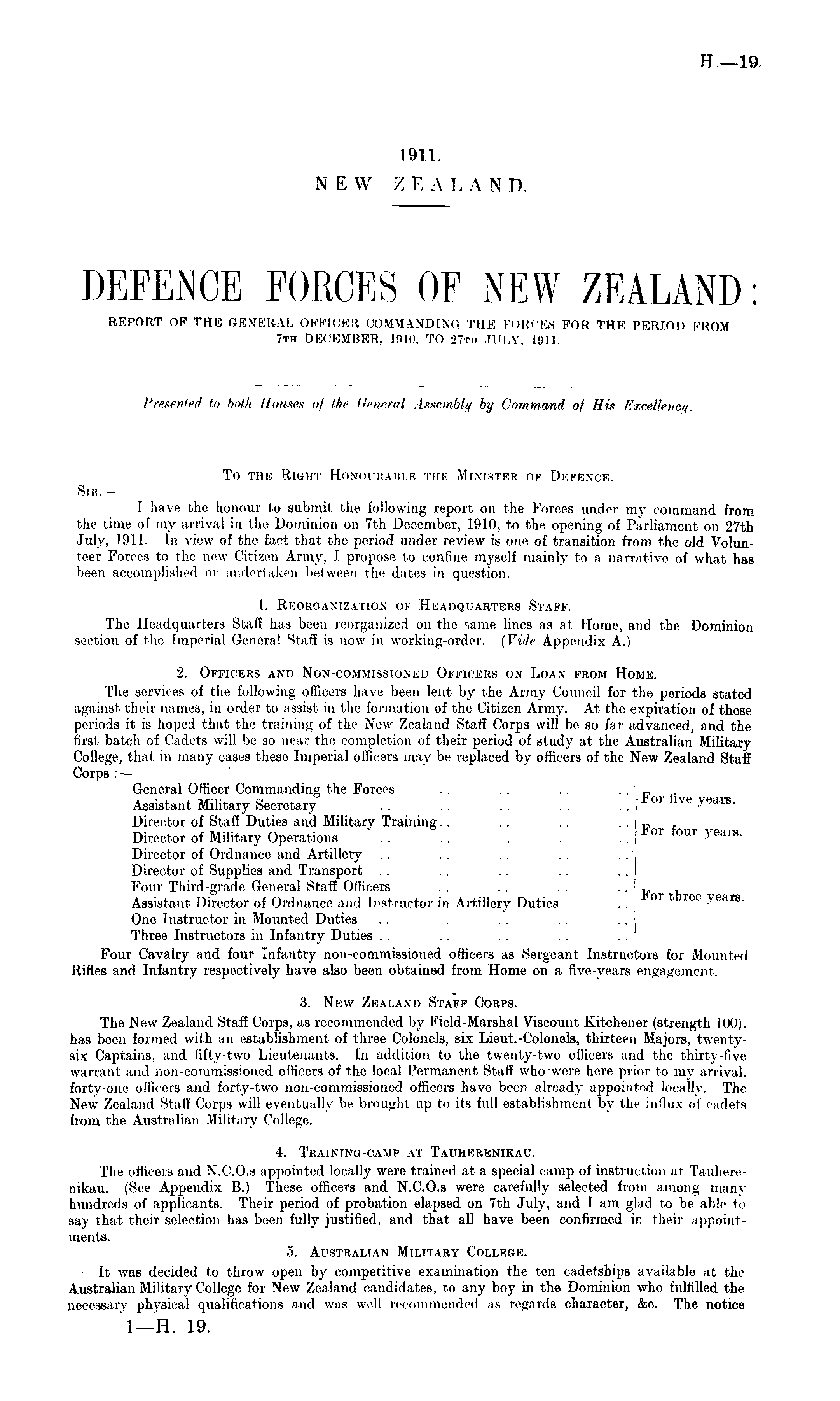 DEFENCE FORCES OF NEW ZEALAND: REPORT OF THE GENERAL OFFICER COMMANDING THE FORCES FOR THE PERIOD FROM 7th DECEMBER, 1910, TO 27th JULY, 1911.