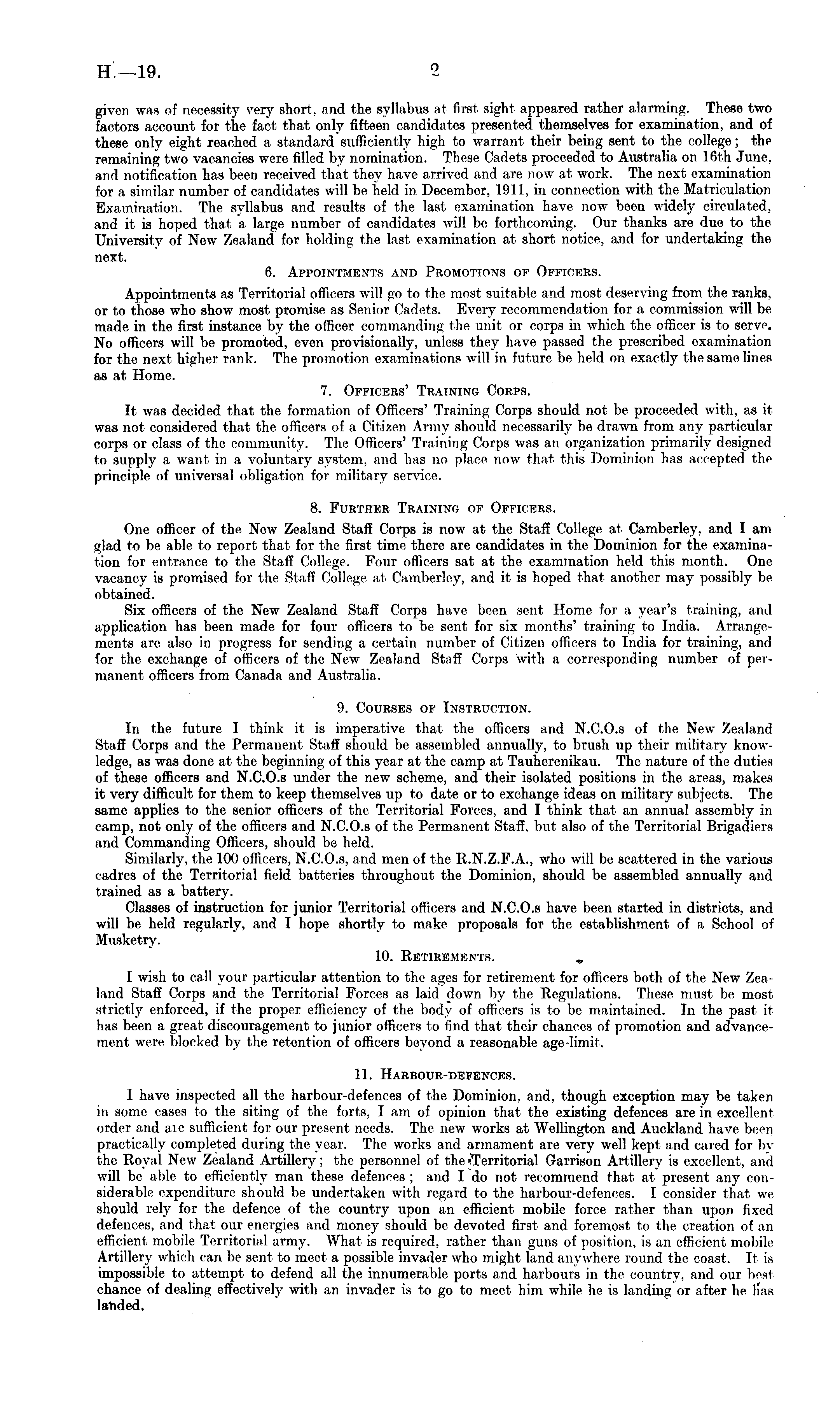 given was of necessity very short, and the syllabus at first sight appeared rather alarming. These two factors account for the fact that only fifteen candidates presented themselves for examination, and of these only eight reached a standard sufficiently high to warrant their being sent to the college; the remaining two vacancies were filled by nomination. These Cadets proceeded to Australia on 16th June, and notification has been received that they have arrived and are now at work. The next examination for a similar number of candidates will be held in December, 1911, in connection with the Matriculation Examination. The syllabus and results of the last examination have now been widely circulated, and it is hoped that a large number of candidates will be forthcoming. Our thanks are due to the University of New Zealand for holding the last examination at short notice, and for undertaking the next. 6. Appointments and Promotions of Officers. Appointments as Territorial officers will go to the most suitable and most deserving from the ranks. or to those who show most promise as Senior Cadets. Every recommendation for a commission will be made in the first instance by the officer commanding the unit or corps in which the officer is to serve. No officers will be promoted, even provisionally, unless they have passed the prescribed examination for the next higher rank. The promotion examinations will in future be held on exactly the same lines as at Home. 7. Officers' Training Corps. It was decided that the formation of Officers' Training Corps should not be proceeded with, as it was not considered that the officers of a Citizen Army should necessarily be drawn from any particular corps or class of the community. The Officers' Training Corps was an organization primarily designed to supply a want in a voluntary system, and has no place now that this Dominion has accepted the principle of universal obligation for military sendee. 8. Further Training of Officers. One officer of the New Zealand Staff Corps is now at the Staff College at Camberley, and I am glad to be able to report that for the first time there are candidates in the Dominion for the examination for entrance to the Staff College. Four officers sat at the examination held this month. One vacancy is promised for the Staff College at Camberley, and it is hoped that another may possibly be obtained. Six officers of the New Zealand Staff Corps have been sent Home for a year's training, and application has been made for four officers to be sent for six months' training to India. Arrangements arc also in progress for sending a certain number of Citizen officers to India for training, and for the exchange of officers of the New Zealand Staff Corps with a corresponding number of permanent officers from Canada and Australia. 9. Courses of Instruction. In the future I think it is imperative that the officers and N.C.O.s of the New Zealand Staff Corps and the Permanent Staff should be assembled annually, to brush up their military knowledge, as was done at the beginning of this year at the camp at Tauherenikau. The nature of the duties of these officers and N.C.O.s under the new scheme, and their isolated positions in the areas, makes it very difficult for them to keep themselves up to date or to exchange ideas on military subjects. The same applies to the senior officers of the Territorial Forces, and I think that an annual assembly in camp, not only of the officers and N.C.O.s of the Permanent Staff, but also of the Territorial Brigadiers and Commanding Officers, should be held. Similarly, the 100 officers, N.C.O.s, and men of the R.N.Z.F.A., who will be scattered in the various cadres of the Territorial field batteries throughout the Dominion, should be assembled annually and trained as a battery. Classes of instruction for junior Territorial officers and N.C.O.s have been started in districts, and will be held regularly, and I hope shortly to make proposals for the establishment of a School of Musketry. 10. Retirements. „ I wish to call your particular attention to the ages for retirement for officers both of the New Zealand Staff Corps and the Territorial Forces as laid down by the Regulations. These must be most strictly enforced, if the proper efficiency of the body of officers is to be maintained. In the past it has been a great discouragement to junior officers to find that their chances of promotion and advancement were blocked by the retention of officers beyond a reasonable age-limit. 11. Harbour-defences. I have inspected all the harbour-defences of the Dominion, and, though exception may be taken in some cases to the siting of the forts, I am of opinion that the existing defences are in excellent order and aie sufficient for our present needs. The new works at Wellington and Auckland have been practically completed during the year. The works and armament are very well kept and cared for by the Royal New Zealand Artillery; the personnel of the 'Territorial Garrison Artillery is excellent, and will be able to efficiently man these defences ; and I do not recommend that at present any considerable expenditure should be undertaken with regard to the harbour-defences. I consider that we should rely for the defence of the country upon an efficient mobile force rather than upon fixed defences, and that our energies and money should be devoted first and foremost to the creation of an efficient mobile Territorial army. What is required, rather than guns of position, is an efficient mobile Artillery which can be sent to meet a possible invader who might land anywhere round the coast. It is impossible to attempt to defend all the innumerable ports and harbours in the country, and our besi chance of dealing effectively with an invader is to go to meet him while he is landing or after he has landed.